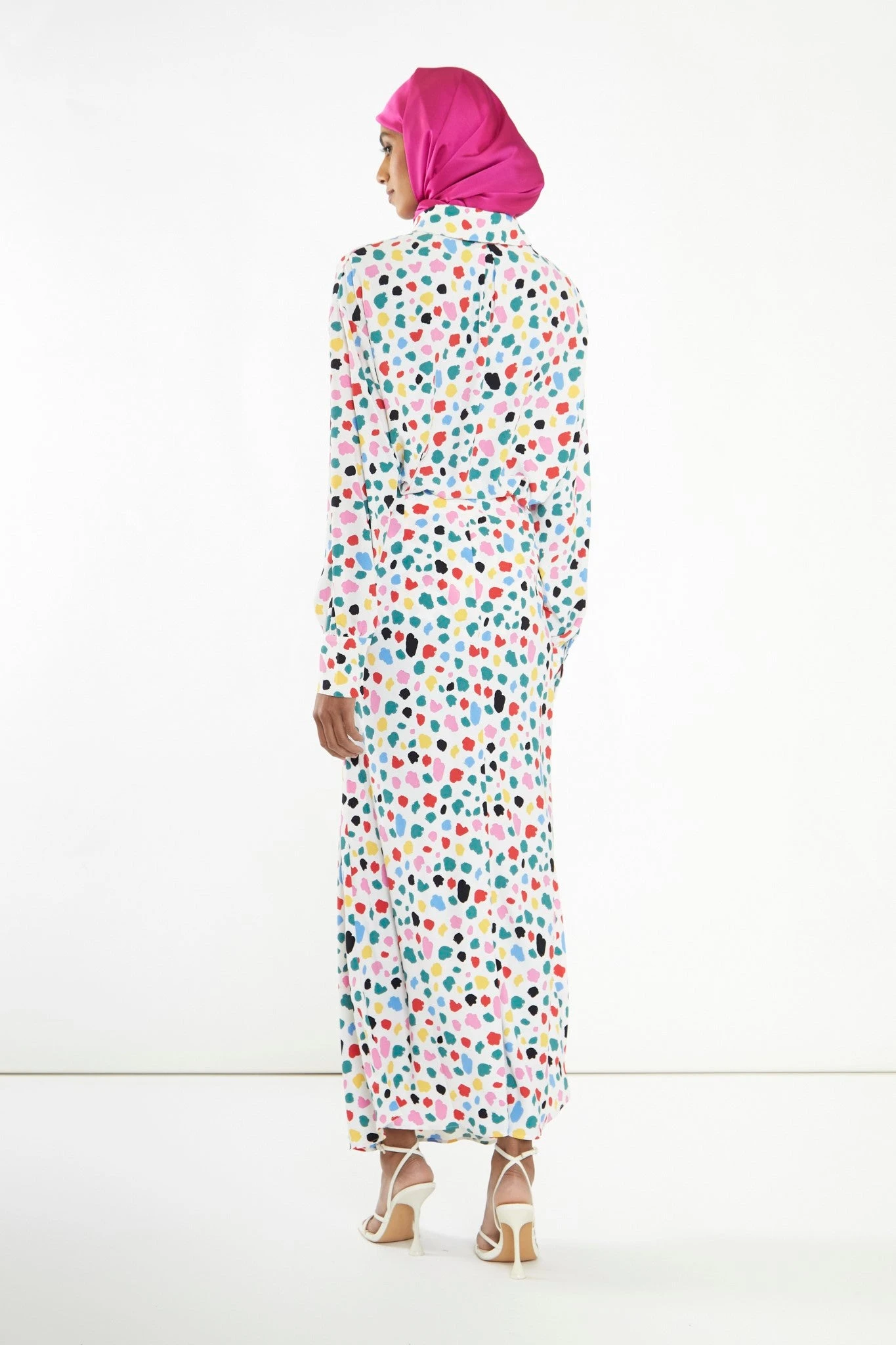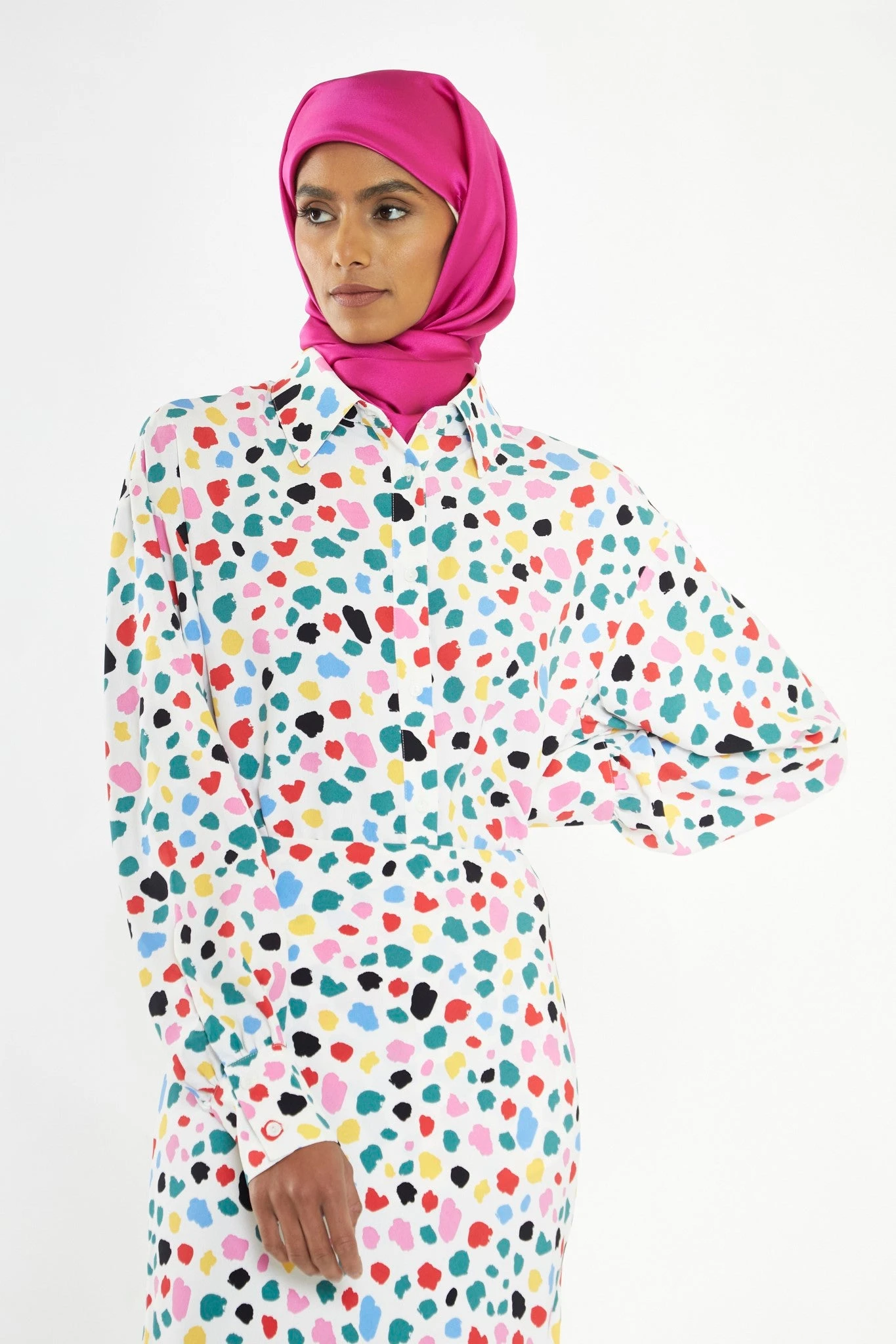 But what really sets our Glamorous Modesty Abstract Spot Print Long Sleeve Shirt apart is its exceptional comfort. Designed to be soft and lightweight, this shirt feels like a second skin, making it the perfect choice for anyone who values comfort above all else.