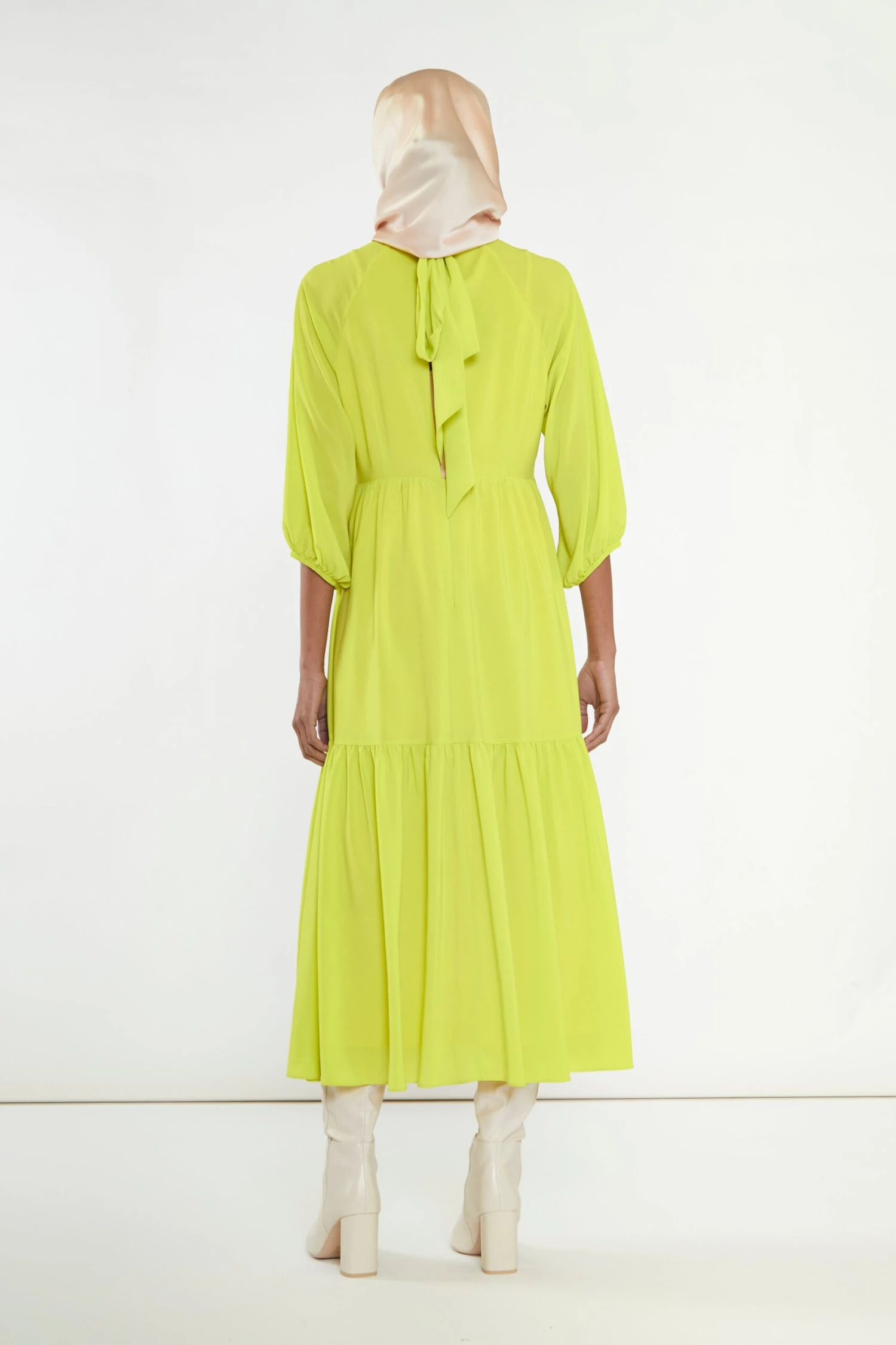 Featuring a stunning acid-yellow colour and a tiered design, this midi-dress is both stylish and elegant. The open back detail adds a touch of sensuality to the overall look, making it perfect for any occasion.