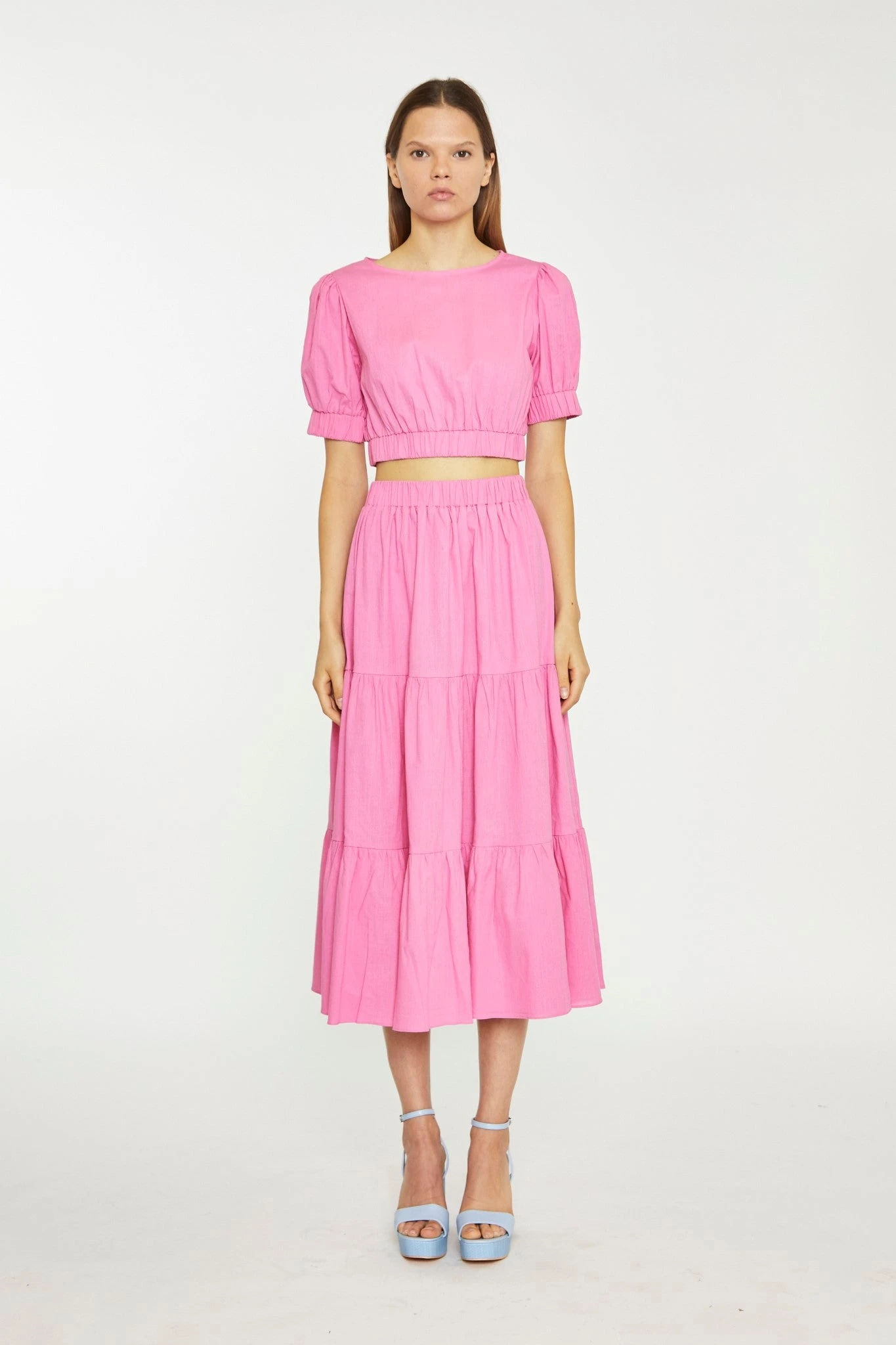 Featuring a beautiful Azalea pink colour and puff sleeves, this crop-top is both trendy and unique. The fitted silhouette and crop length provide a flattering fit while the back zip closure adds a touch of sophistication and style.