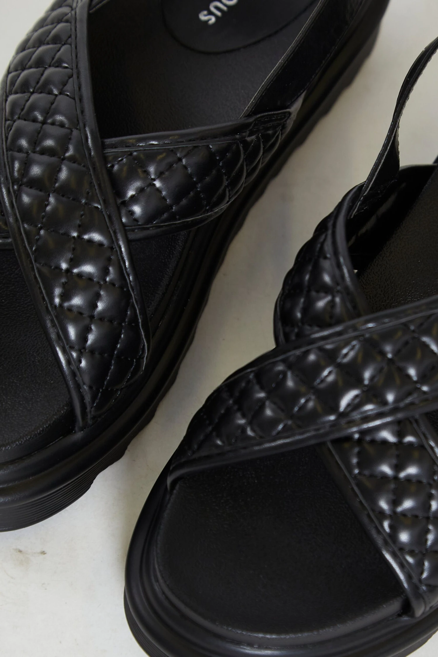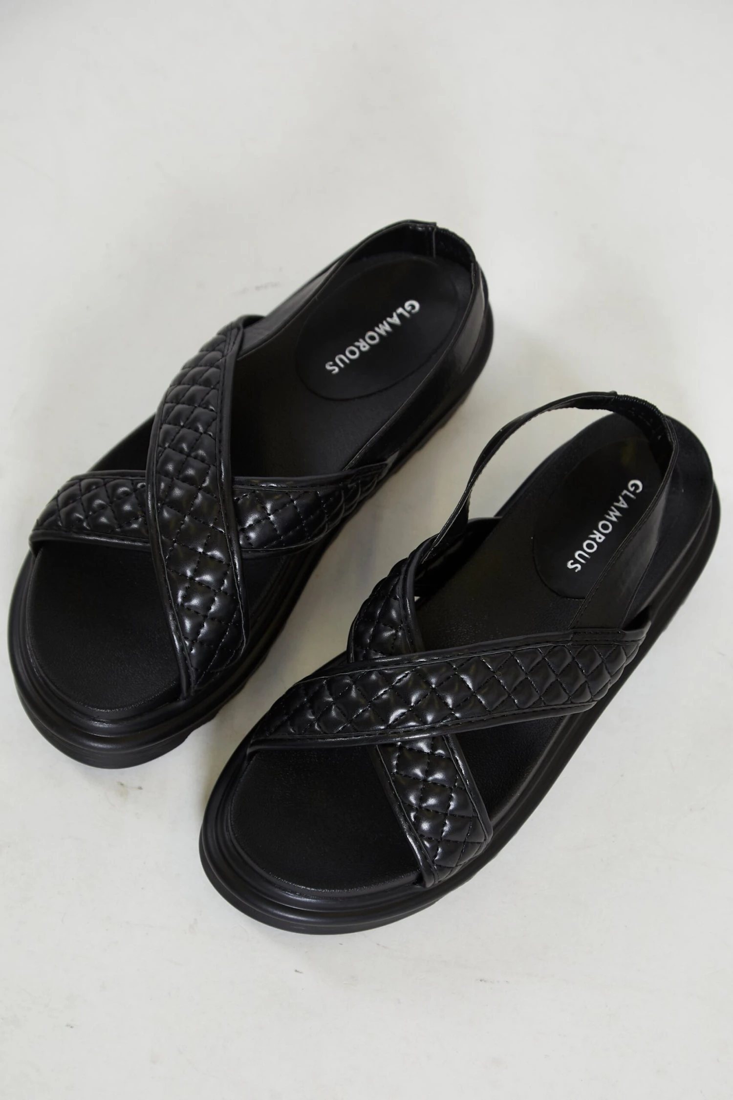 Glamorous Black Cross Strap Flatform Sandals. A must have for every holiday collection, these sandals will go with everything in your wardrobe. Featuring an on-trend quilted cross strap design with a flatform sole, these cute and comfy sandals will be your go to for every occasion. Looks great teamed with shorts and a cute top for a relaxed daytime look!