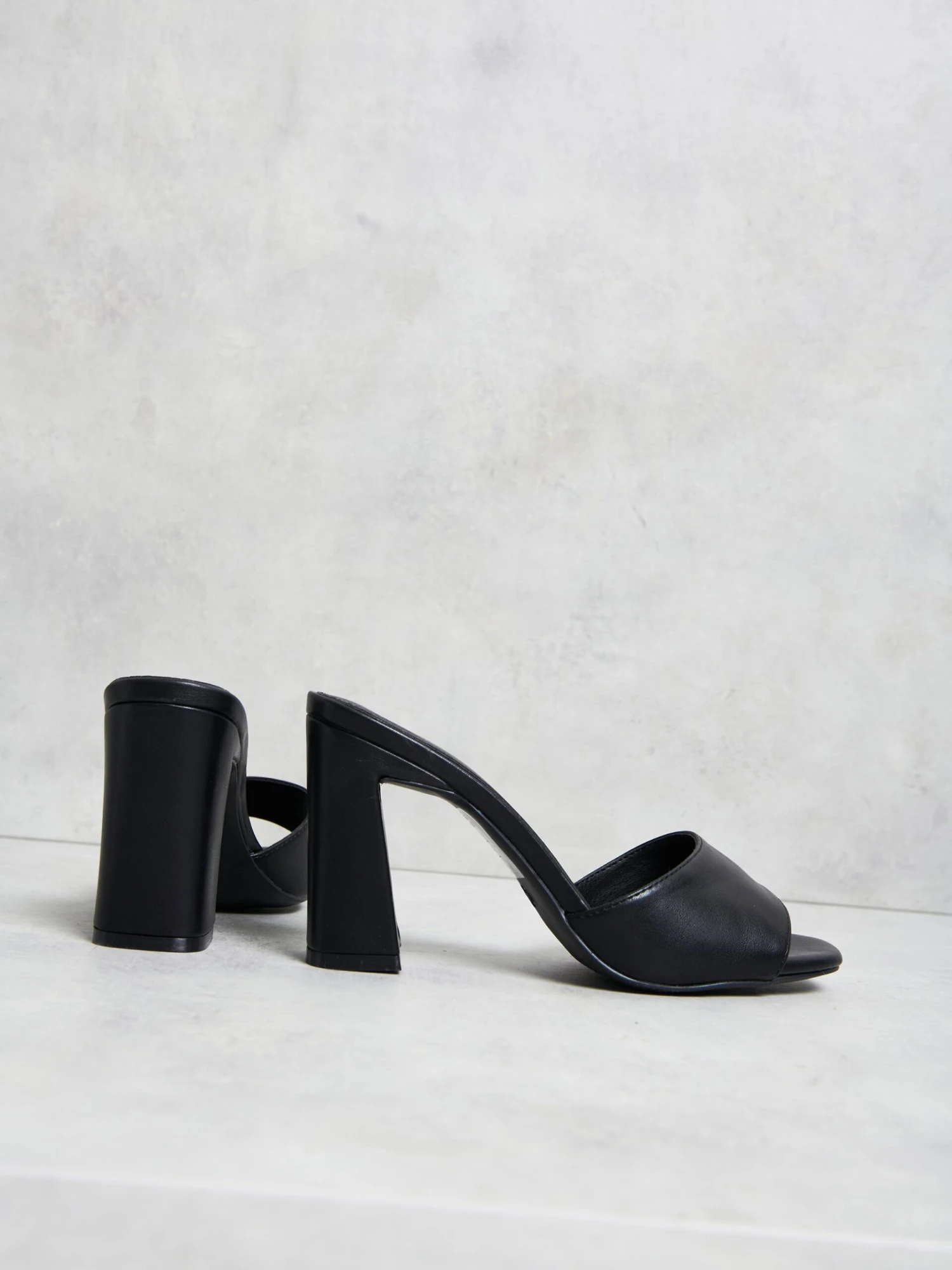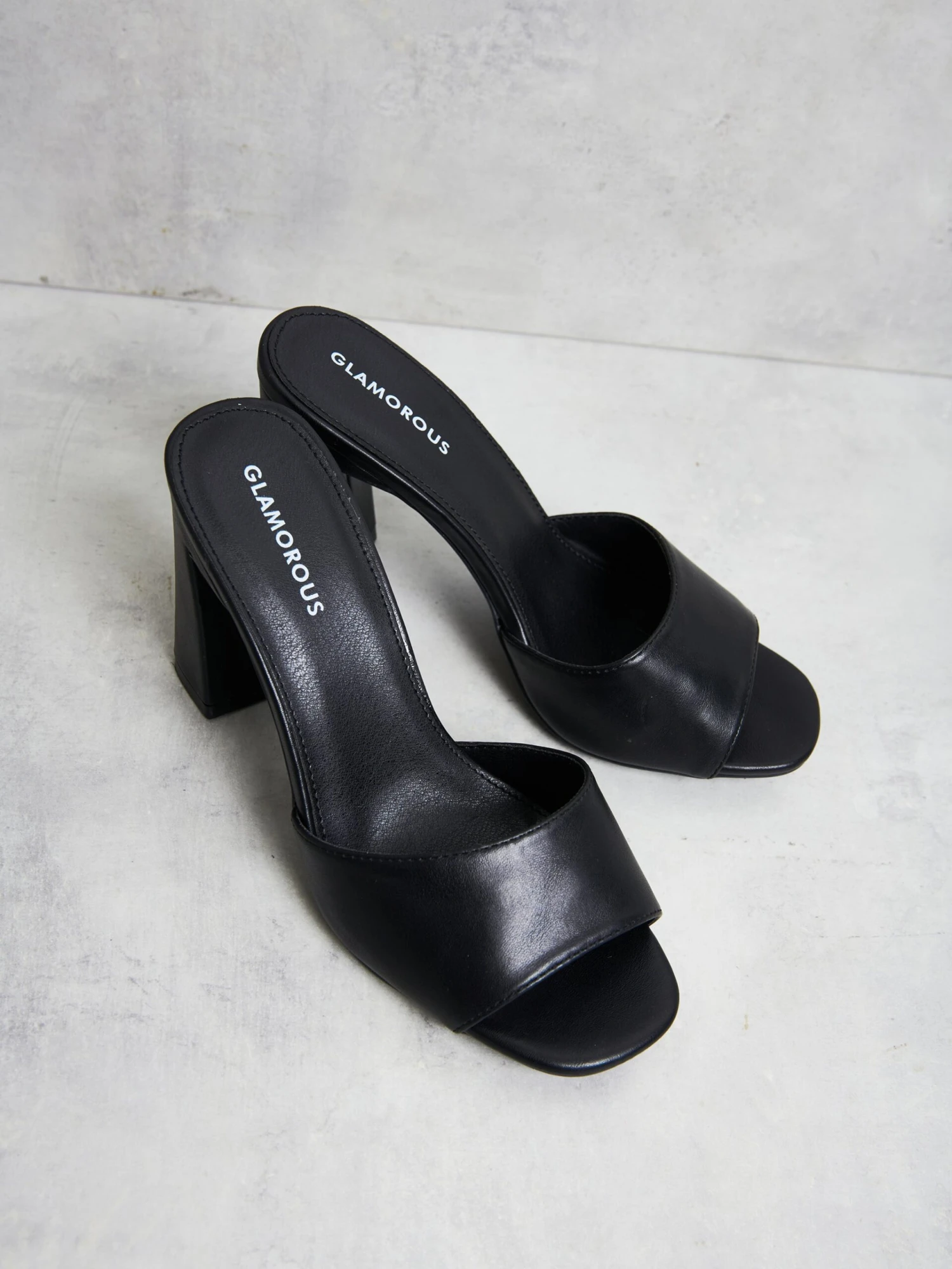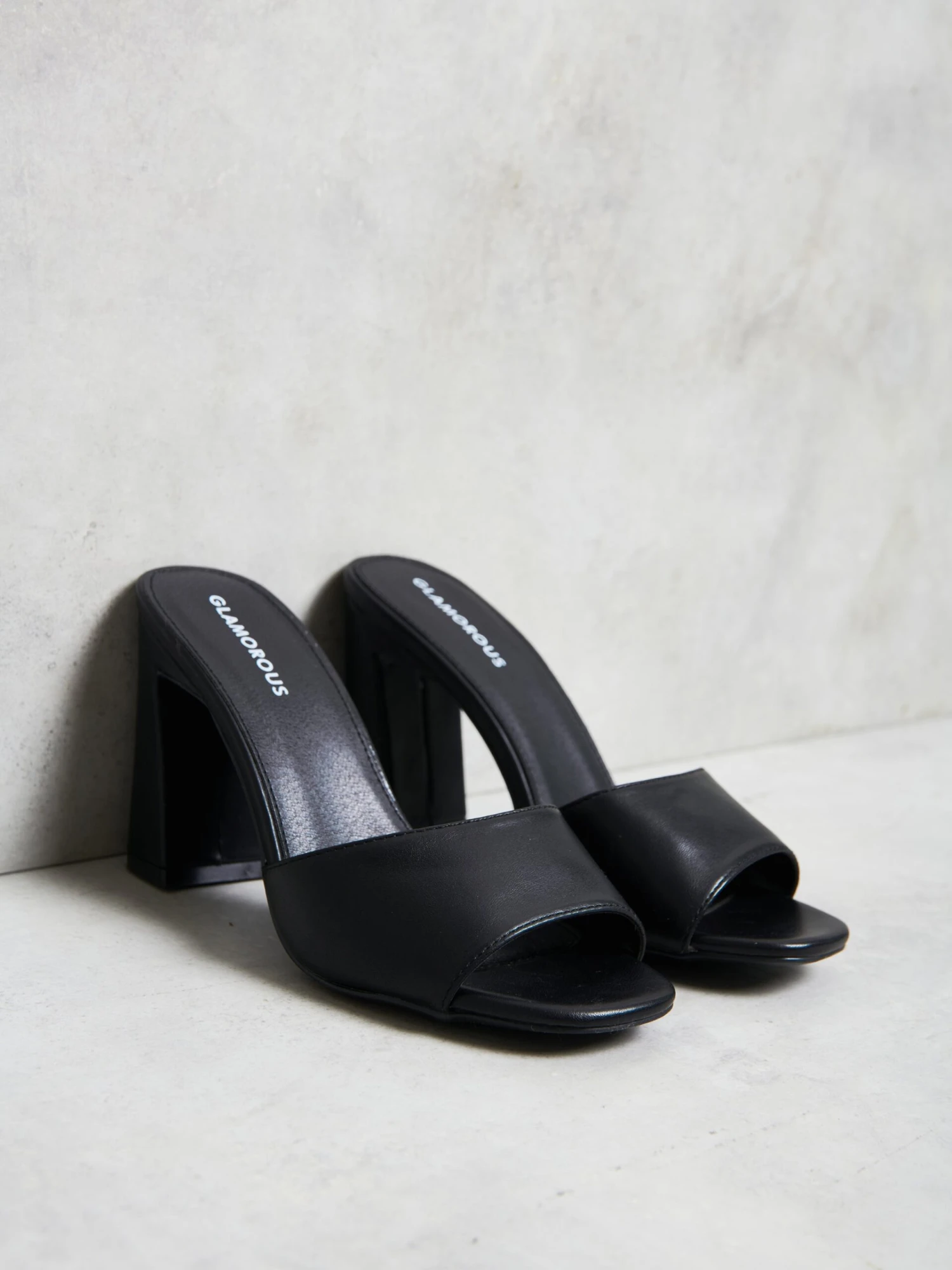 Glamorous Womens Black Faux Leather Block Heels. These heels will elevate your wardrobe this Autumn season. Featuring a block heel and strappy fit, these will look great on you! Style with a satin midi dress for an elevated evening look this season.