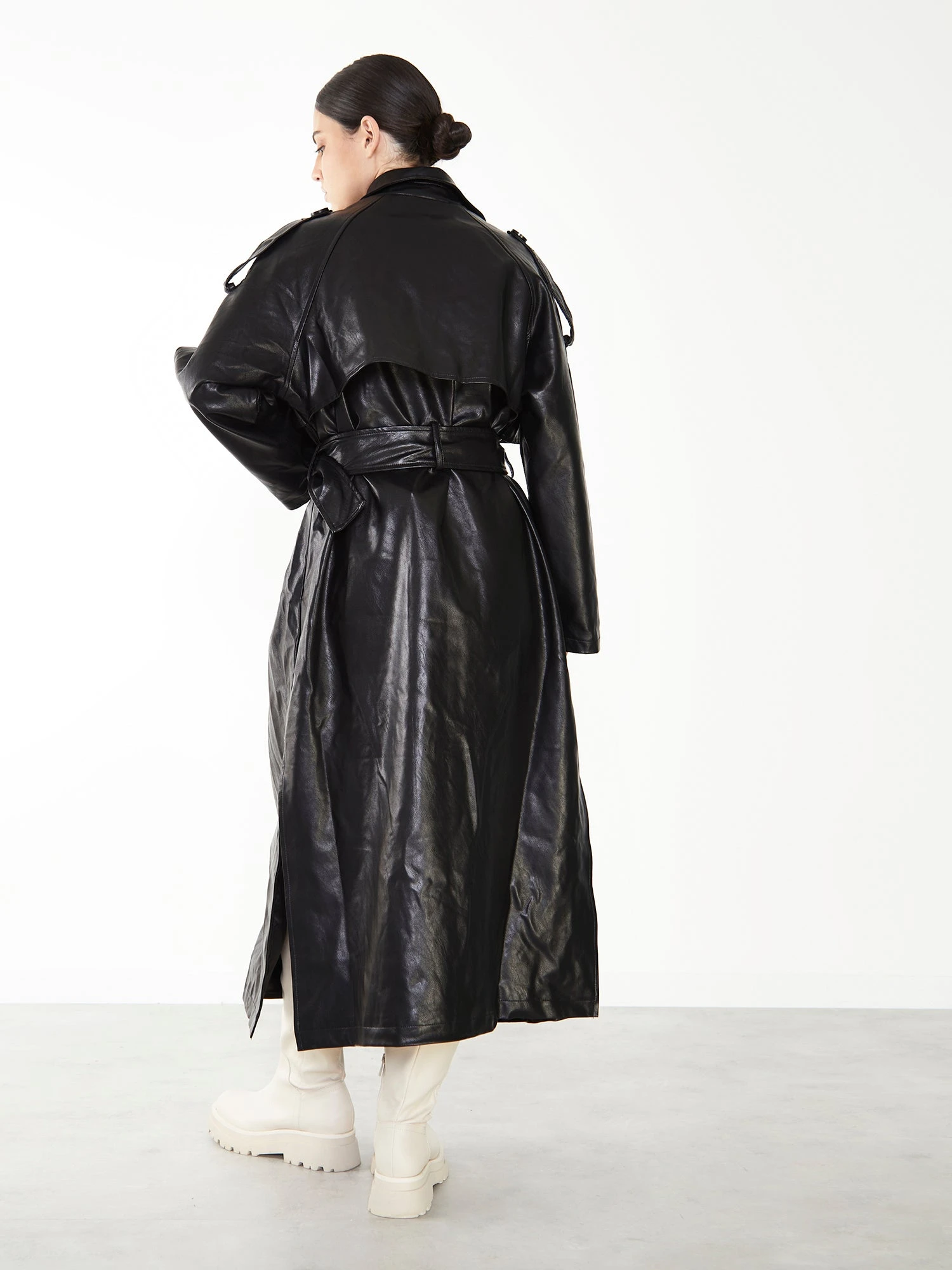 Glamorous Womens Black Leather Longline Trench Coat. Stay chic this season and layer up with this longline black trench coat. Timeless and super versatile, this coat will always look effortless and elegant. Featuring a longline fit with belted detail and a button up front, this jacket wont fail to impress! Pair with a white strappy dress and some heels for an elevated evening look.
