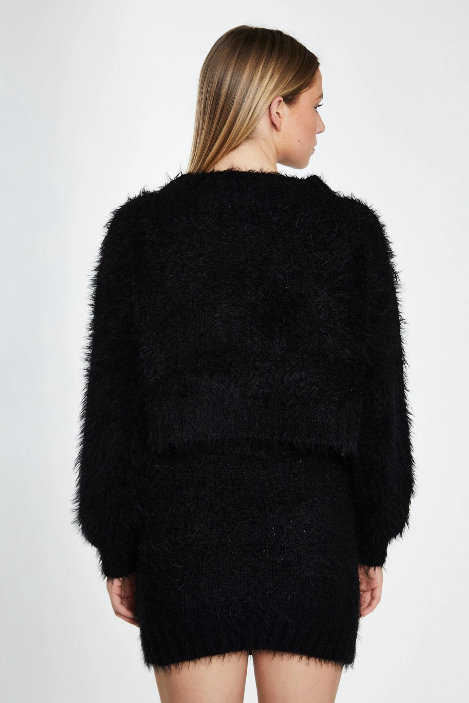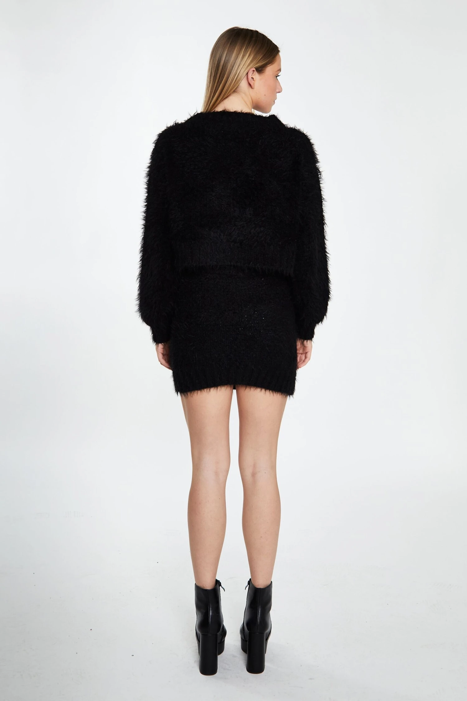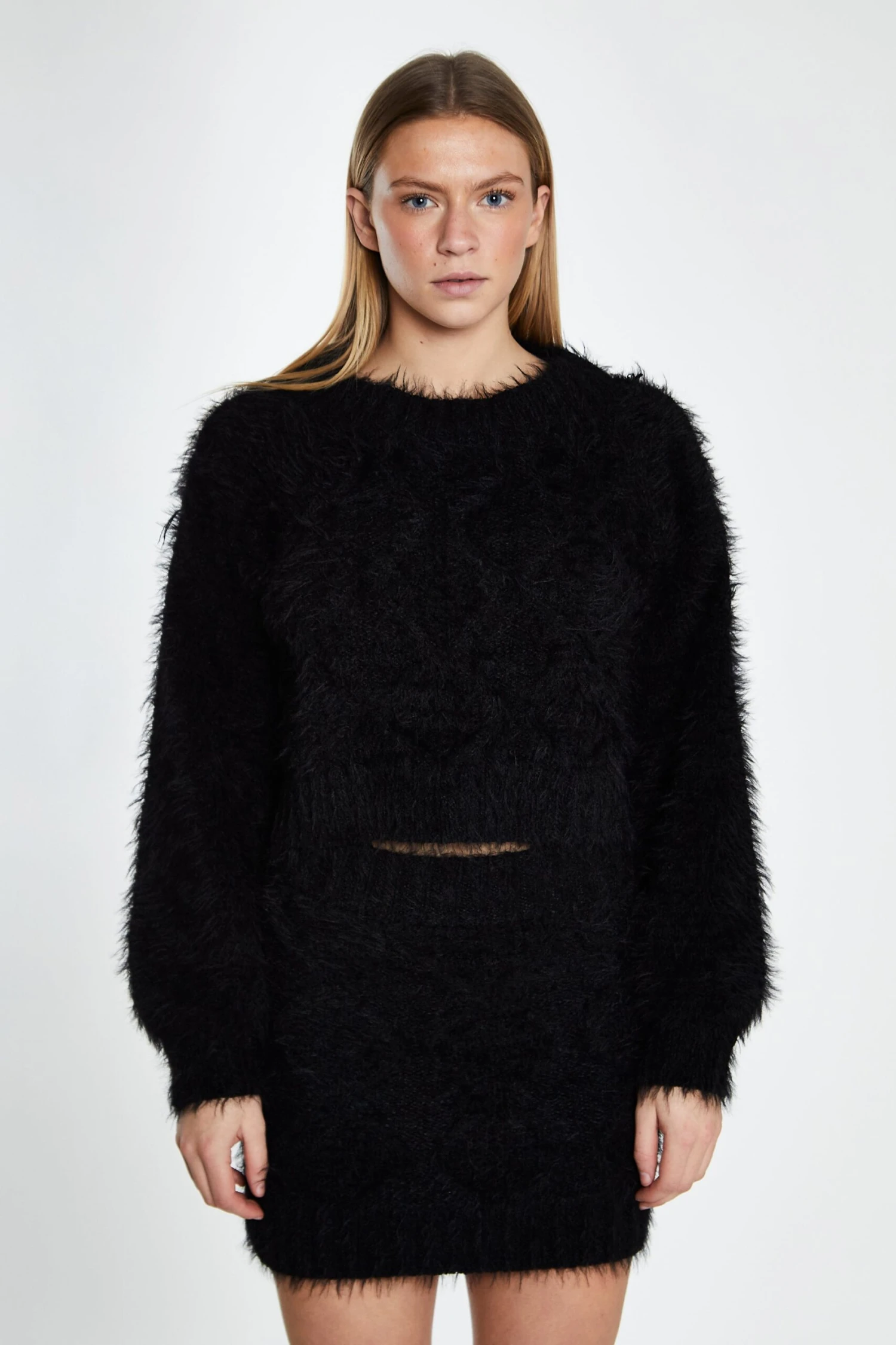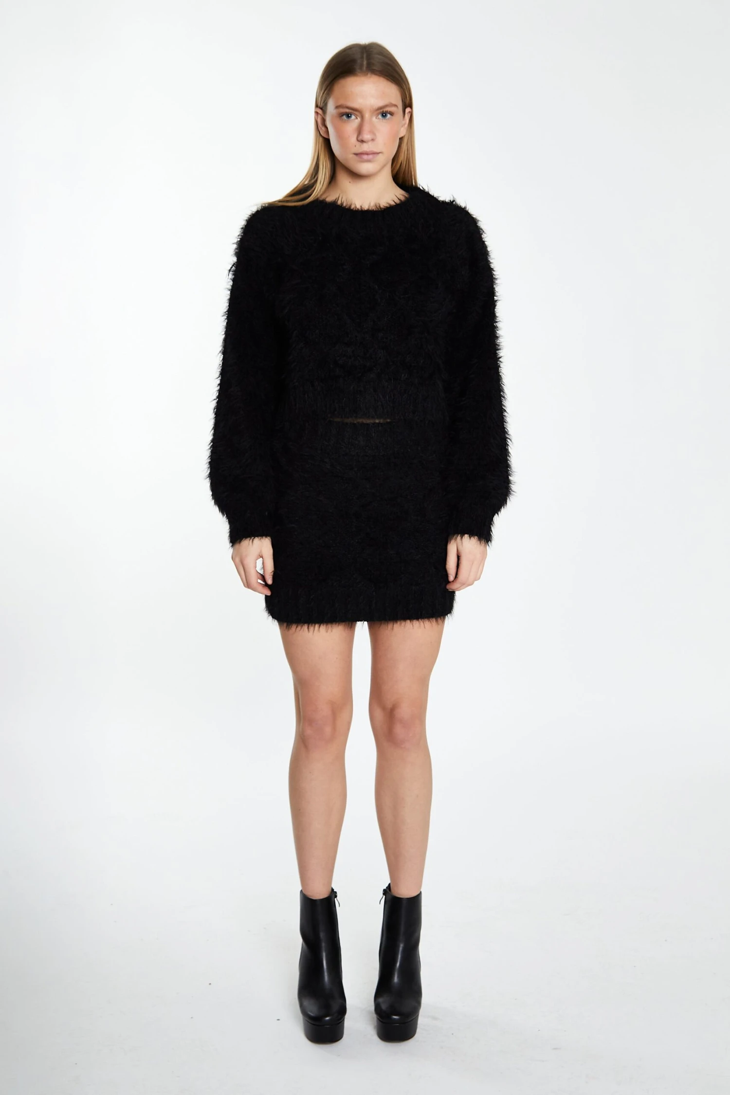 Glamorous Black Knit Long Sleeve Jumper. This cosy jumper is sure to elevate your Winter wardrobe. Featuring a flattering fit with long sleeves in a cable knit style, this jumper is perfect for you! Team with our matching co-ord mini skirt for an effortless, yet on-trend look this season.Â