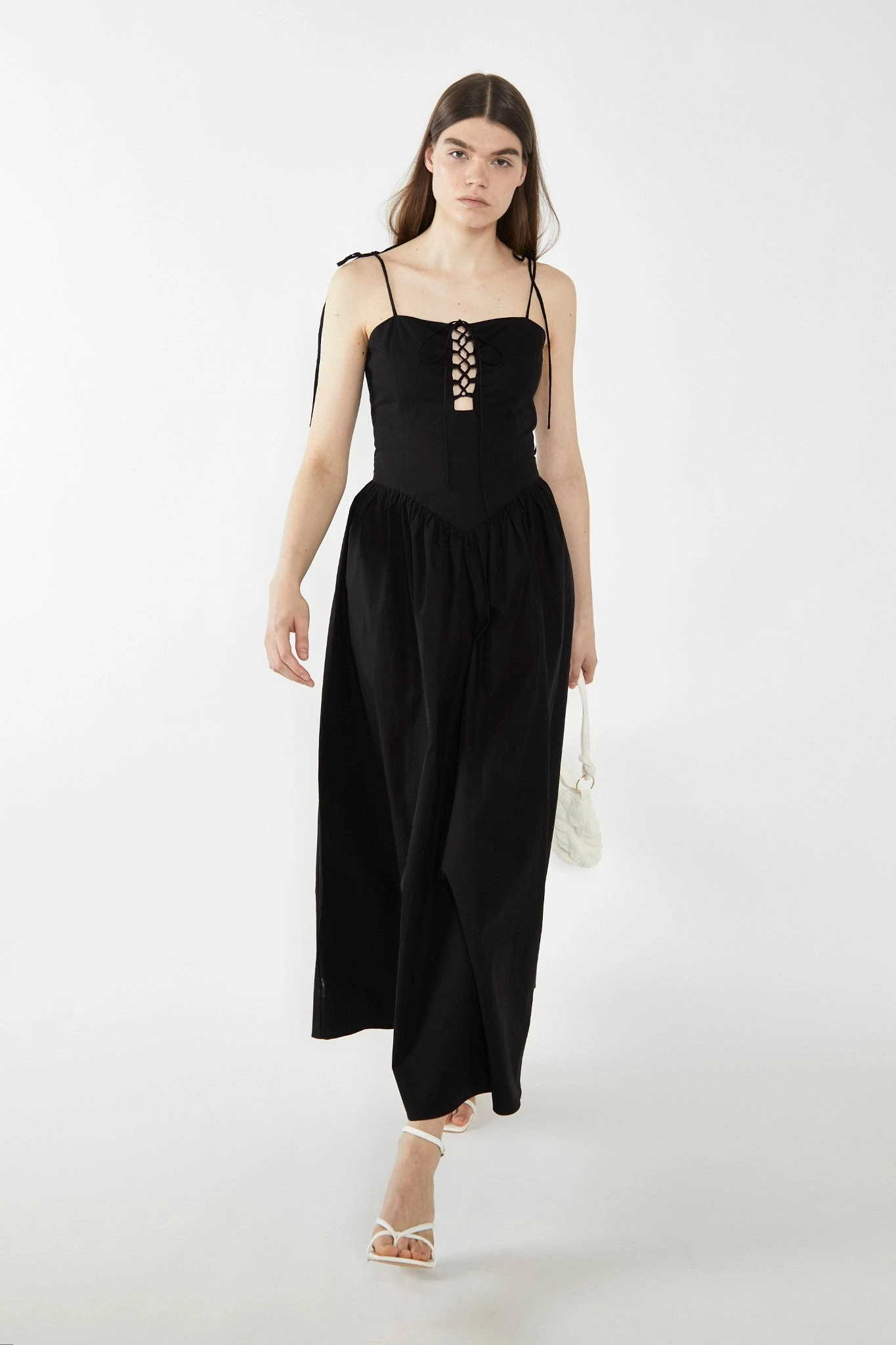 Featuring a stunning black colour and a lace-up bodice, this maxi dress is both elegant and alluring. The flowy silhouette and maxi length provide a flattering fit while the back zip closure adds a touch of sophistication and style.