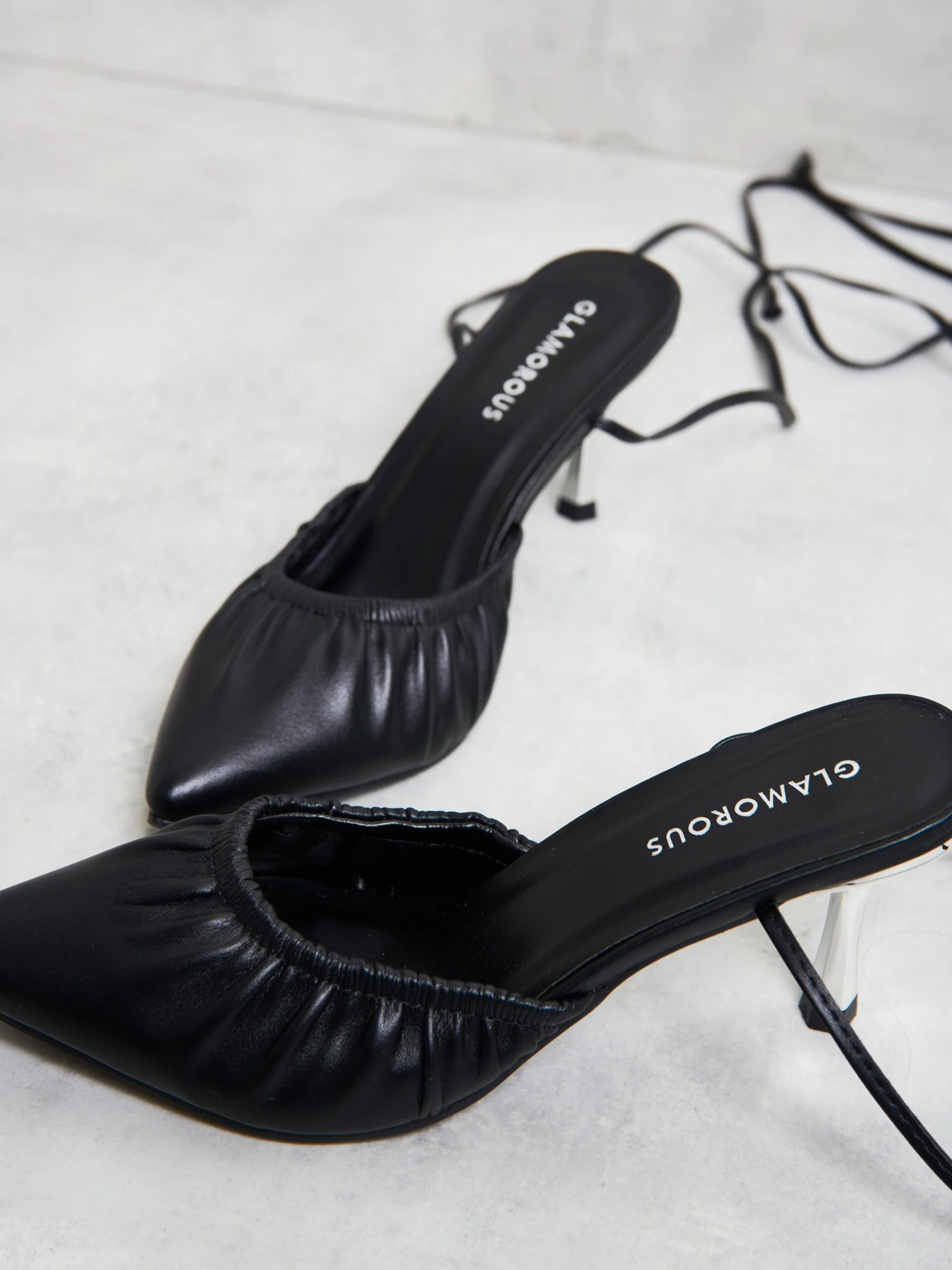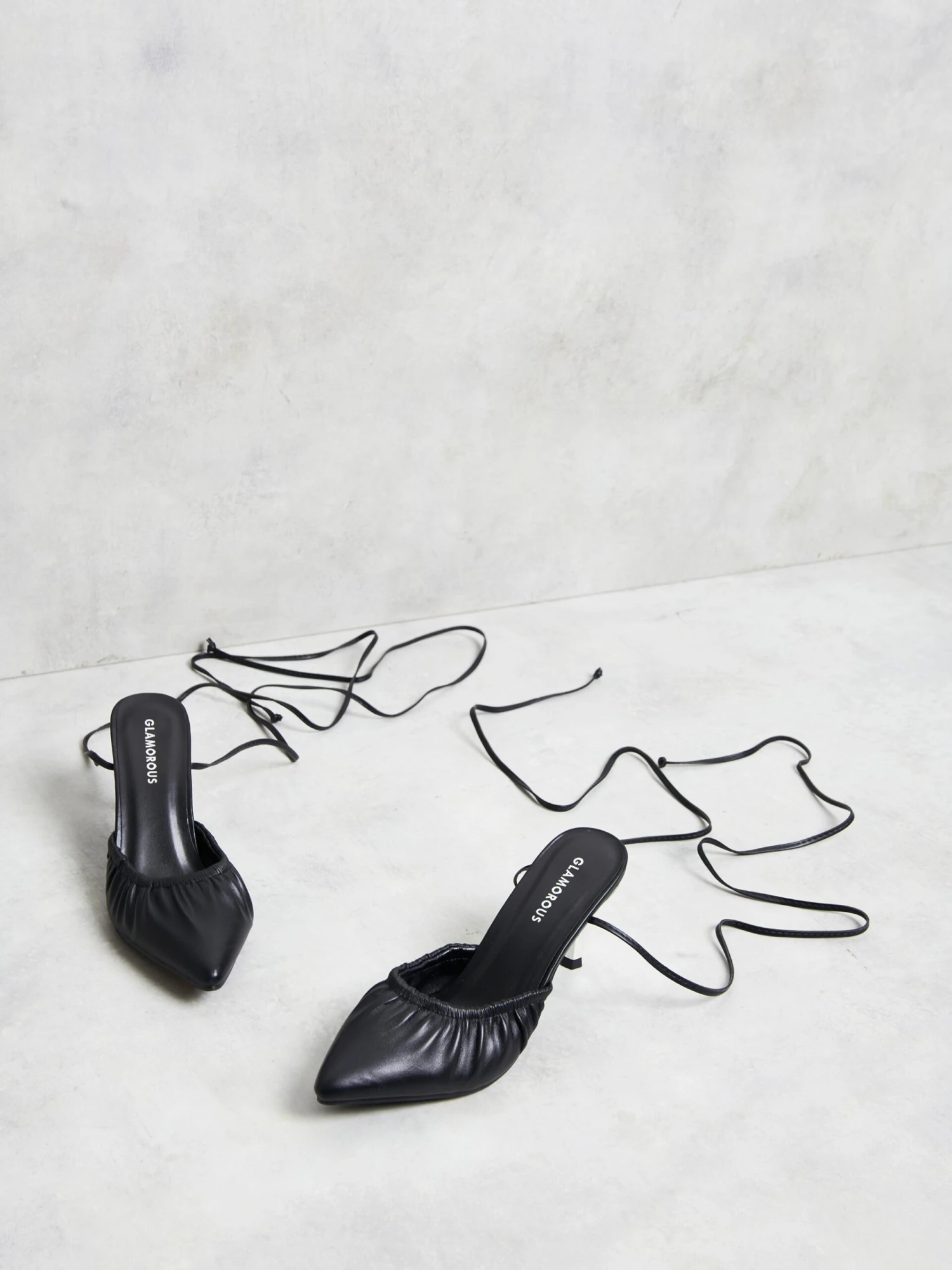 Glamorous Womens Black Lace Up Faux Leather Kitten Heels. Chic and stylish these heels will look great in your wardrobe. Featuring strappy lace up detail and pointed toe with a kitten heel, these heels are the perfect way to elevate every outfit. Team with your favourite jeans and a statement top for date night or style with a cute floral dress and a clutch for that perfect fashion forward look.