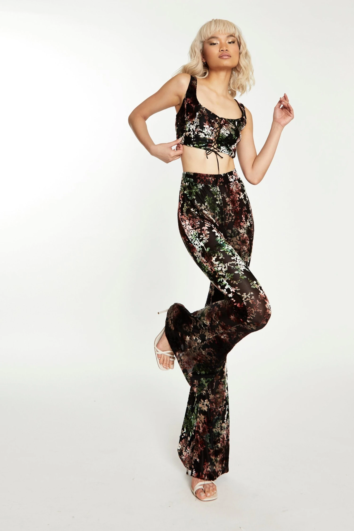 Glamorous Black Multi Devore Flared Trousers. These luxe devore trousers are perfect for the upcoming season. Featuring a figure flattering high-waisted fit in a flared style, these trousers will look great on you! Complete the look with our matching corset top and your favourite heels.