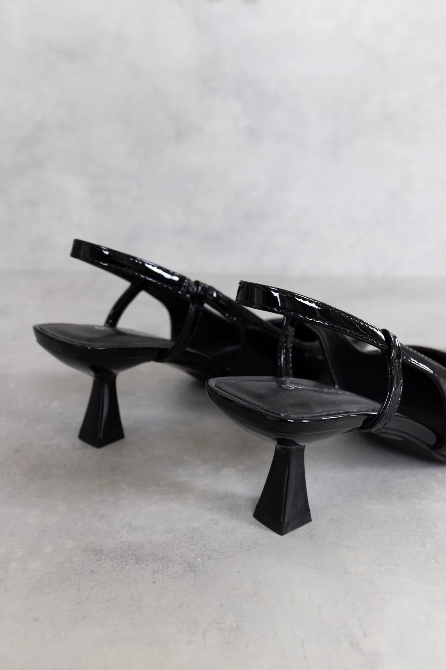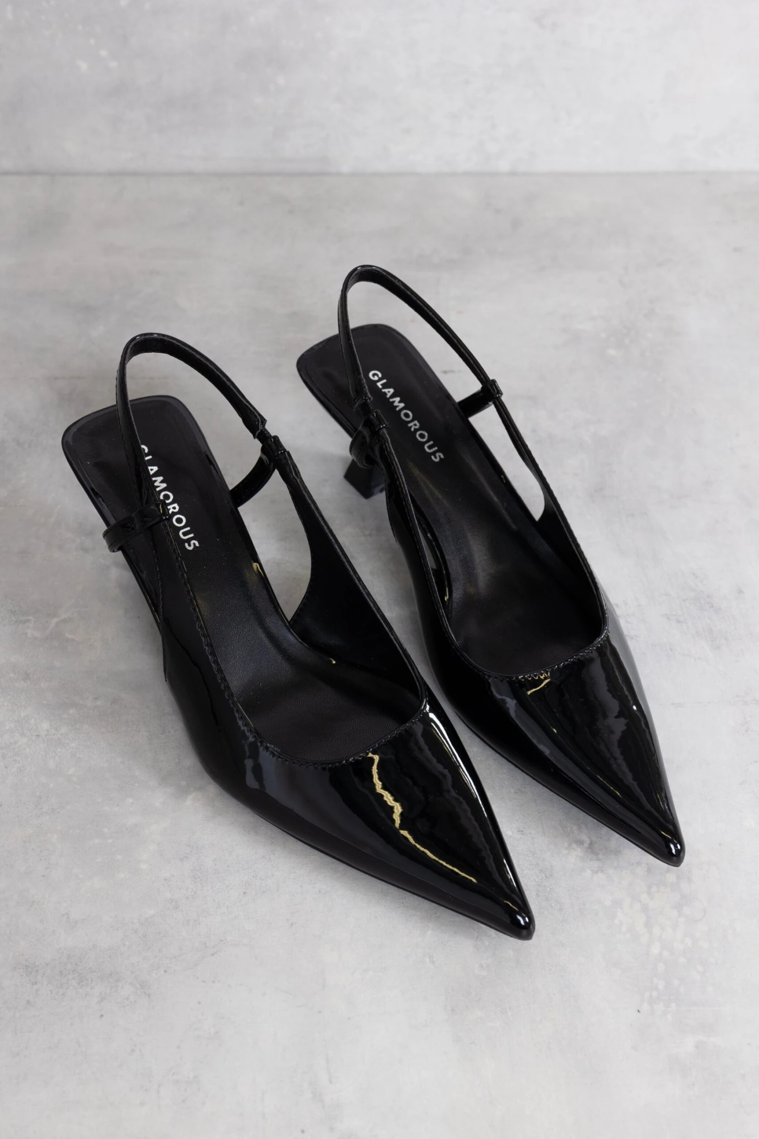 Glamorous Womens Black Patent Slingback Flared Mid Heels. Step into this season in style with these mid heeled slingbacks! Featuring a chic flared stiletto heel and pointed toe, the easy on and off sling back design instantly creates a sophisticated but effortless look! Pair with some cropped straight jeans and crisp white shirt for a super sleek city girl look!