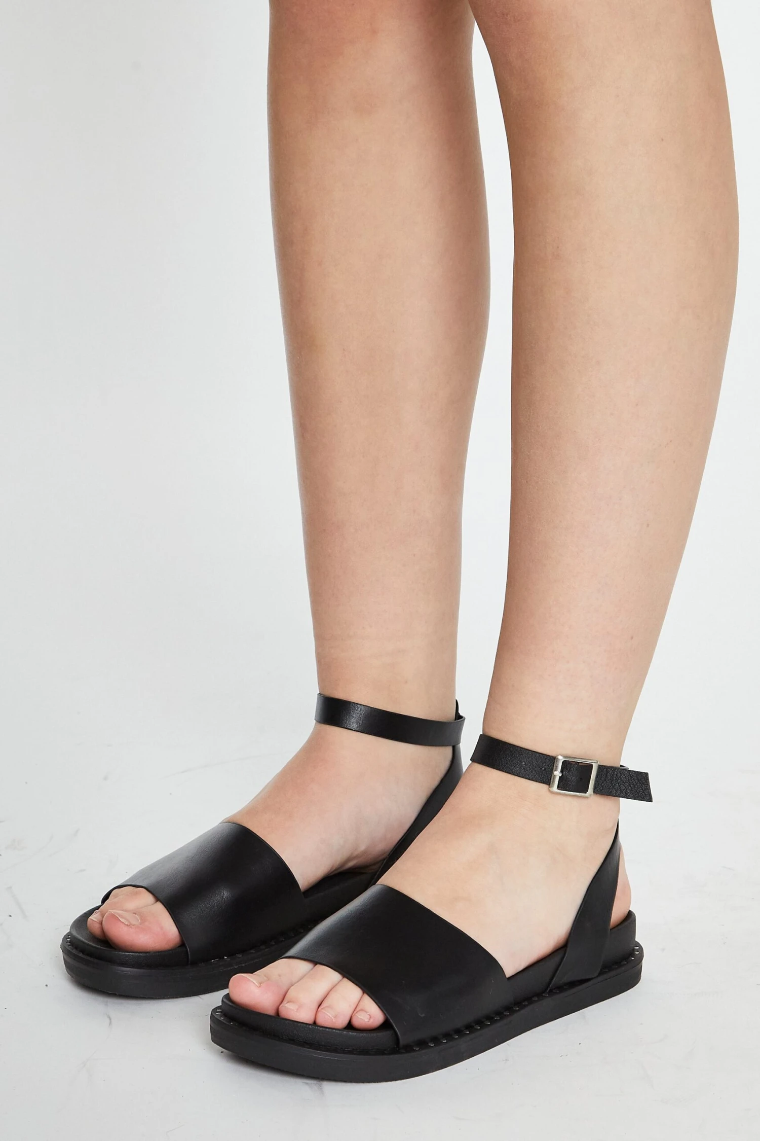 Glamorous Women’s Black PU Buckle Strap Sandals. Step out in style with these chic black buckle strap sandals! Featuring a buckle strap, flat sole, open toe, adjustable ankle strap, and thick sole, these sandals are perfect for a casual day out. Be sure to buckle up for maximum comfort and style!