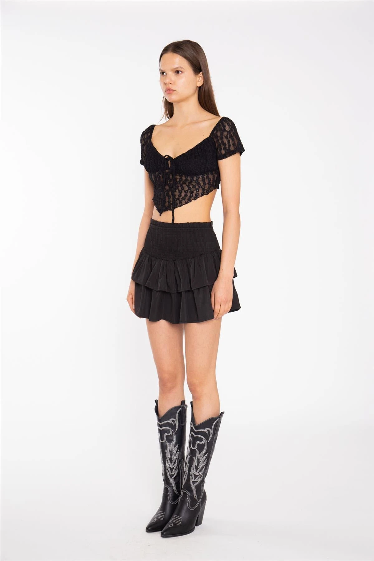 Glamorous Women’s Black RaRa Smocked-Waist Mini-Skirt. Look and feel your best while celebrating the golden nostalgia of the rara skirt! This sleek black mini skirt features a smocked waistband and high waisted cut – perfect for any fun, flirty, and fabulous occasion! Put the finishing touches on your look with a cute crop top and some classic cowboy boots.
