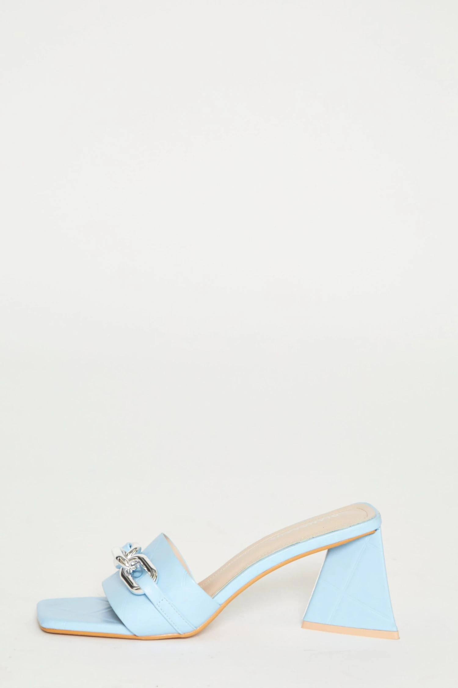 Glamorous Blue Quilted Square Toe Mules. Refresh your footwear collection with these gorgeous quilted mules. Featuring square toe, chain detail and on-trend triangle block heel, these mules are the perfect way to add a pop of colour to every outfit. Simply style with jeans and a cute top for brunch, drinks with the girls and date night.Â
