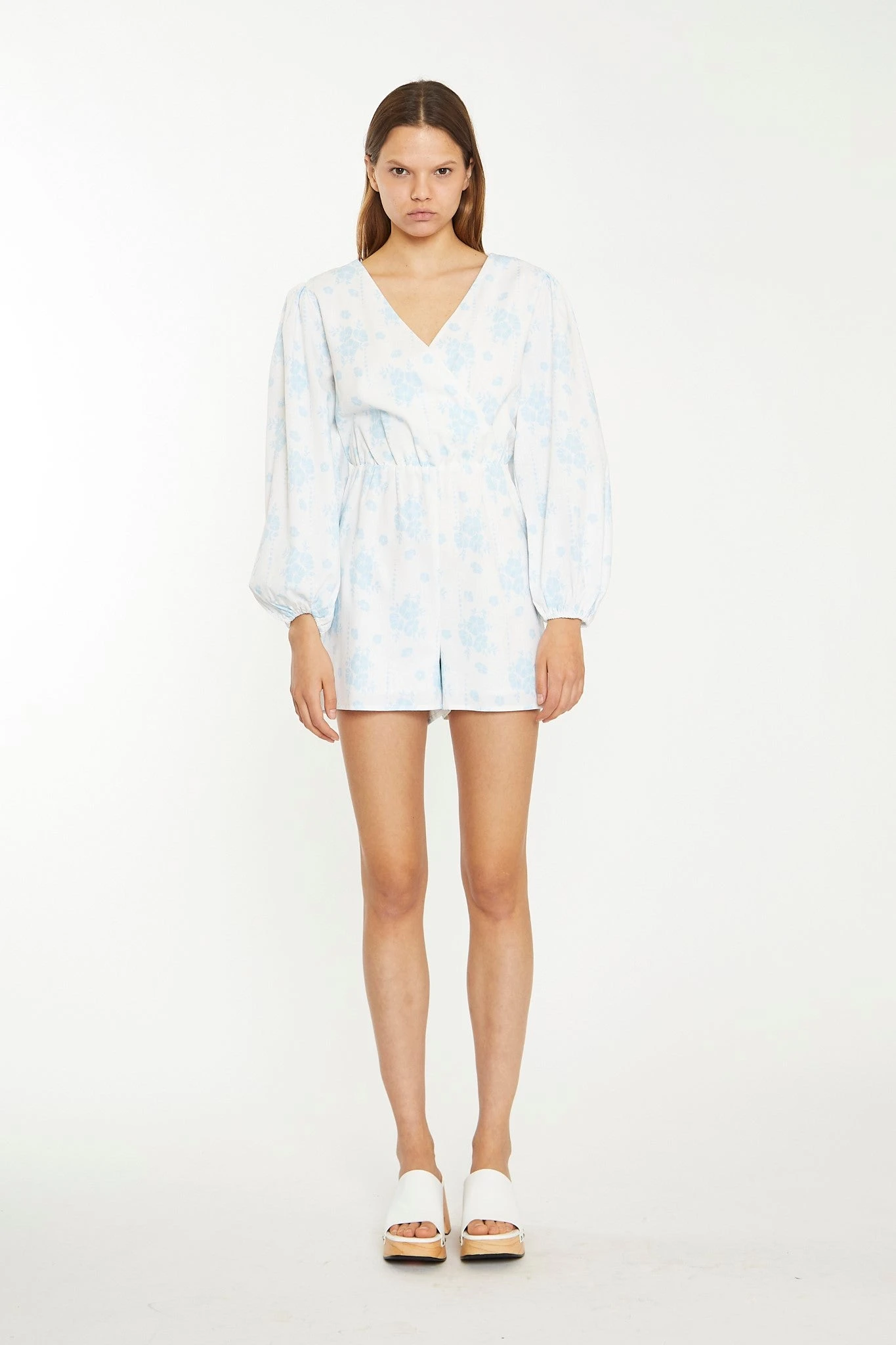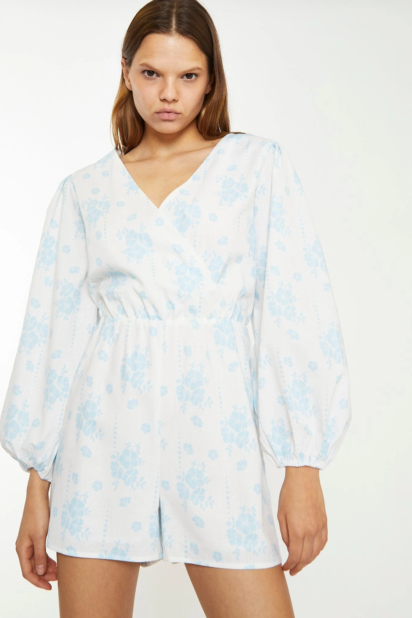 Glamorous Womens Blue Wallpaper Floral Wrap Playsuit. This playsuit in a gorgeous blue wallpaper floral print is a style worth having in your wardrobe. Featuring a flattering wrap over design with a V-neckline and balloon sleeves, this piece will look great on you! Elevate the look with some mule sandals and a cute strappy bag for an on-trend vibe.
