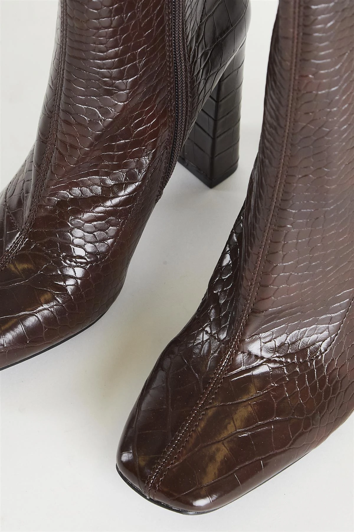 Glamorous Women’s Brown Croc Calf High Heeled Boot. Make a statement in these daringly stylish Croc Print Boot Boots. Perfect for adding a touch of height and attitude to your look. Featuring a concealed zip fastening, regular fit, block heel and pointed toe. Get ready for a wild night out!