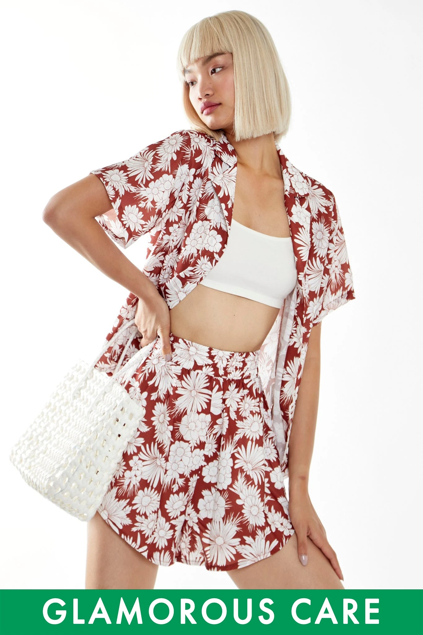 Glamorous Care Womens Brown Resort-Floral Shorts. Discover an earth-friendly fashion statement with our unique shorts and matching shirt set. These shorts will keep you looking cool and feeling comfortable with an elasticated waistband and handy inseam pockets. Pair with your favourite white trainers for a comfortable but chic day time look.