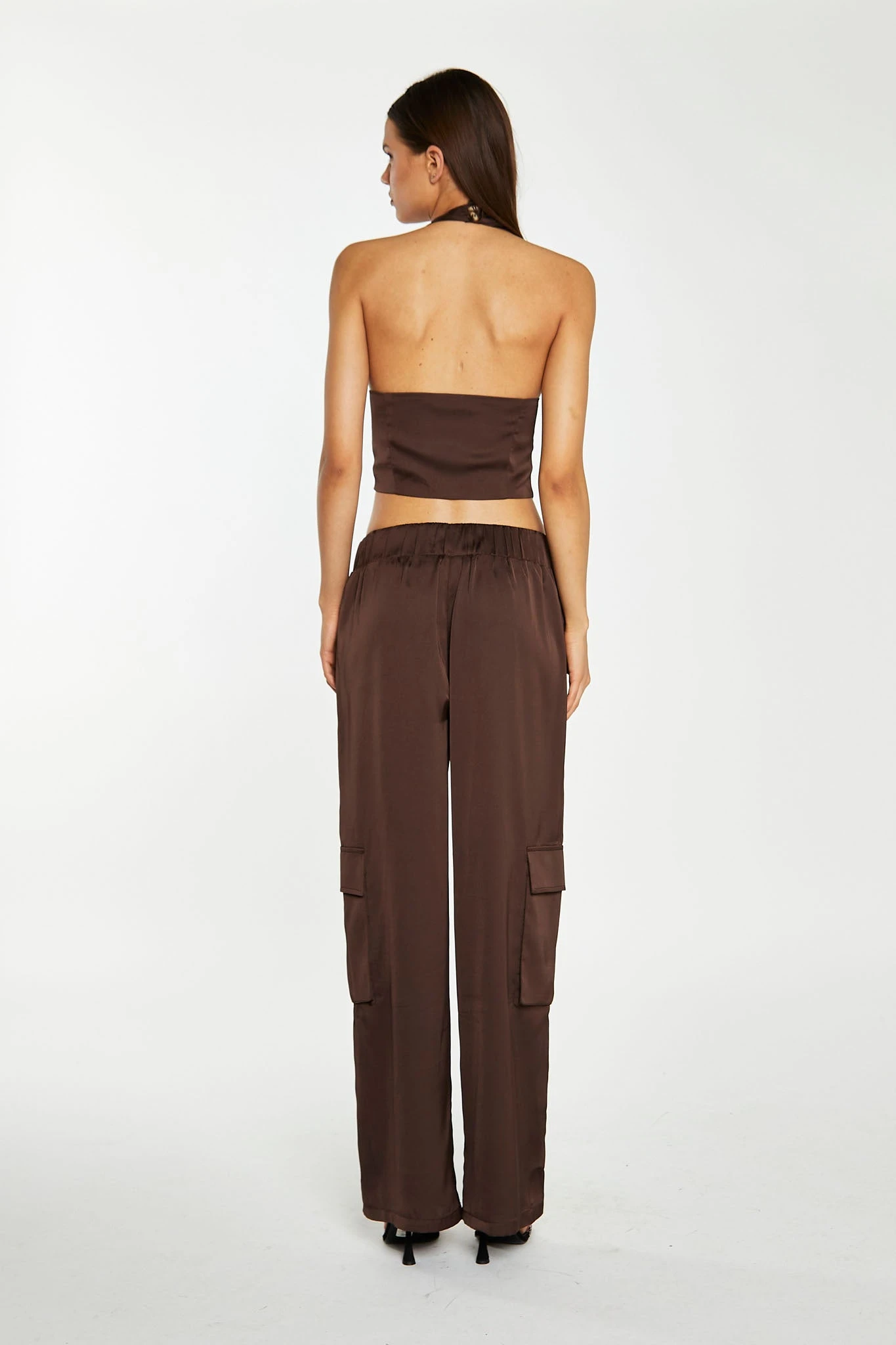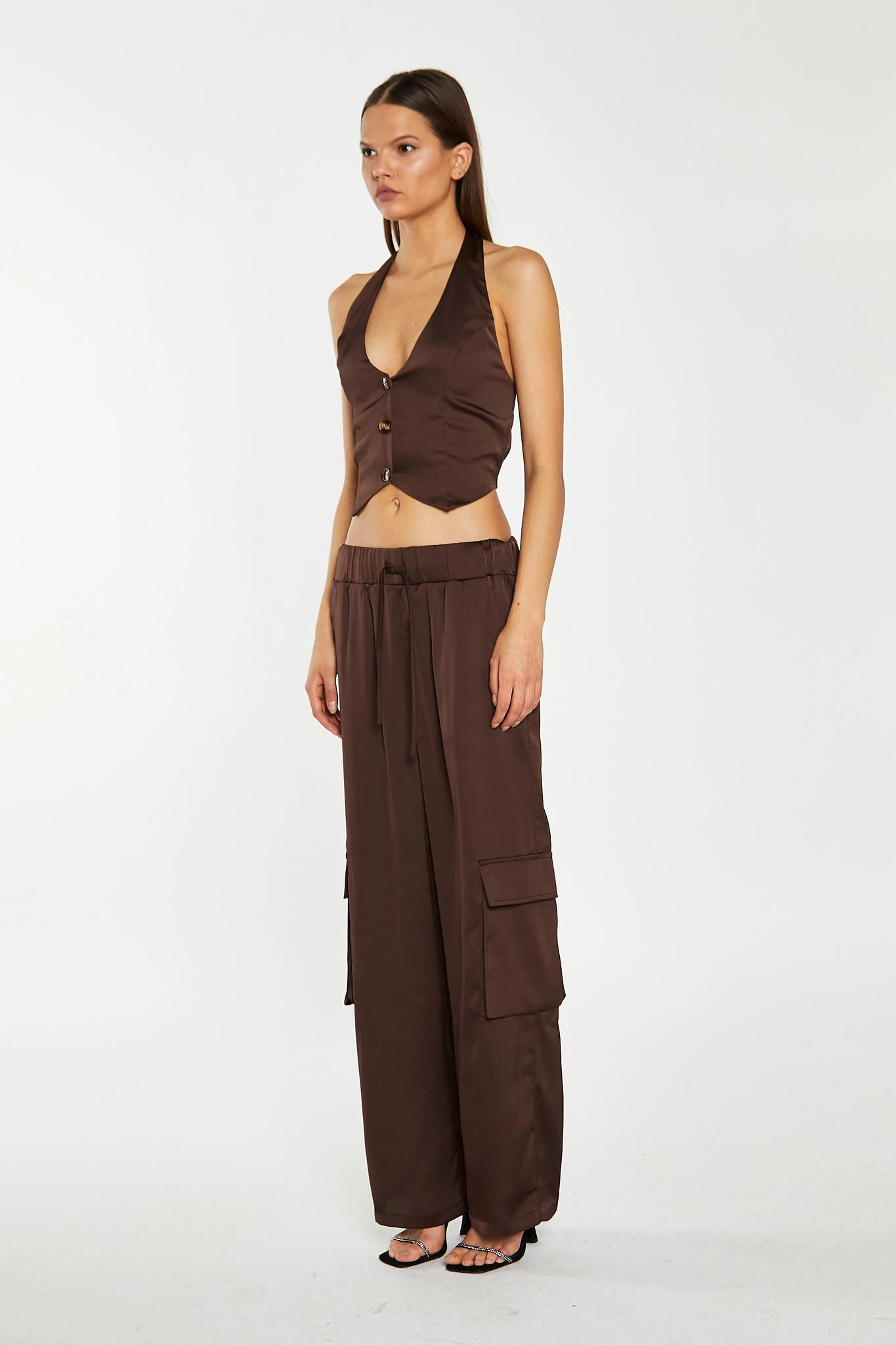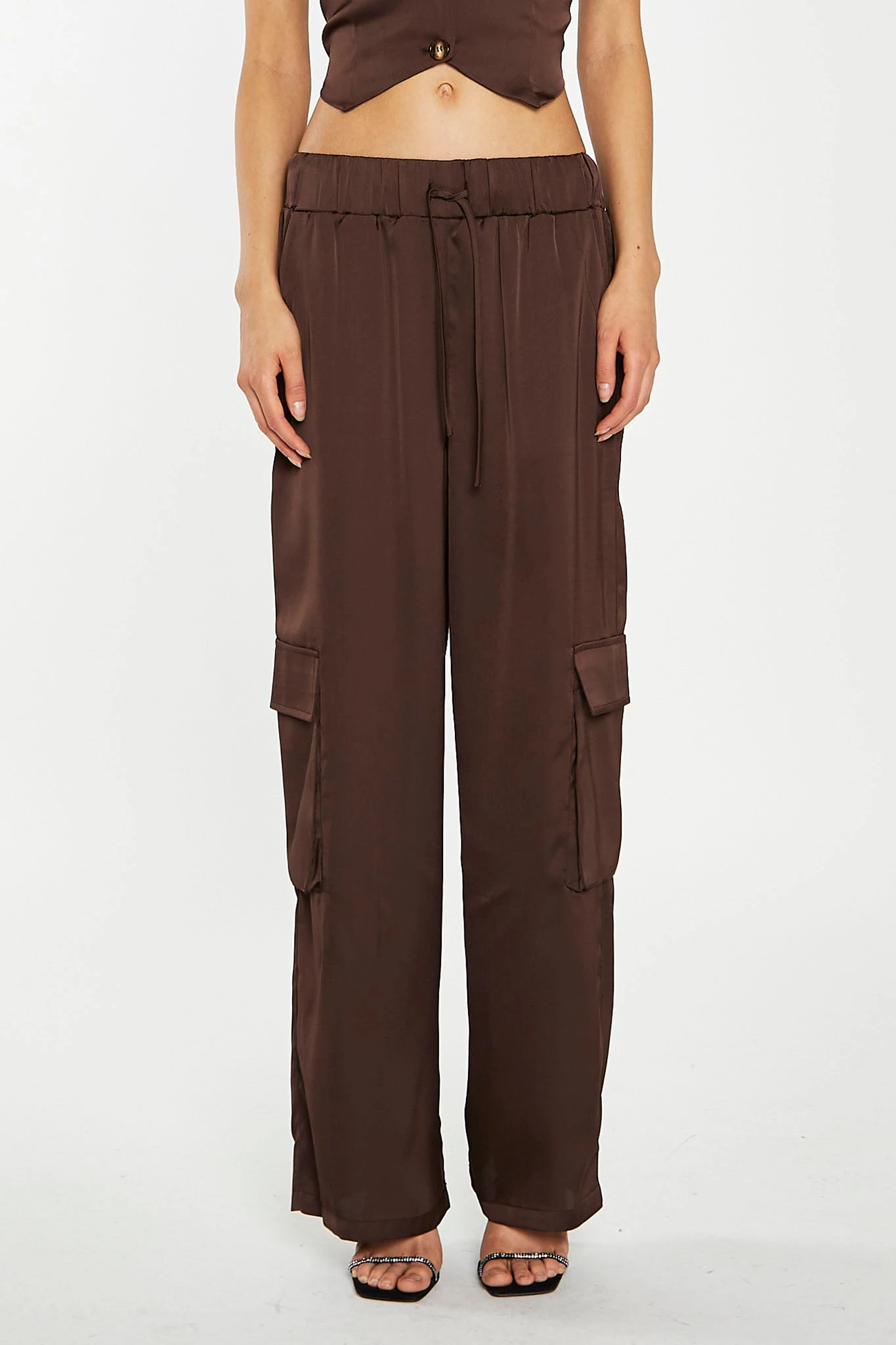 Glamorous Womens Brown-Satin Cargo Trousers. Stay chic and comfortable in these Cargo Trousers! Featuring classic cargo pocket details and drawstring waistband for a custom fit. Style with the matching top, for a chic look from head-to-toe!