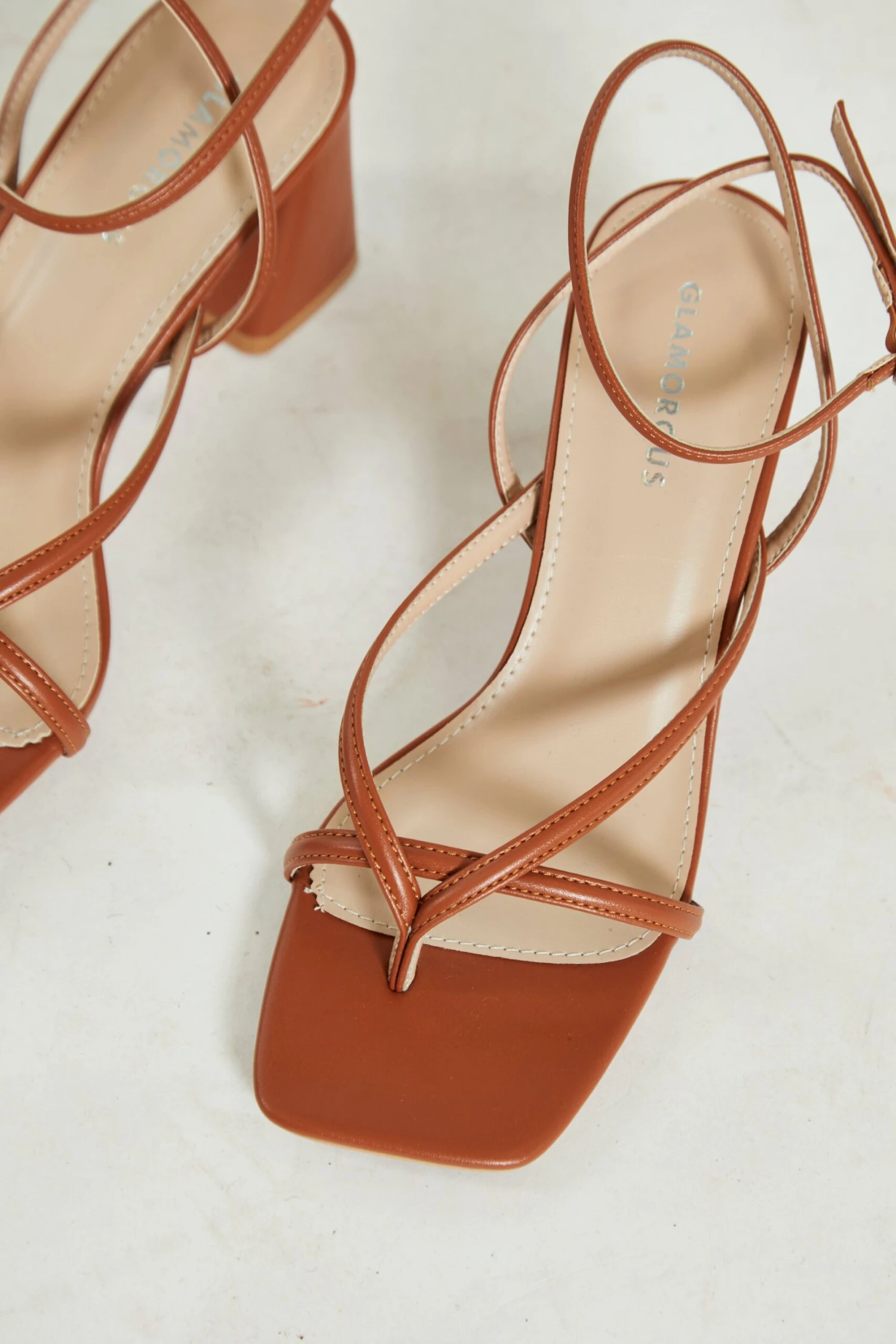 Glamorous Camel Strappy Block Heel Sandals. A must have for every holiday collection, these strappy sandals will go with everything in your wardrobe. Featuring a block heel, open square toe and supportive ankle strap, these sandals are comfy and on-trend. Dress up or down for any occasion!