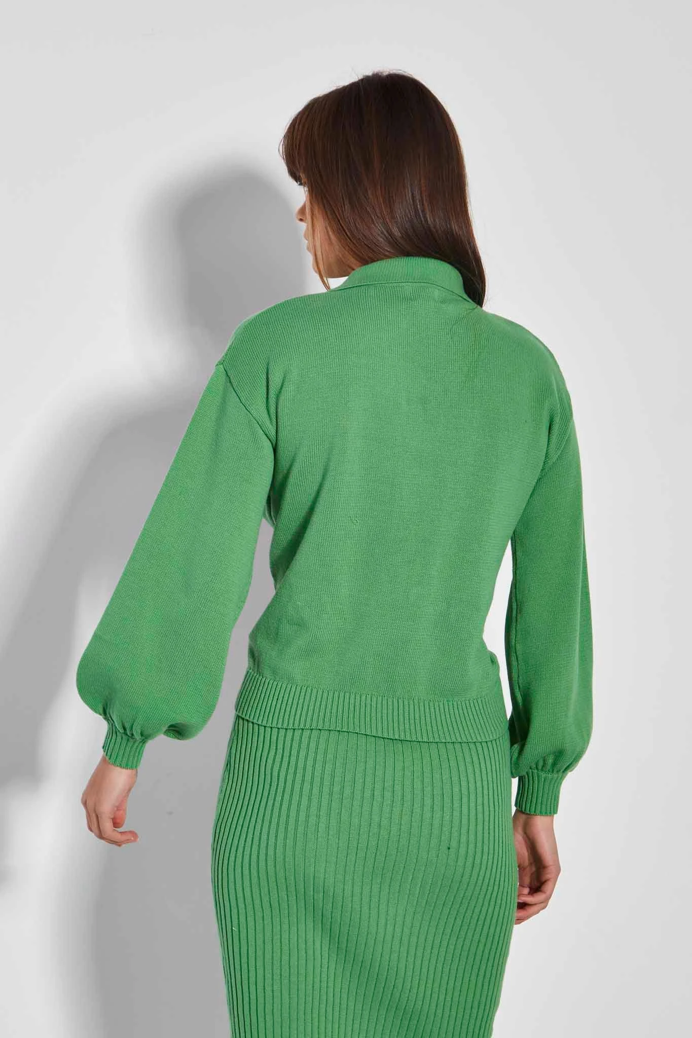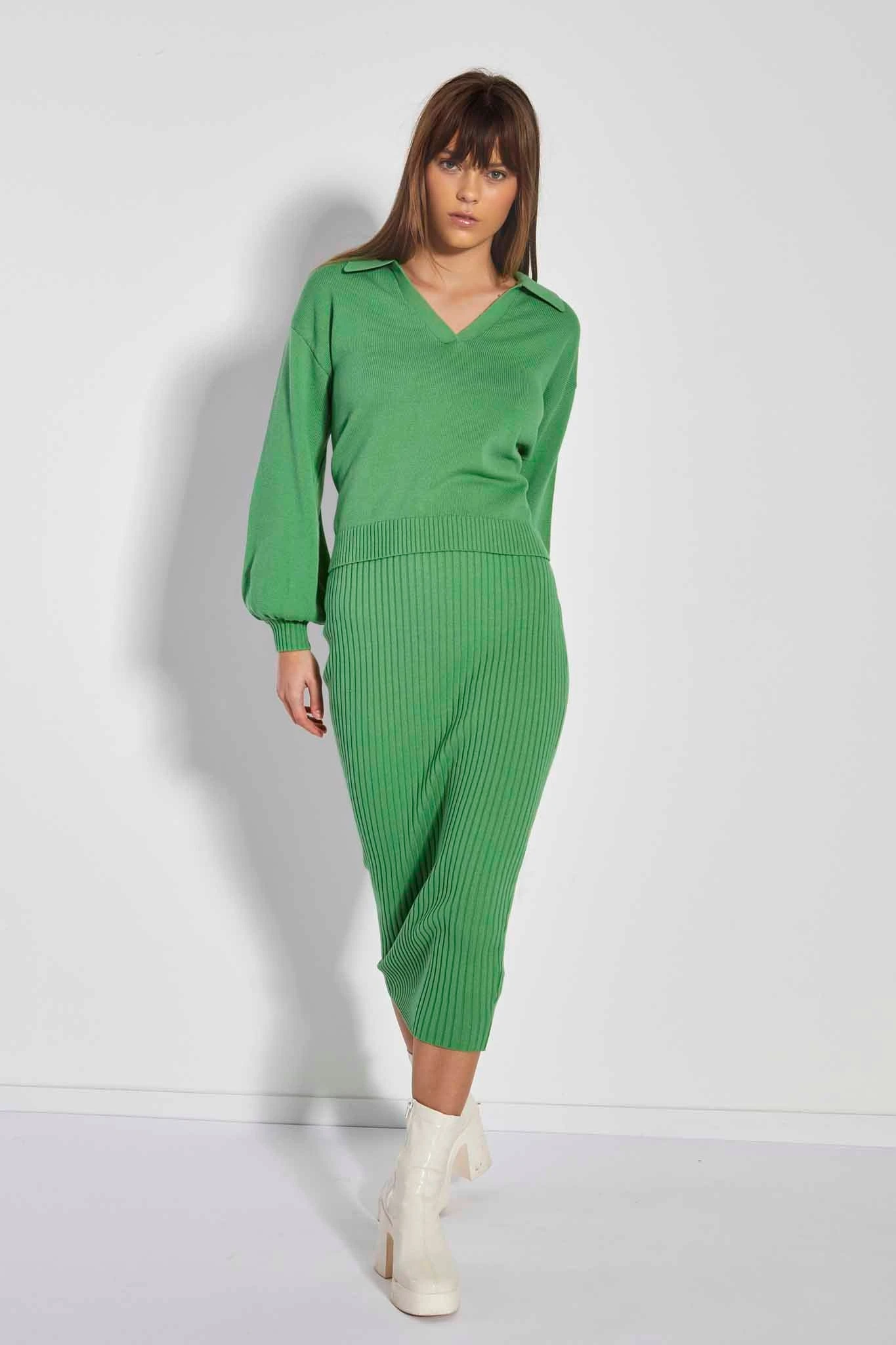 Glamorous Care Apple Green Knitted Jumper with Collar. Add a pop of colour to your wardrobe with this fresh apple green jumper. Featuring long voluminous sleeves and a collar, this sustainable piece will brighten any outfit. Looks great teamed with jeans and trainers.Â