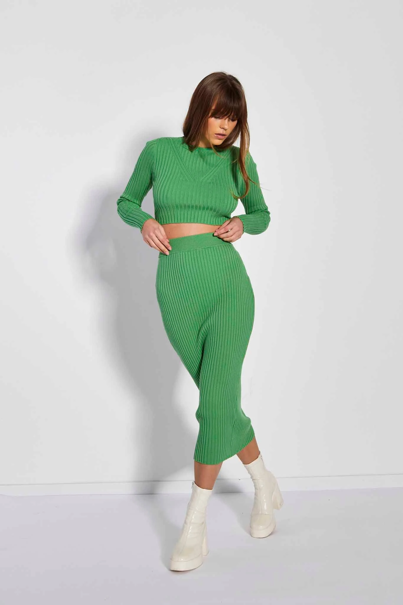 Glamorous Care Apply Green Rib Knit Midi Pencil Skirt. Opt for a sustainable style with this gorgeous apple green rib knit midi skirt. Style with the matching crop top and boots to complete the perfect look for this season! Â