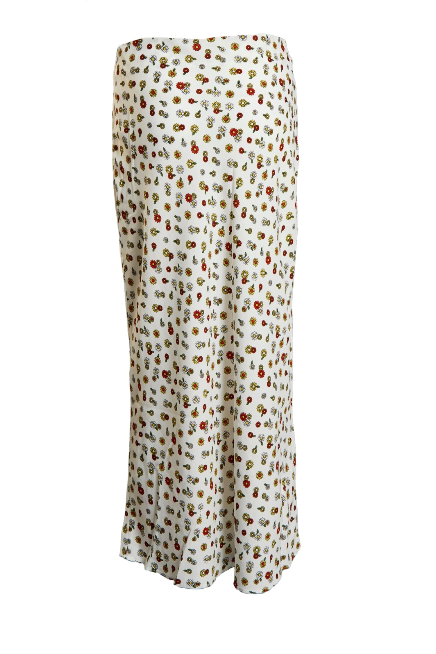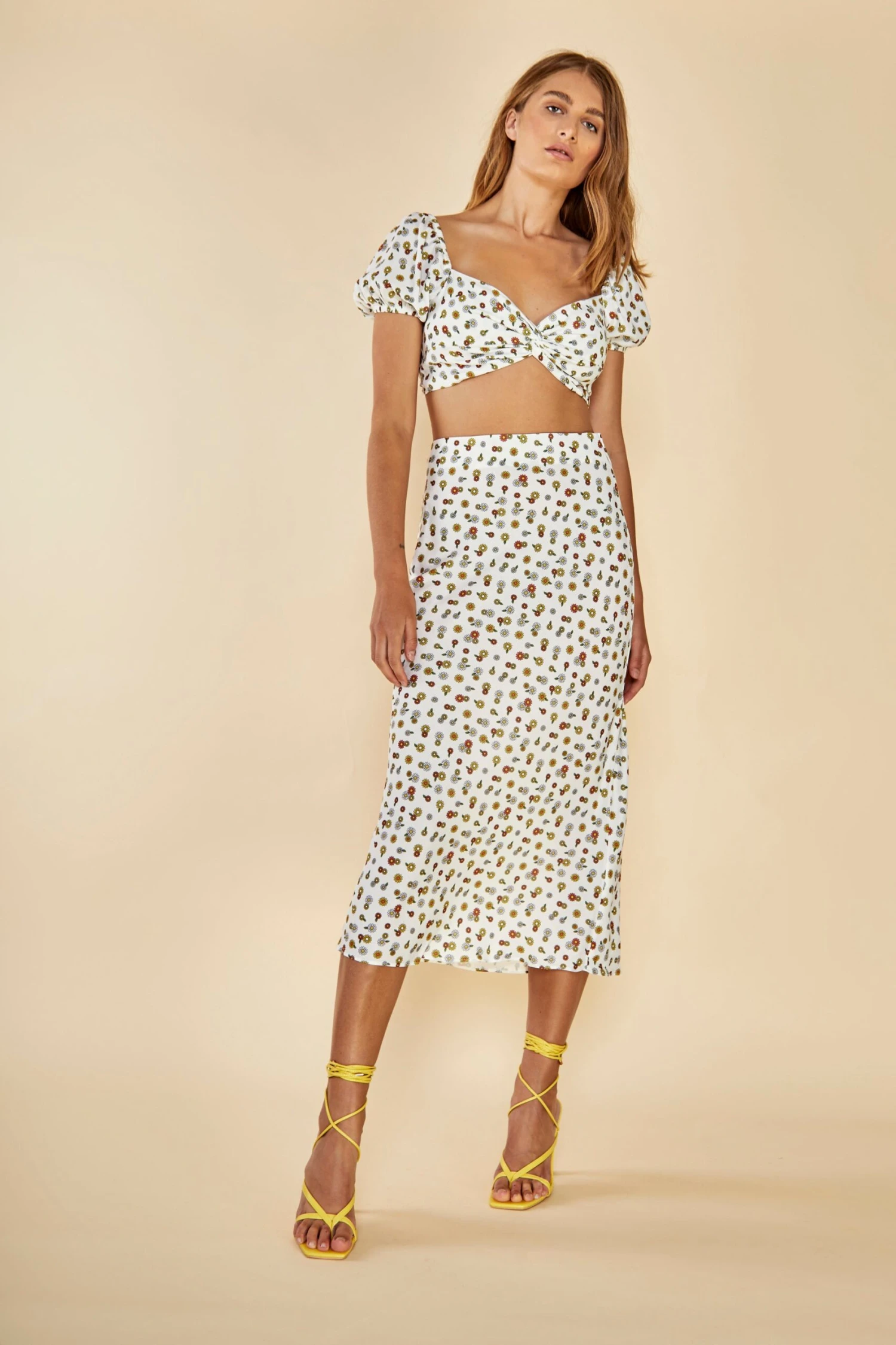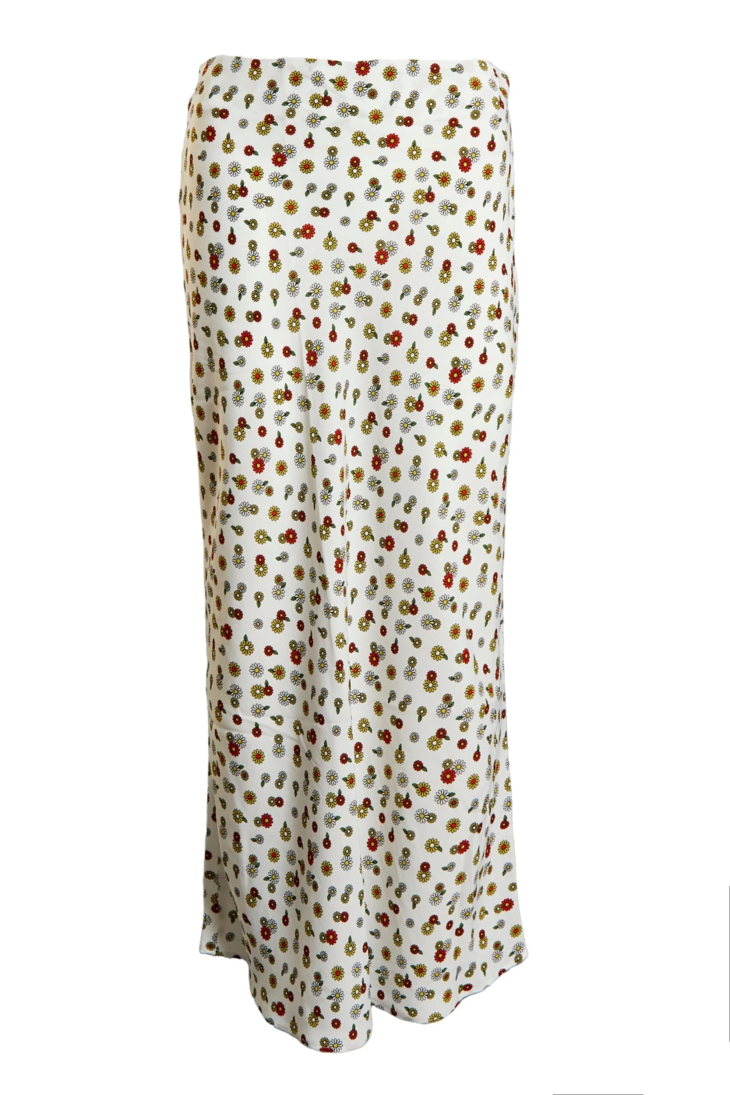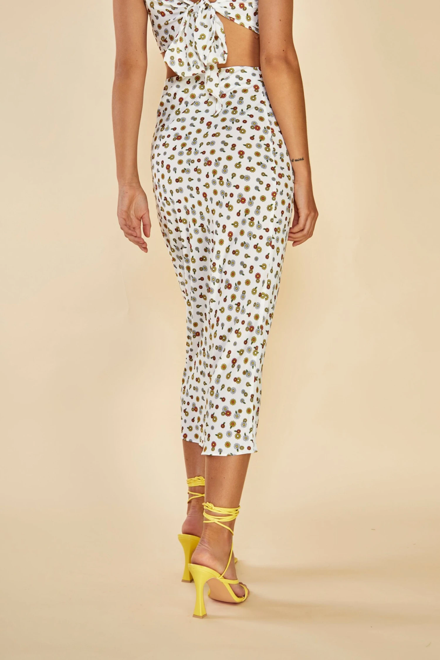 Glamorous Care White Ditsy Daisy Bias Cut Midi Skirt. Opt for sustainability with this flattering bias cut mid skirt. This elegant skirt is perfect for any occasion. Pair with the matching top and strappy heels for a effortlessly chic look.