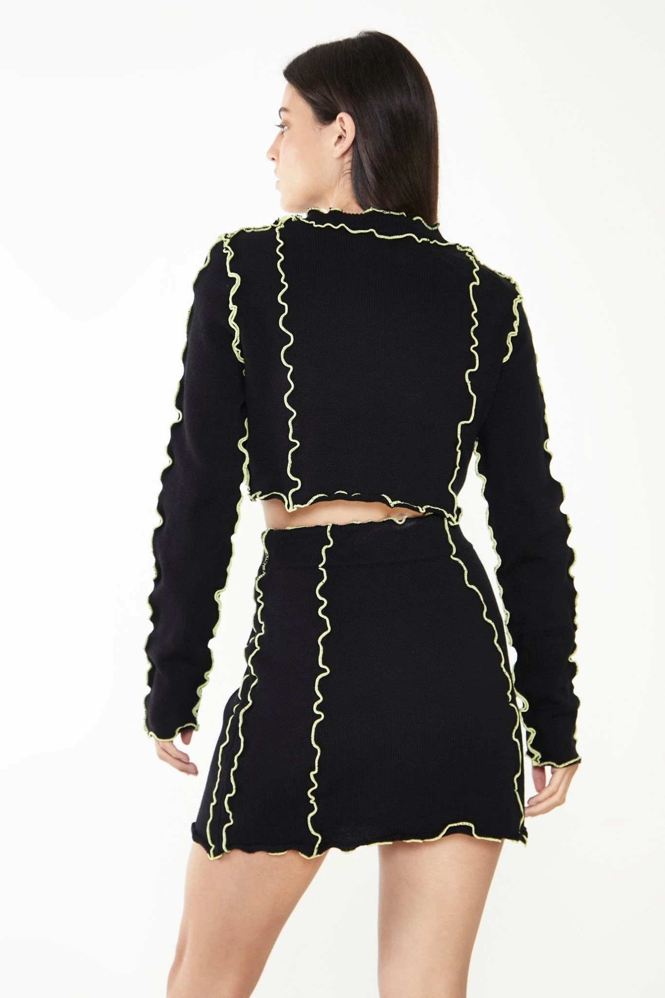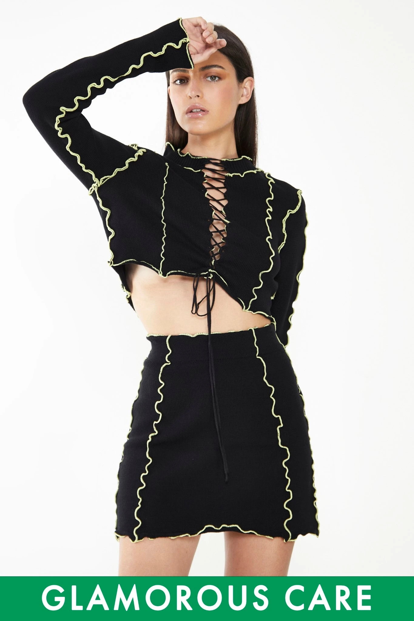 Glamorous Care Black Exposed Seam Mini Skirt. This piece is the perfect addition to your wardrobe, whilst doing your bit for the planet. This super flattering mini skirt features a gorgeous yellow frill to create a stylish exposed seam effect. Style with the matching top and a pair of chunky boots to complete the look.