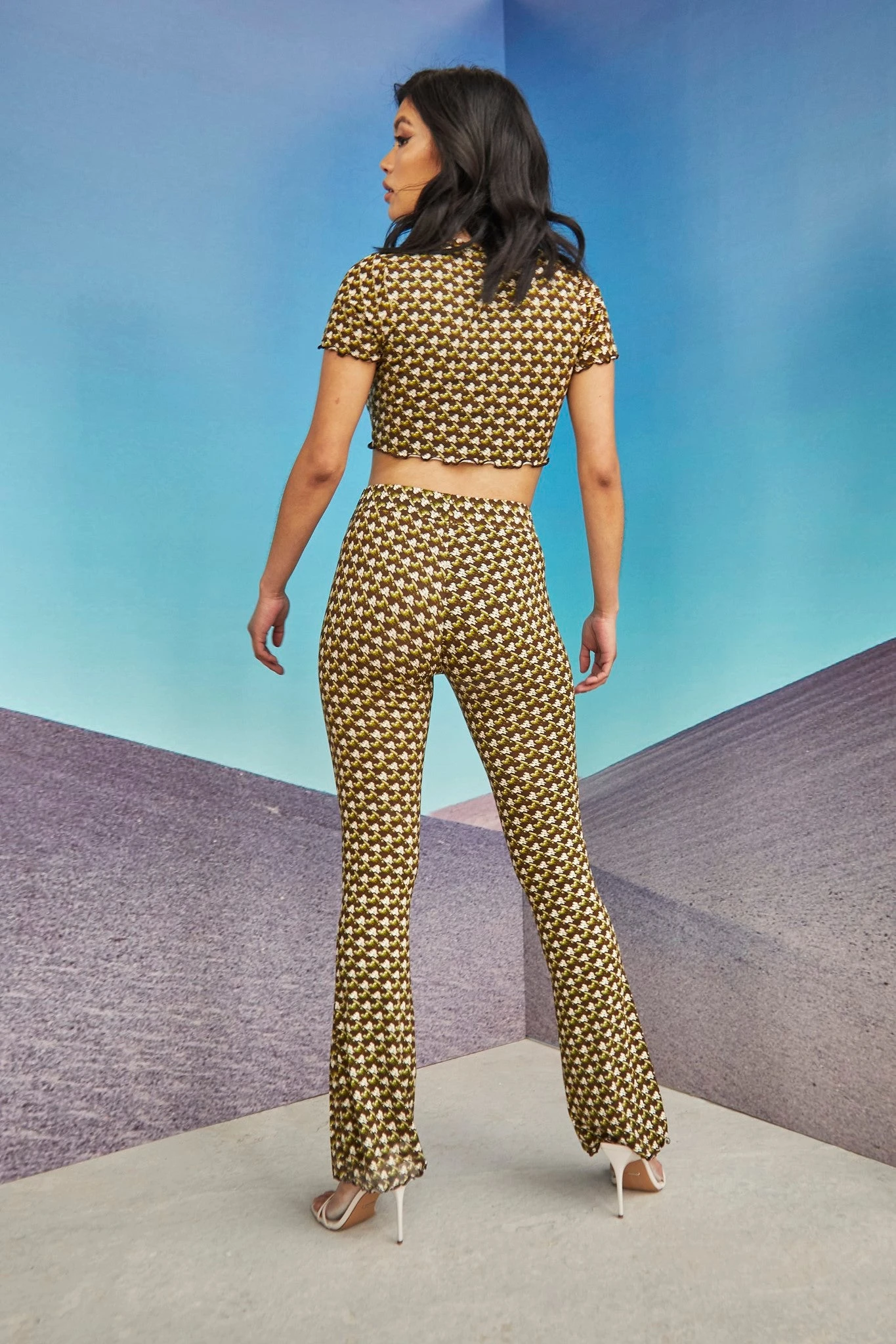 Glamorous Care Khaki Hounds tooth High Waisted Trousers. We cant get enough of these print trousers featuring a super on trend flattering fit. Join our positive journey towards reducing the impact that fashion has on our planet by styling this with matching co ord top some heels for the evening or trainers for the daytime for the perfect environmentally friendly look.