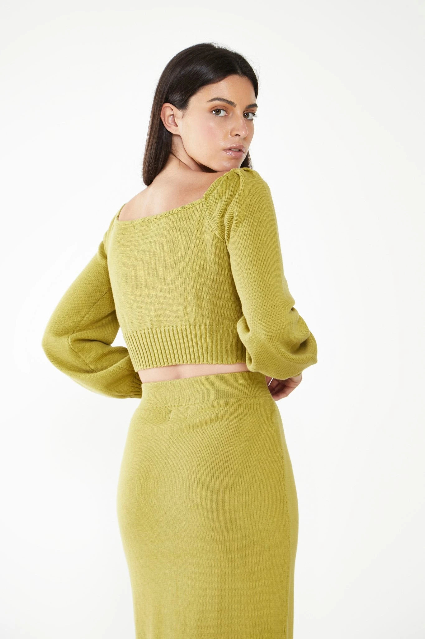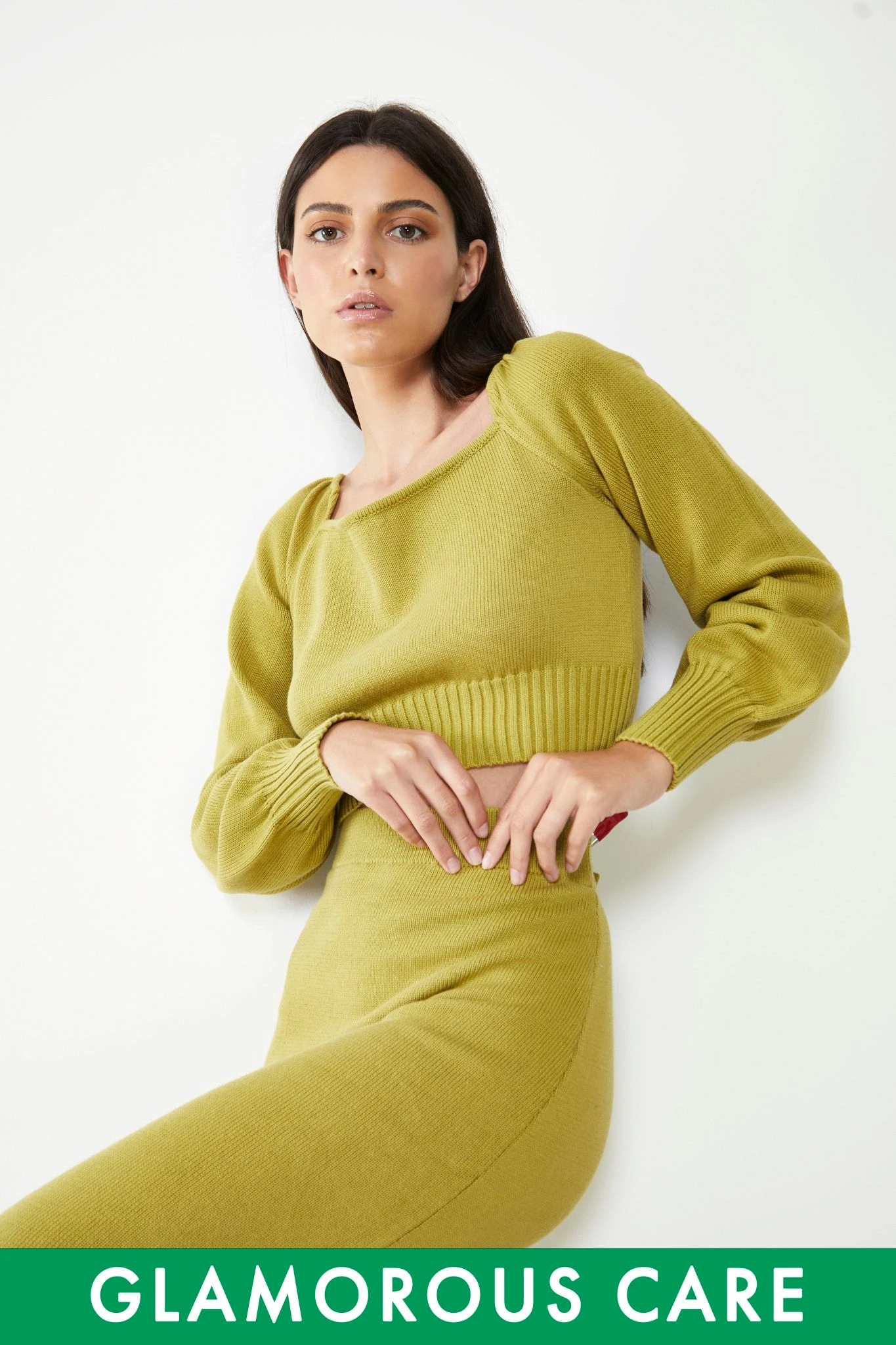 Glamorous Care Olive Cropped Long Sleeve Jumper. This sustainable jumper is the must have staple piece this season. With a flattering cropped fit, long sleeves and a square neckline, this piece will look great on you! Style with the matching co-ord skirt for that ultimate luxe vibe.