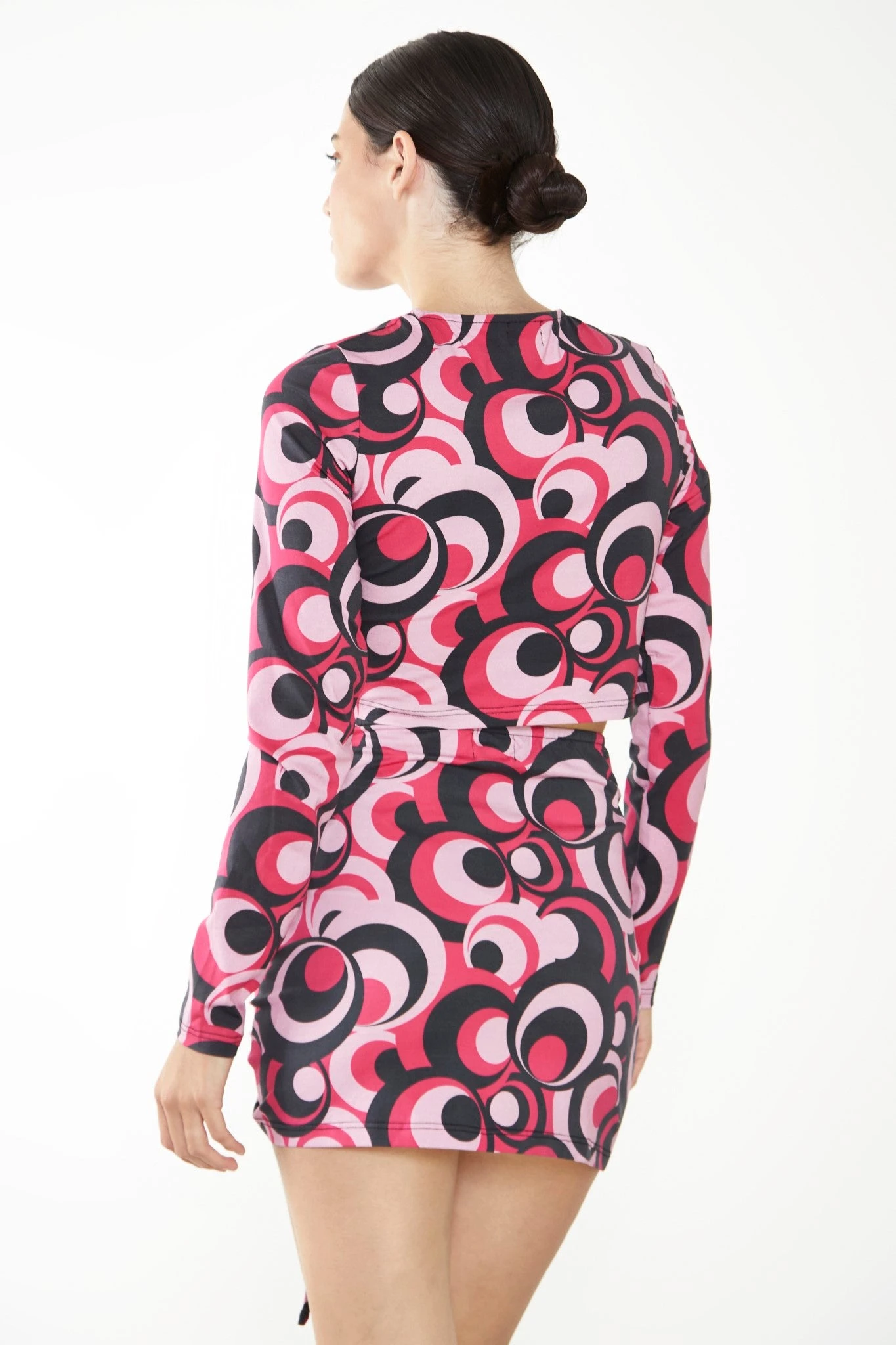 Glamorous Care Pink Circle Print Drawstring Ruched Crop Top. This standout sustainable piece is going to have you turning heads. Featuring a gorgeous pink circle print, an adjustable drawstring ruched design and a cropped fit, this top wont fail to impress! Style with the matching co-ord skirt and a pair of knee high boots for the perfect evening look.