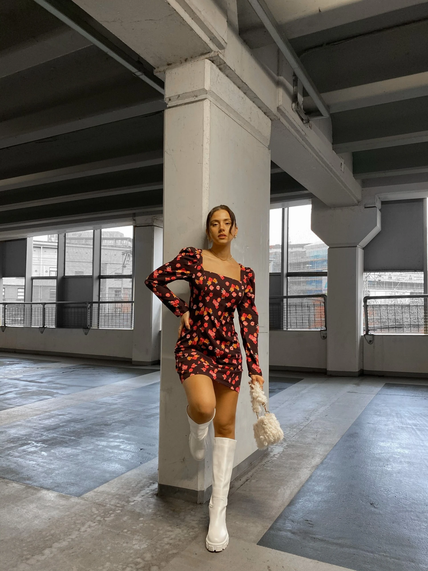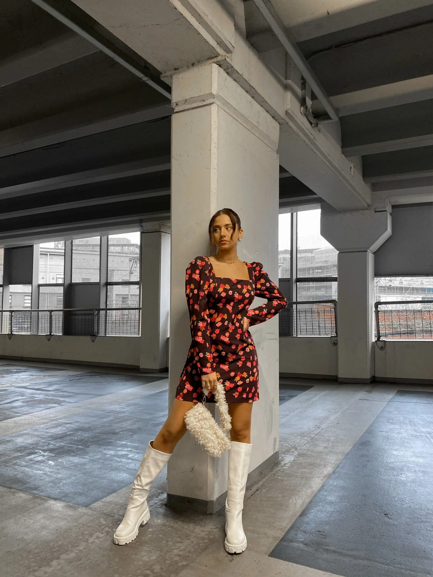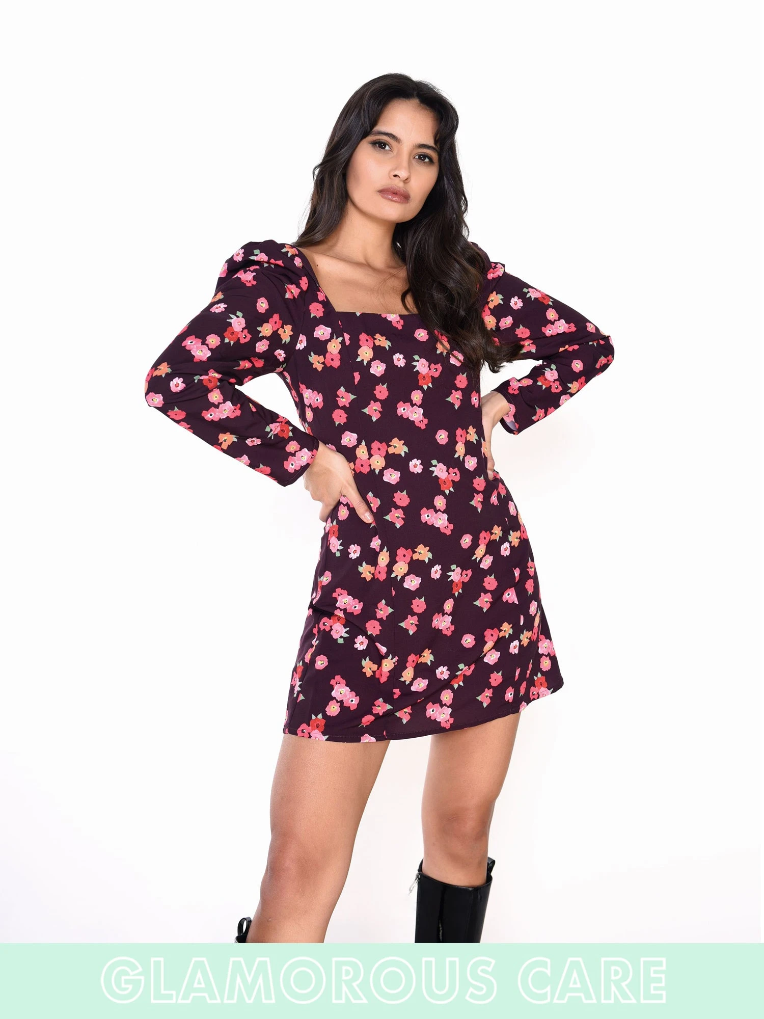 Glamorous Care Plum Watercolour Floral Square Neck Long Sleeve Mini Dress. This dress is perfect for your wardrobe this season. this sustainable piece in a watercolour floral print will look great on you this Autumn. Featuring a square neck and mini dress fit, this dress will have heads turning. Pair with chunky boots for a effortlessly chic look.