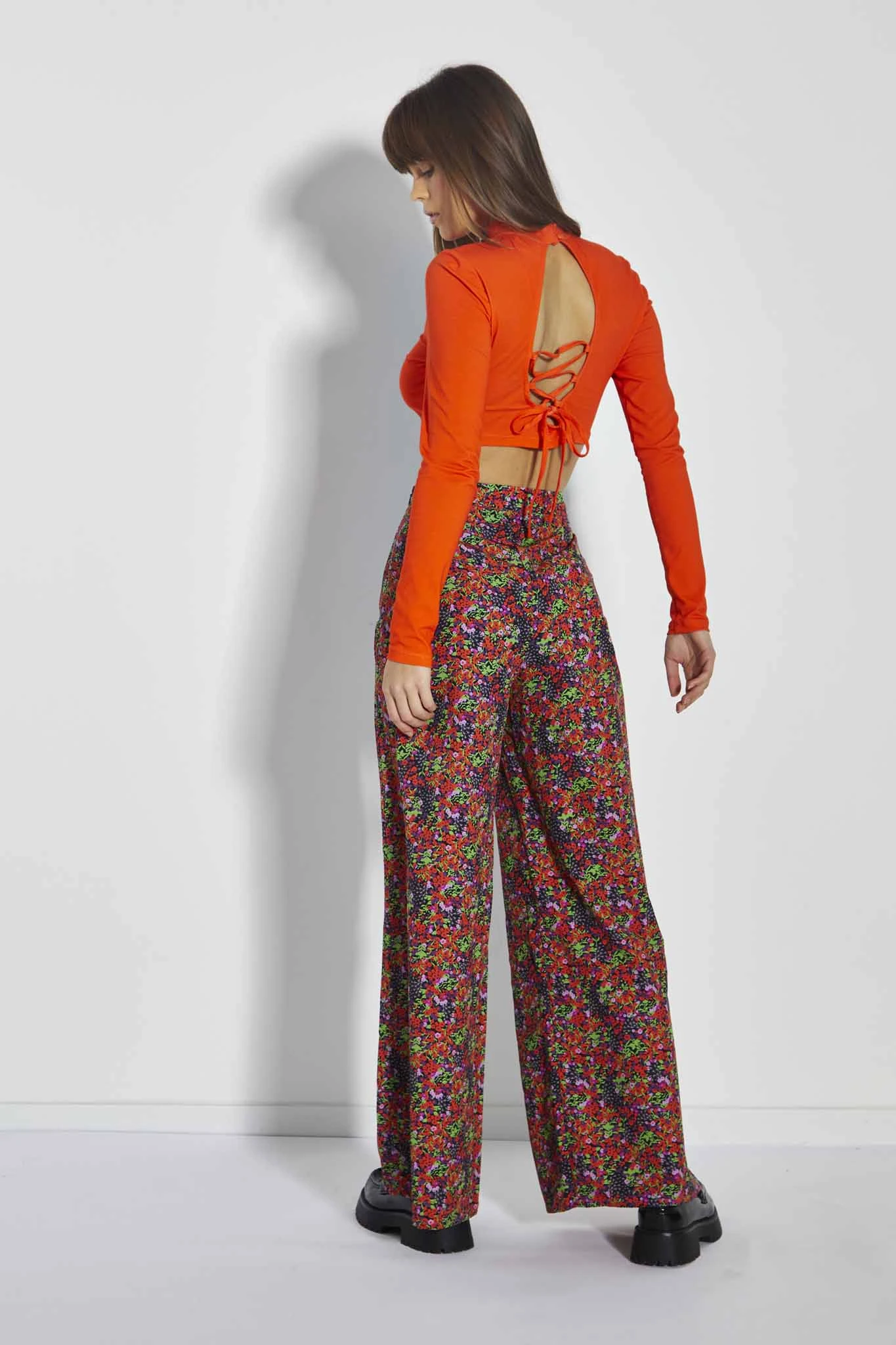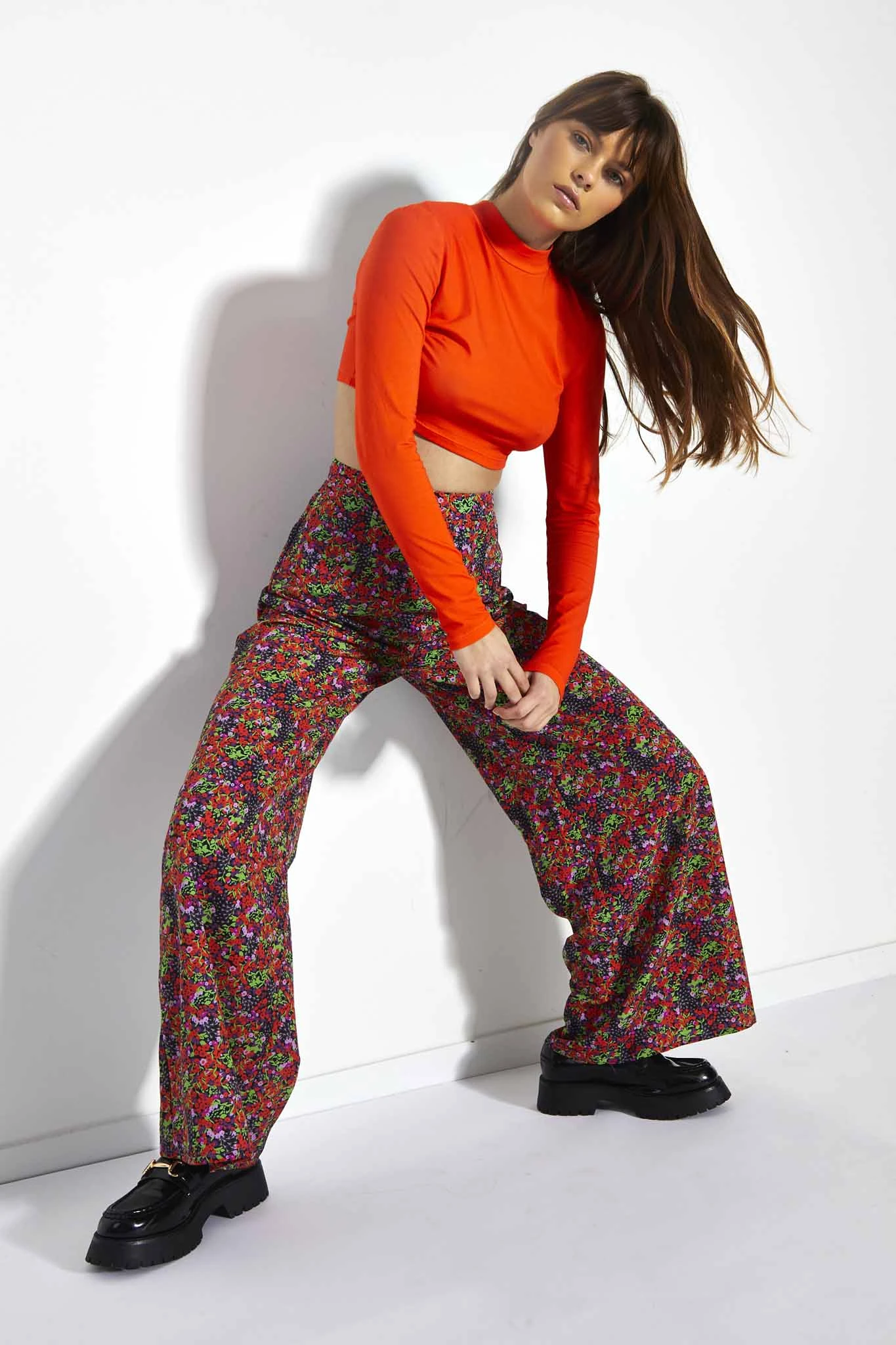 Glamorous Care Purple Orange Ditsy Wide Leg Trousers. Opt for colour and sustainability with these gorgeous wide leg trousers in a purple orange ditsy print..  Style with the matching shirt for a relaxed but chic look.Â
