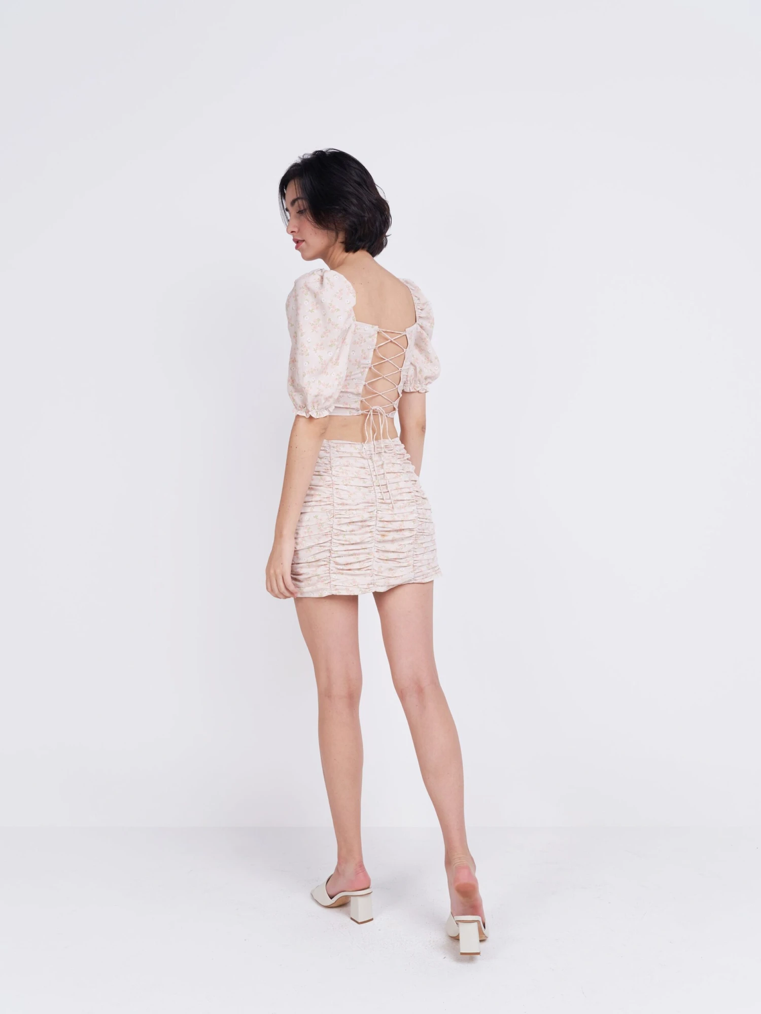Glamorous Care Stone Ditsy Floral Top. Opt for a sustainable style with this gorgeous stone ditsy floral top. We cant get enough of this top featuring on trend puff sleeves and the open back tie detailing. Style with matching midi skirt complete your sustainable look.