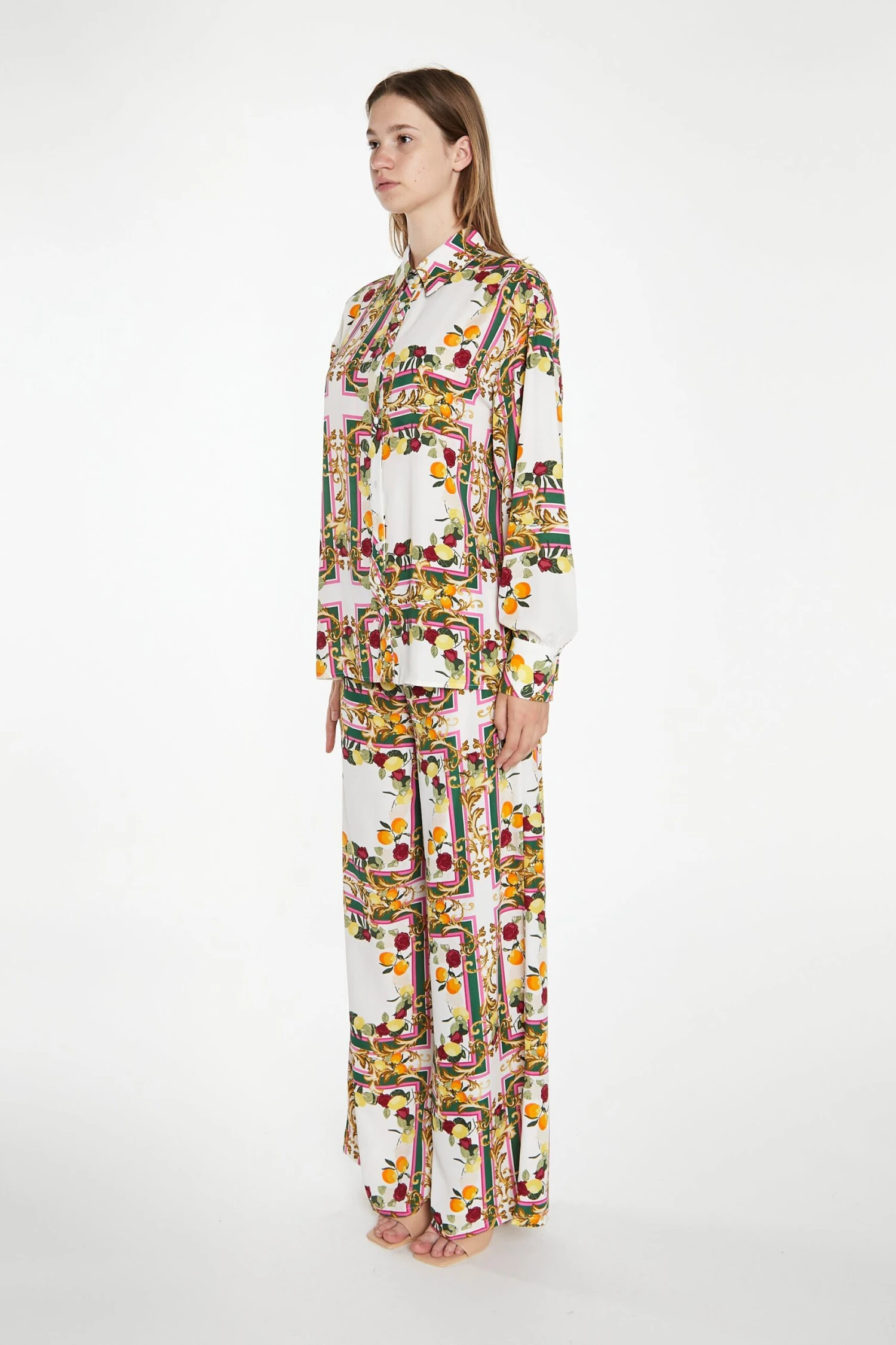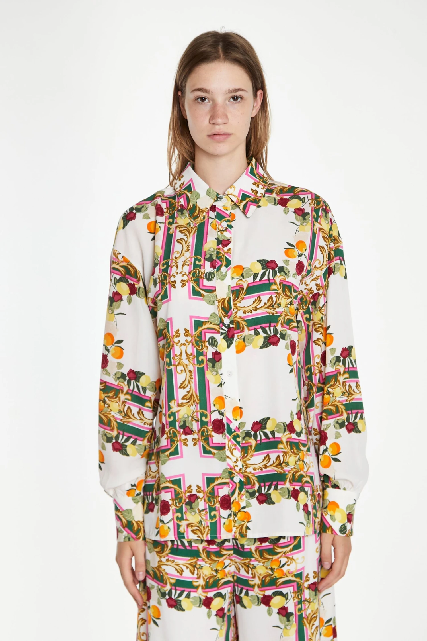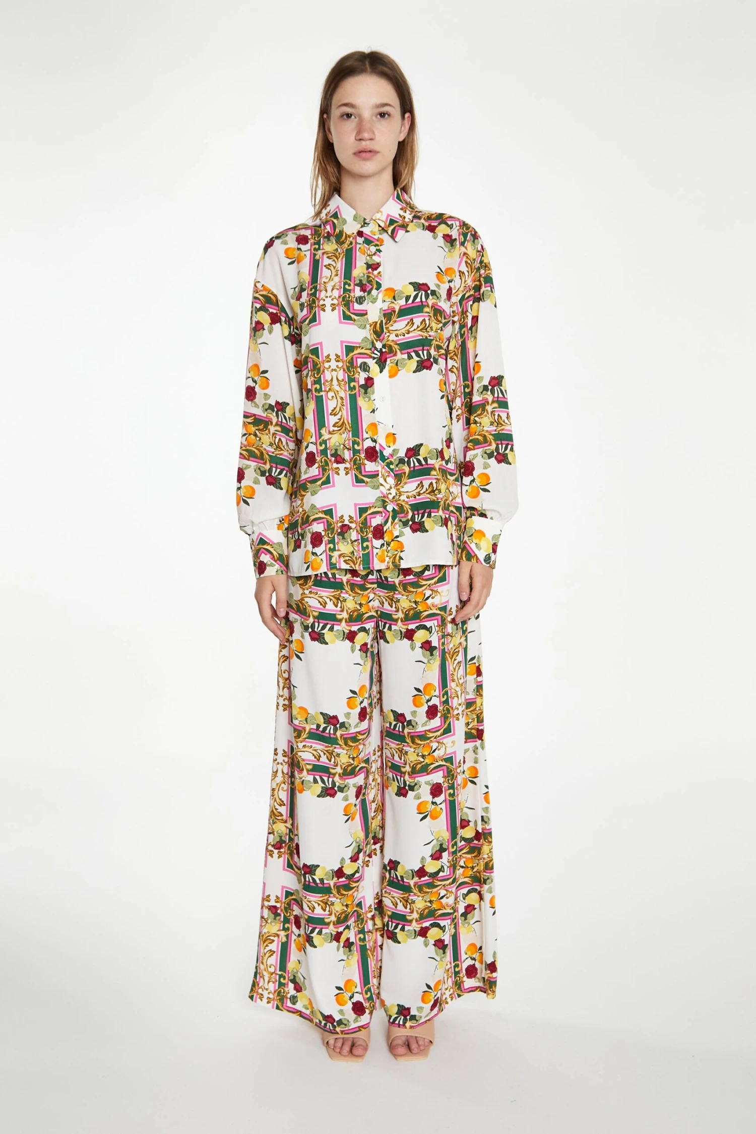 Glamorous Women’s Citrus Scarf Print Long Sleeve Shirt. This luxe citrus scarf print shirt will have you feeling and looking your best this summer. Featuring long sleeves and button-front detail, this timeless piece will be your go-to for every occasion. Taking you from beach to bar, looks great teamed with the matching Citrus Scarf Print Wide Leg Trousers.