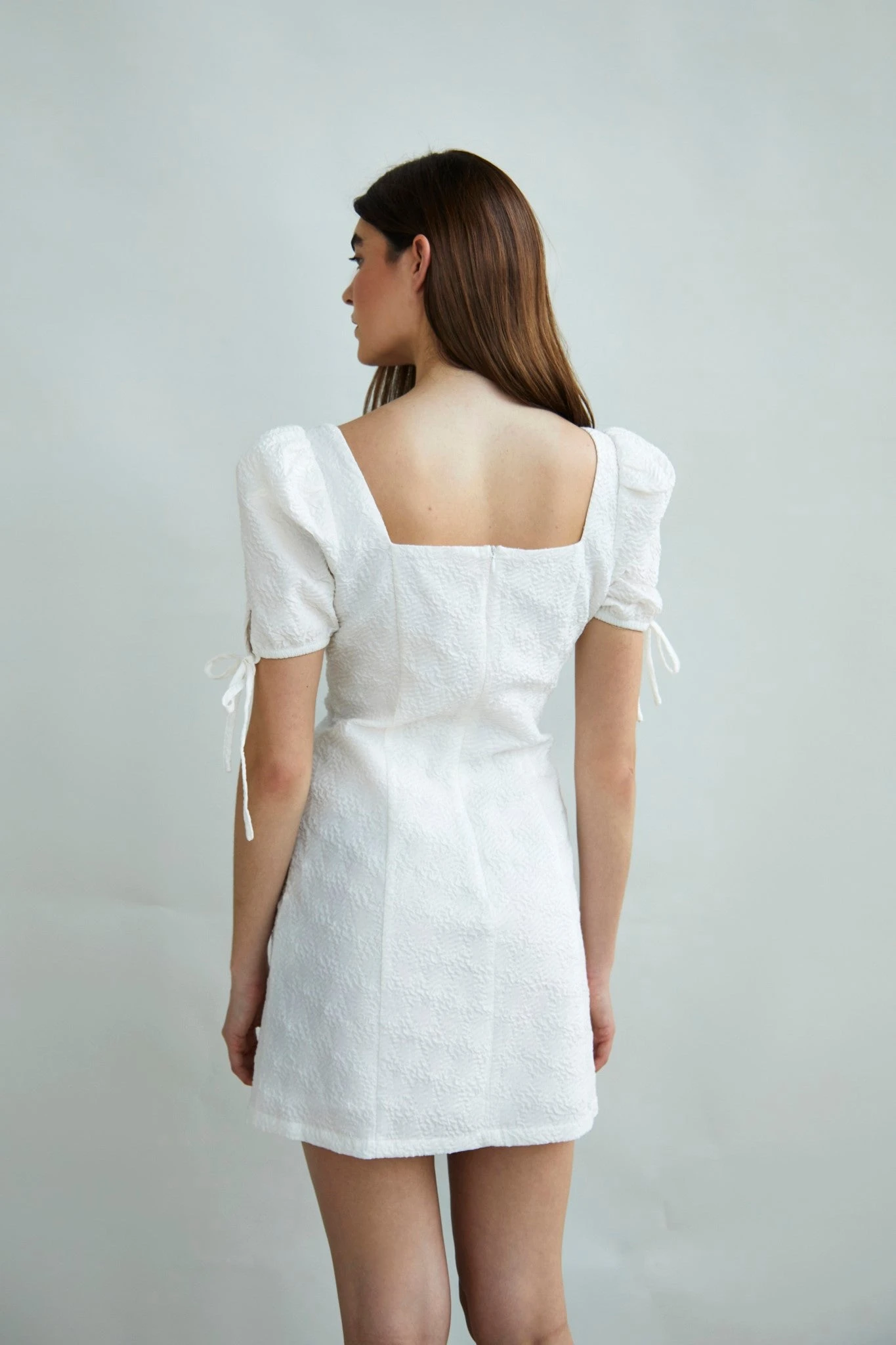 Glamorous Collection White Puff Sleeve Mini Dress with Tie Detail. This is the perfect addition to your summer wardrobe. Stylish and chic, featuring a sweetheart neckline, puff sleeves and tie details, this mini dress will be your go to for every occasion. Elevate the look with some strappy heels to take it from day to night.