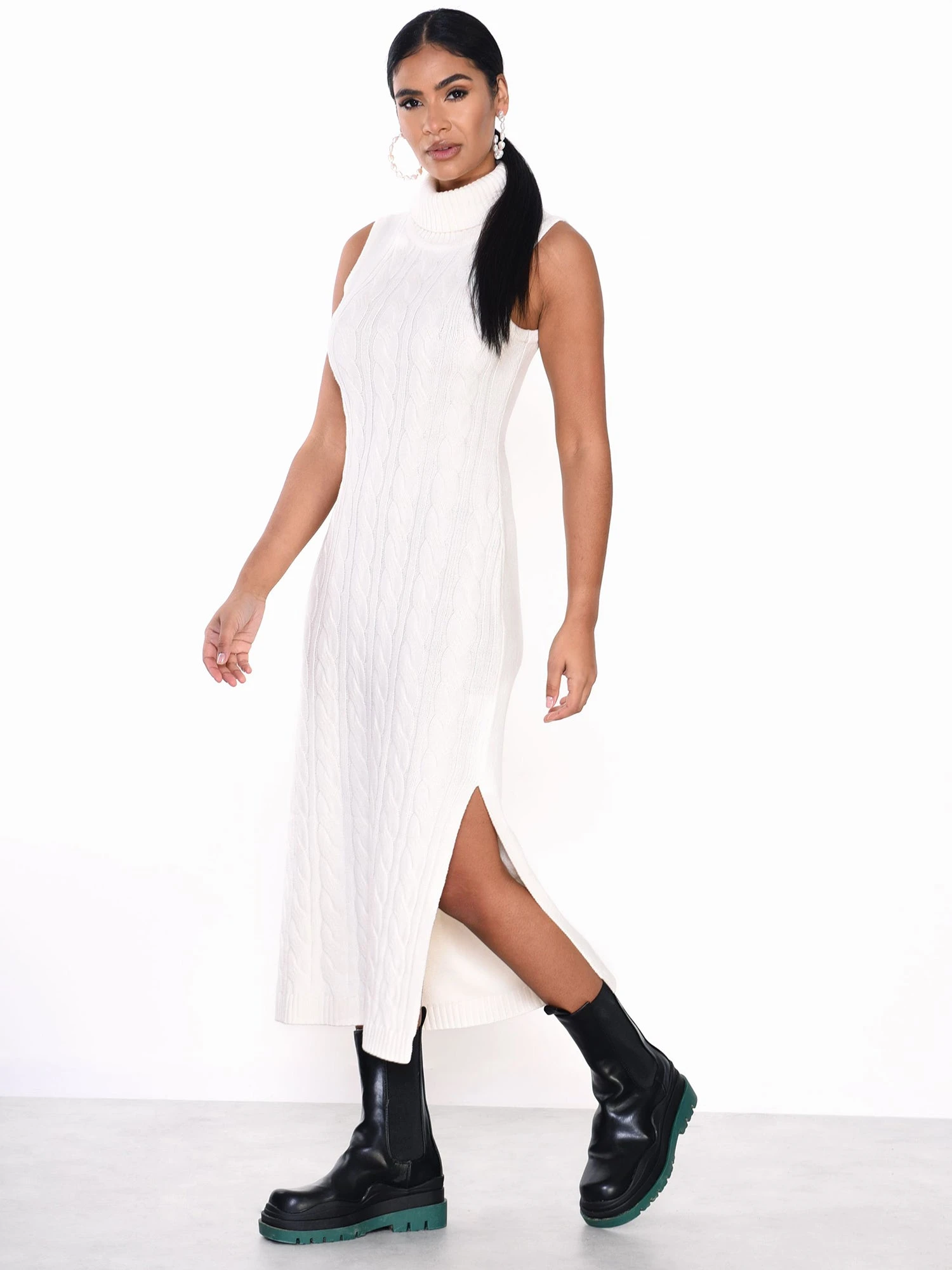 Glamorous Womens Cream side Split High Neck Knit Midi Dress. This super on trend midi dress is the must have staple piece this season. Featuring a midi style, side split detail and cable knit style this dress is super flattering addition to your closet! Style with your favourite high knee boots for the daytime and switch to heels for the evening.