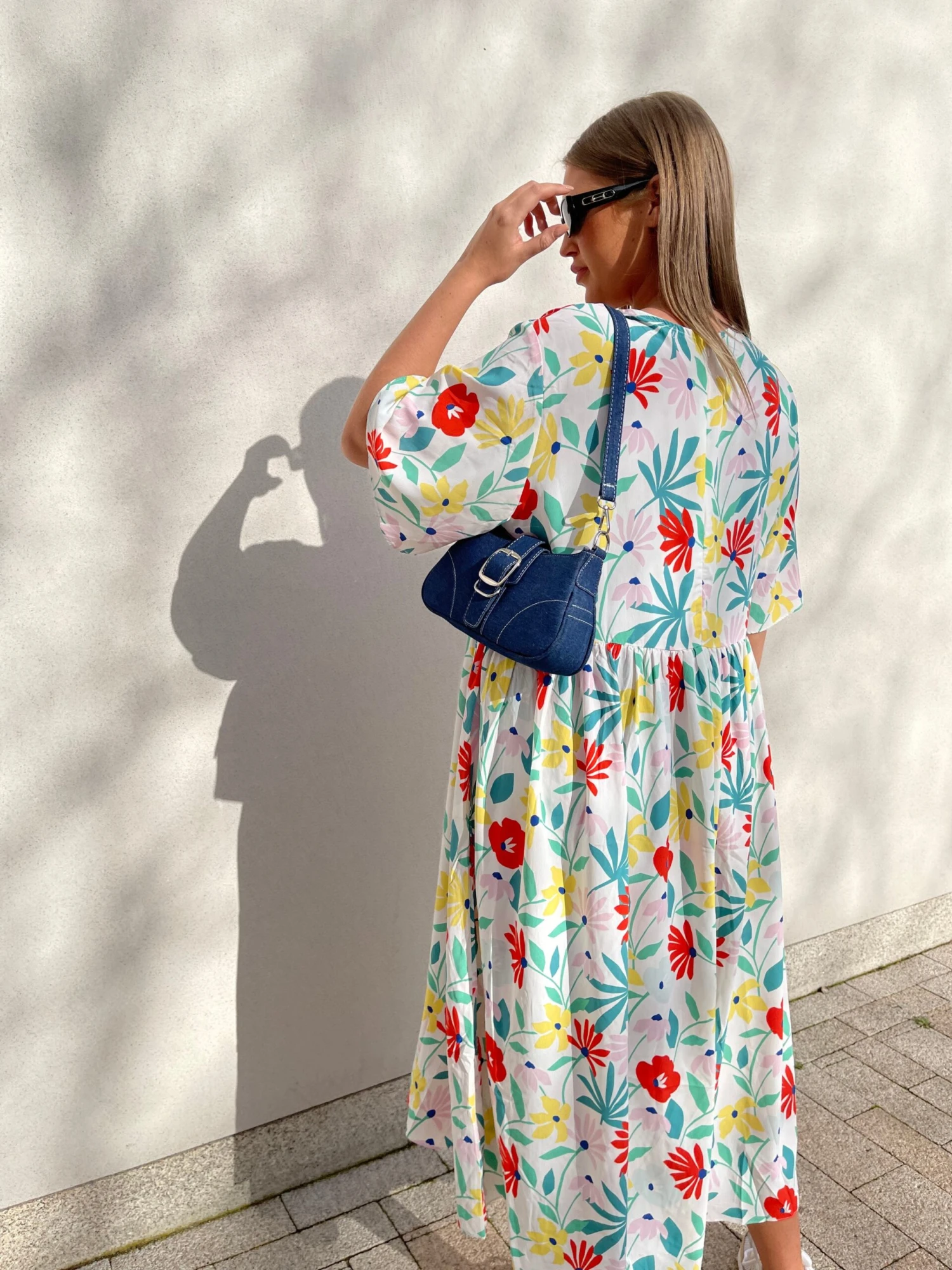 Glamorous Curve Bright Multi-Floral Midi Dress. Opt for a floral style with this feminine midi-dress. This statement style features a colorful floral print, short sleeves, and a voluminous cut. Style with strappy sandals and a grab bag for Spring.