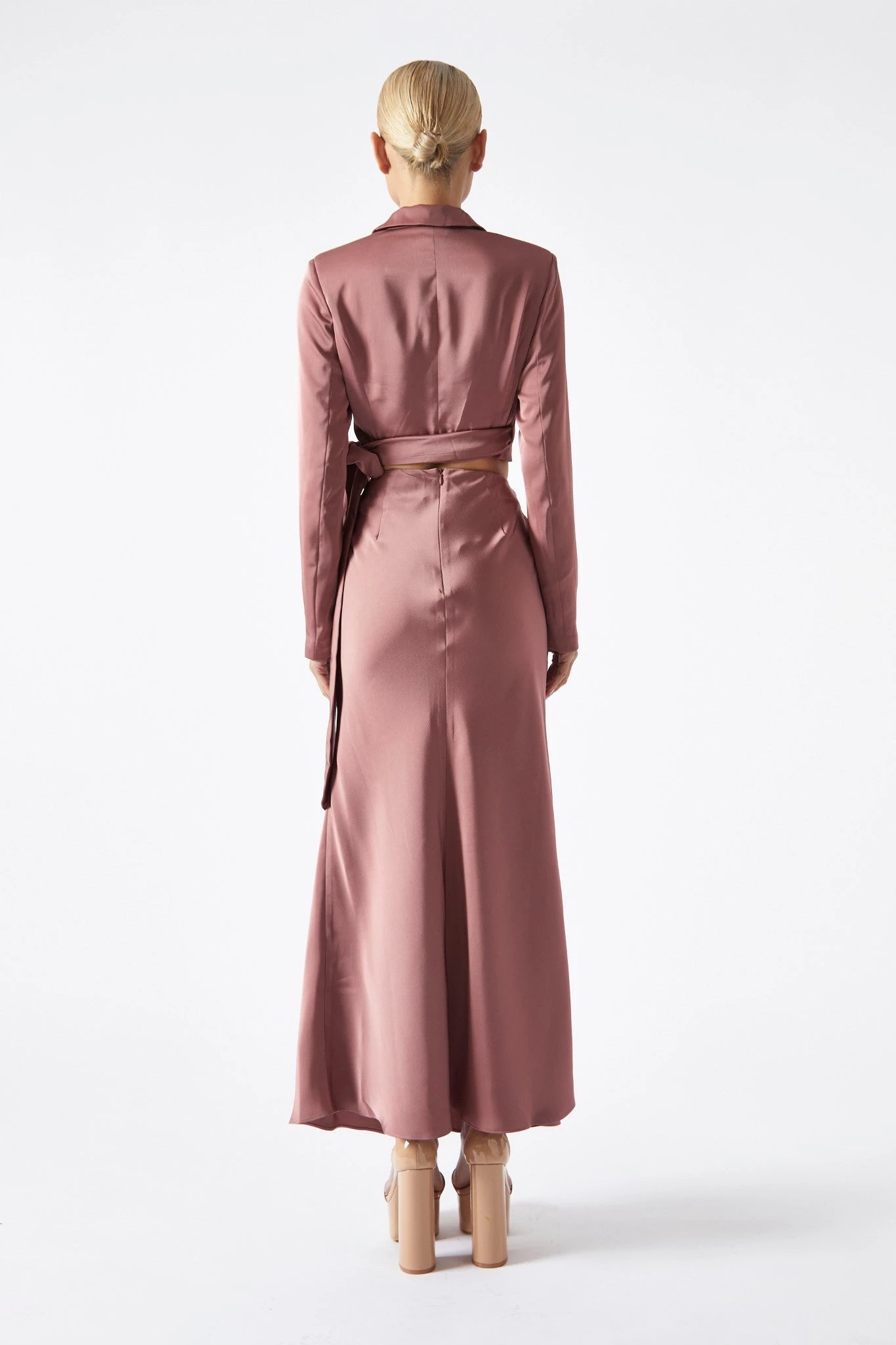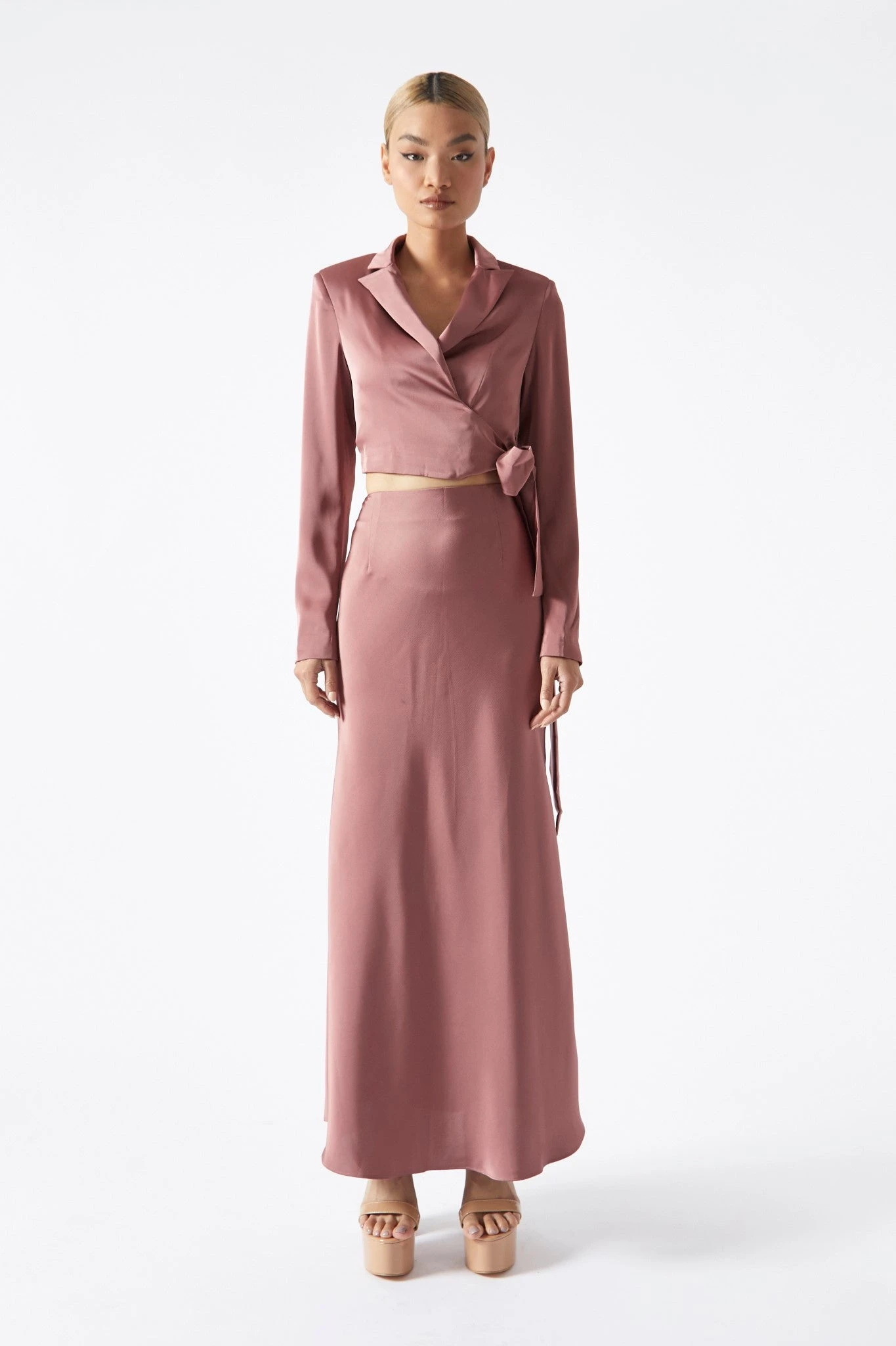 Glamorous Studio Womens Dark-Rose Wrap-Front Crop-Blazer. This gorgeous piece is destined for your wardrobe this season Featuring long sleeves, a cropped length, functioning wrap with tie detail and blazer style collar, this luxe satin top is the perfect way to elevate your look for autumn. Make sure to pair with the matching skirt and a stand out co ord moment.