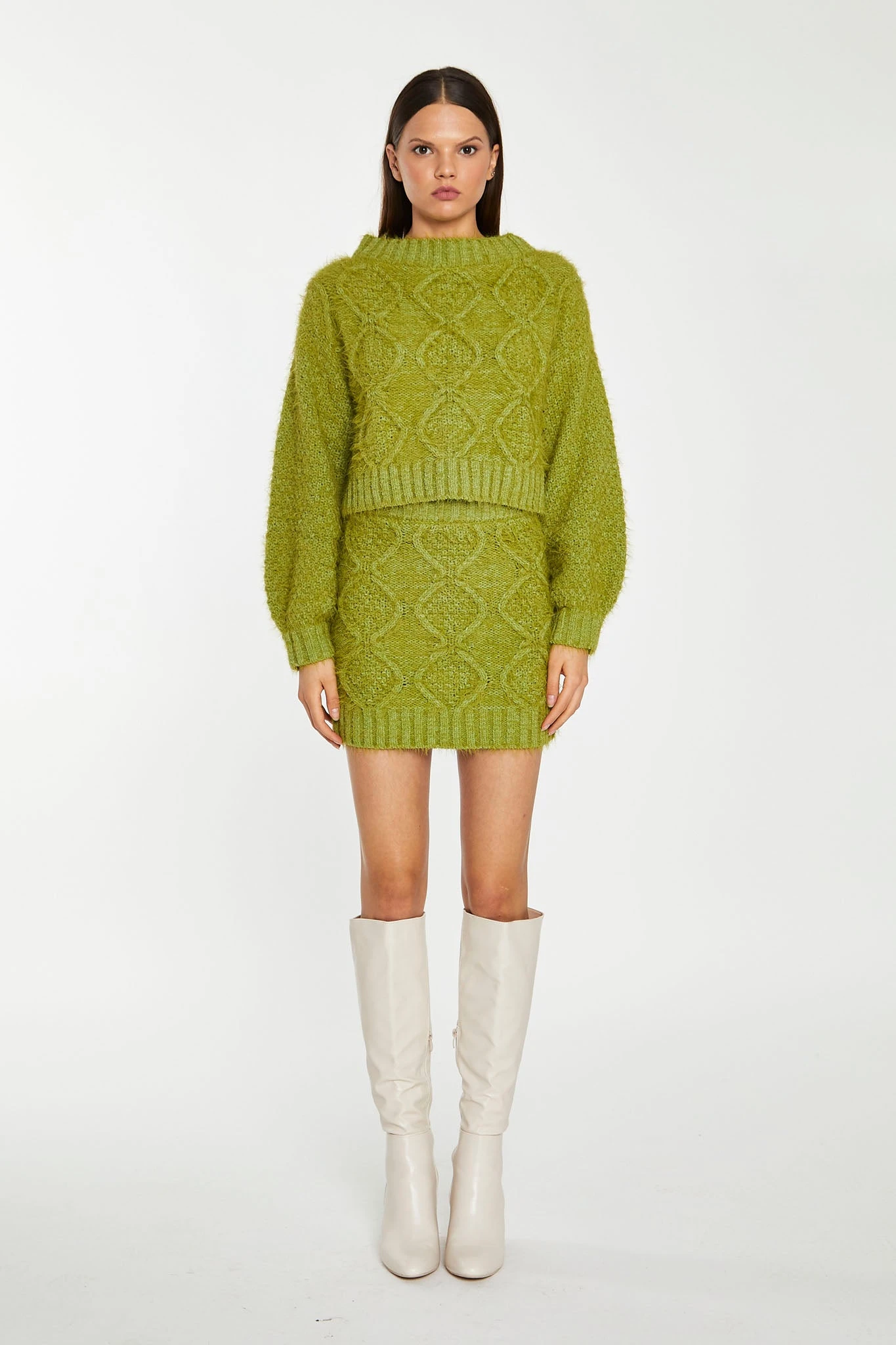 Glamorous Womens Grass-Green Cable-Knit Long Sleeve Jumper. Stay warm and stylish in this Cable-Knit Long Sleeve Jumper. With its matching skirt, cable knit design, classic crew neck jumper silhouette, and fluffy knit fabric, this jumper is sure to become your go-to look for chilly days!