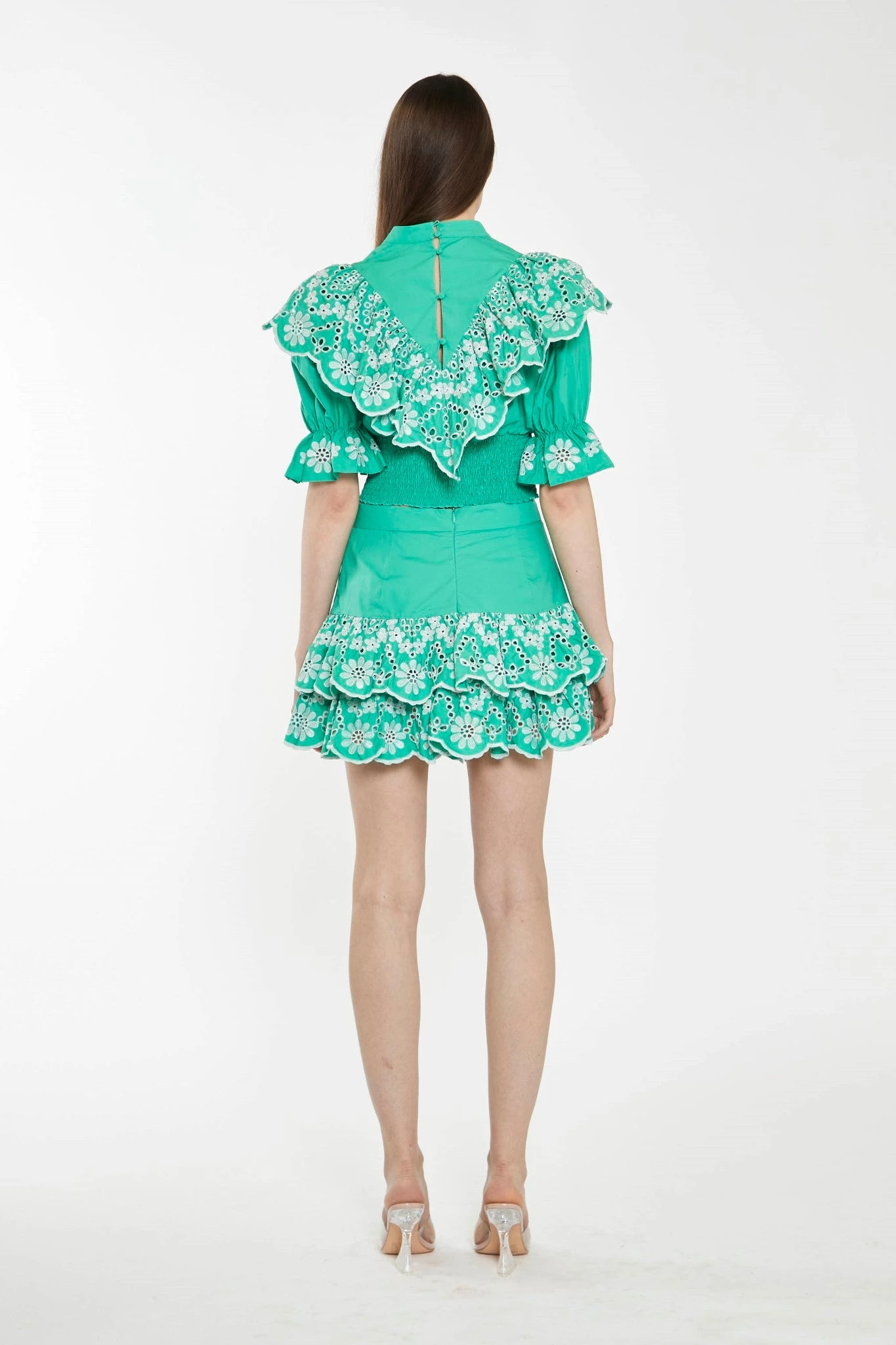 Glamorous Womens Green Broderie Ruffle Mini Skirt. This statement piece will look great this season. Featuring broderie ruffle detail in a flattering mini fit, this gorgeous piece is the perfect way to elevate your look for Spring. Style with our matching top and your favourite heels to complete the look.