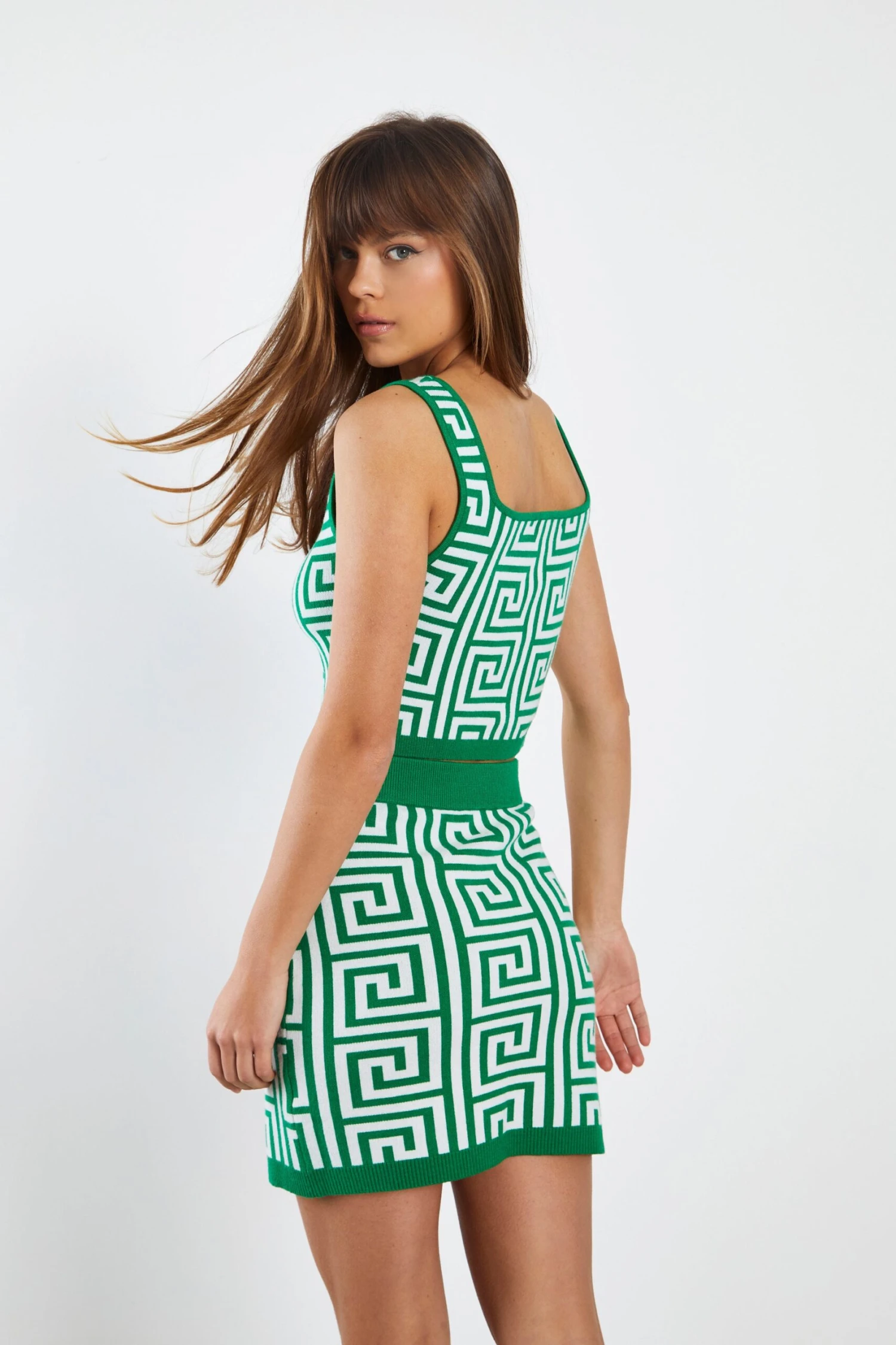 Glamorous Green Geo Knit Mini Skirt. Opt for colour with this fun geo intarsia knit design mini skirt. Style with matching top and cardigan and platform boots for a full co-ord look!