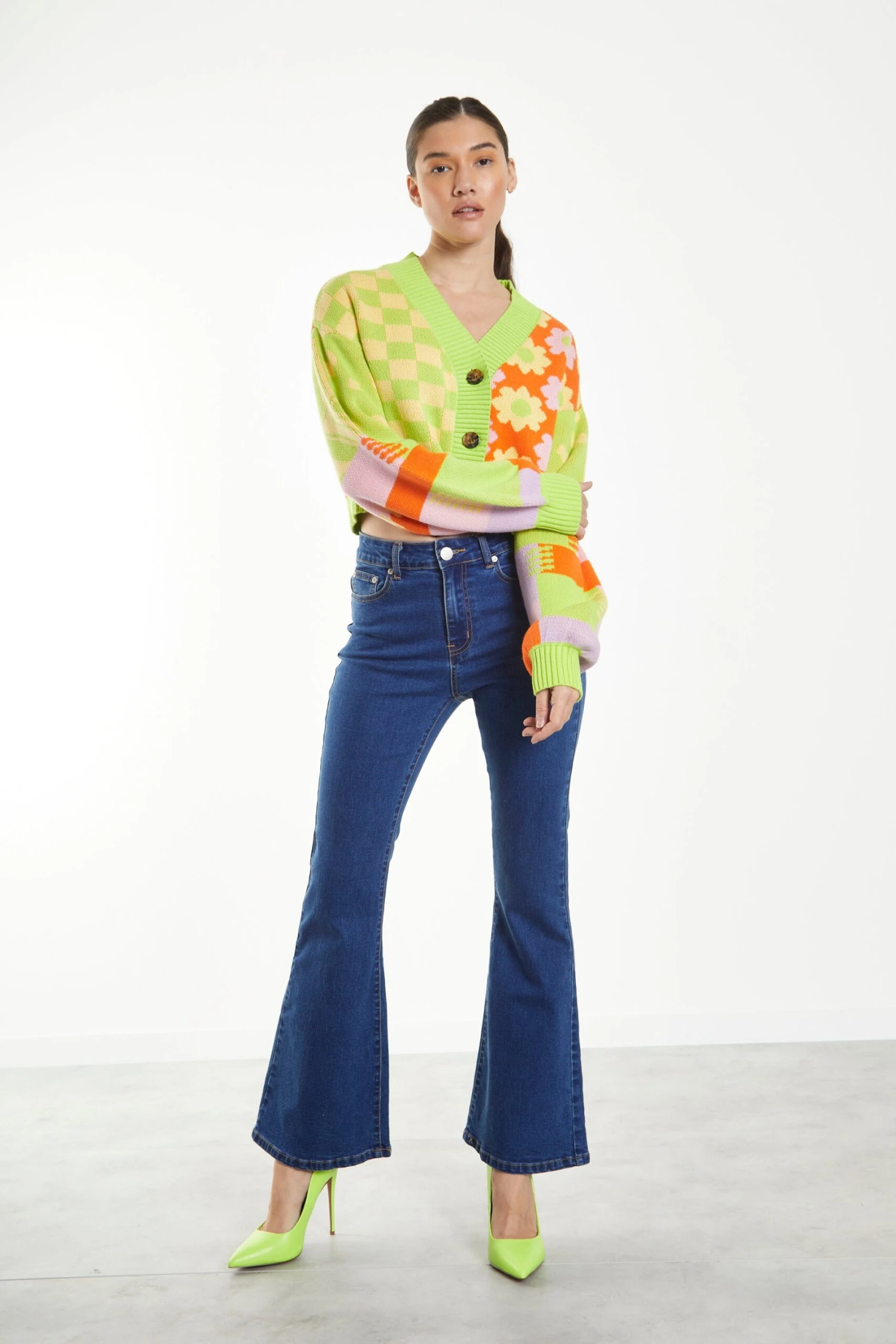Glamorous Green Orange Multi Knit Cardigan. Add a pop of colour to your wardrobe with this fresh bold green and orange knitted cardigan. Featuring an on trend knit design and flattering crop fit this cardigan is perfect for you. Style with jeans and boots to complete the perfect look for this season!