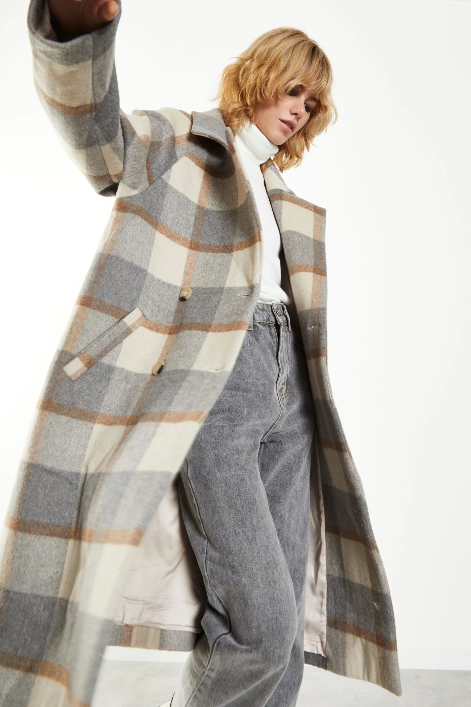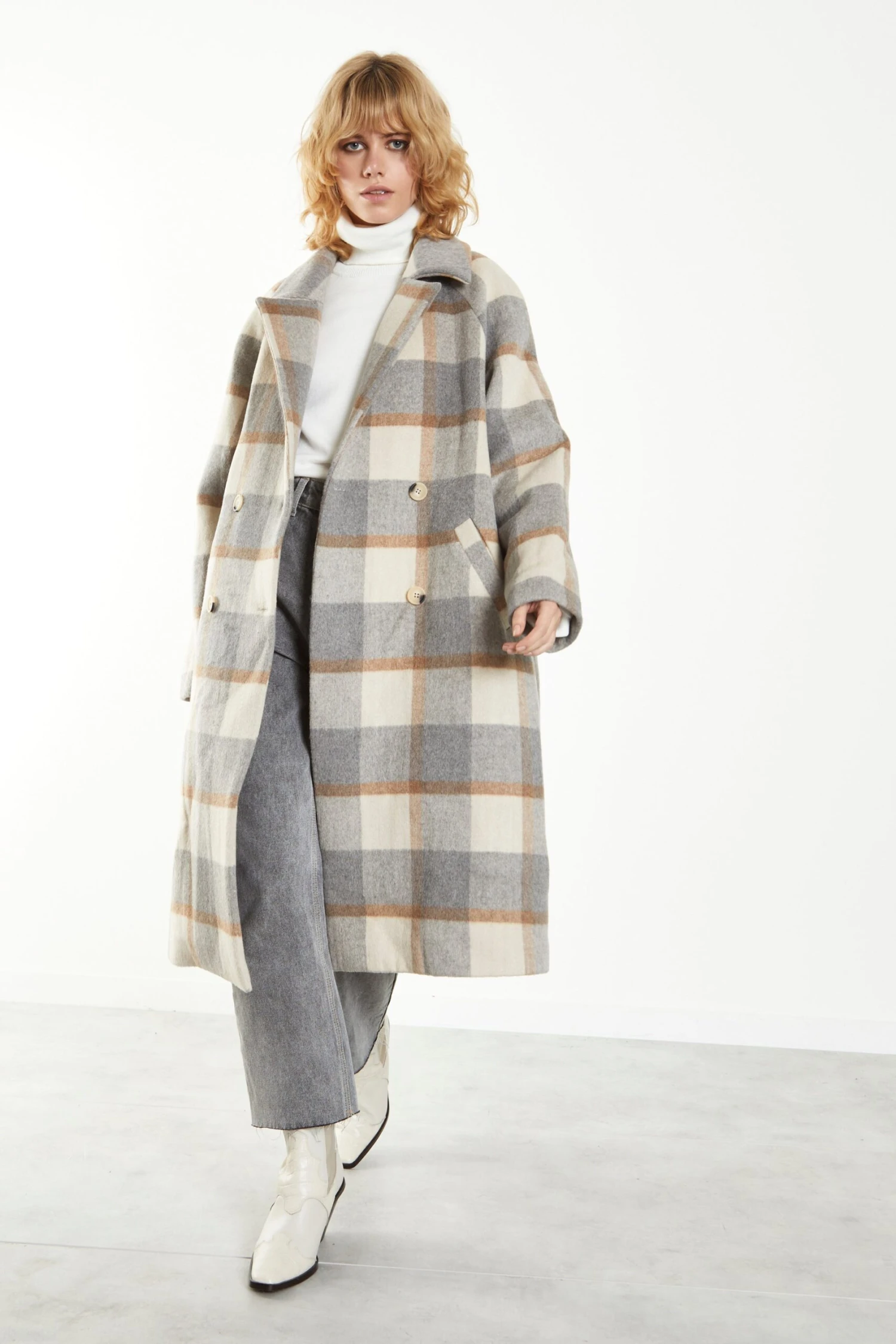 Glamorous Grey Cream Check Double Breasted Midi Coat with Lapel Collar. Stay cosy this season and layer up with this midi length coat. Featuring a double breasted fit and lapel collar, this check coat is a must have for your autumn wardrobe. Â