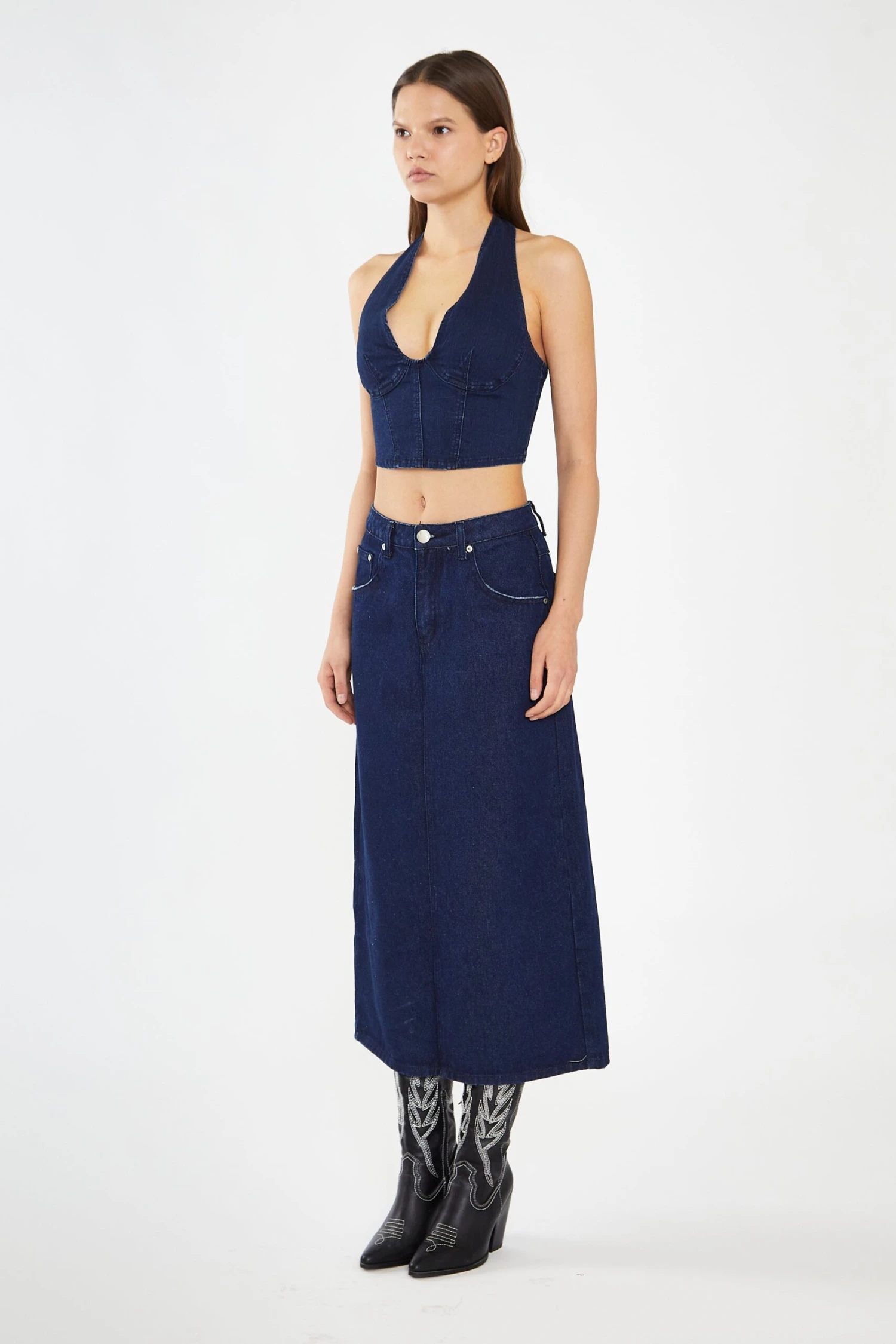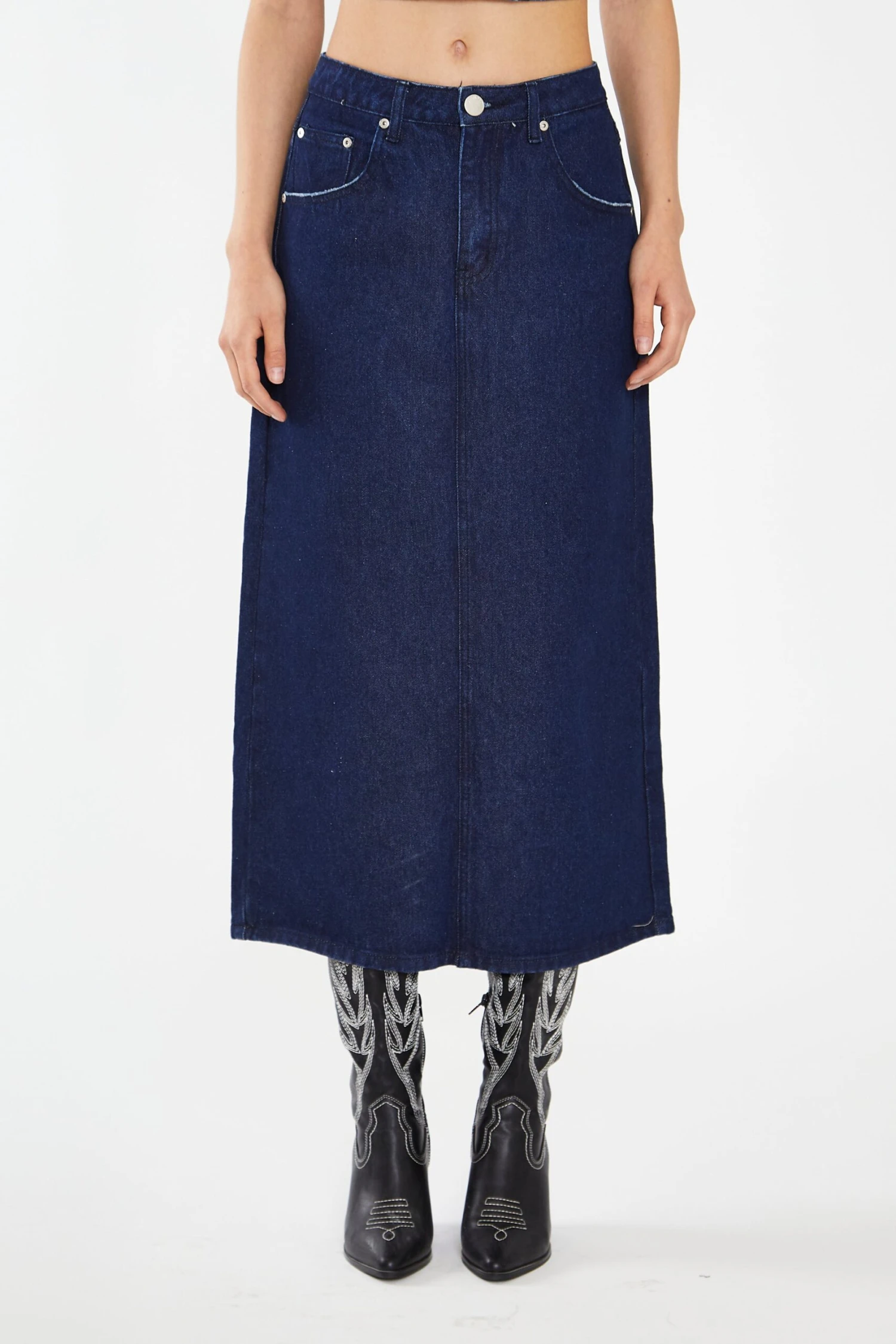 Glamorous Womens Indigo-Blue Front Split Denim Maxi-Skirt. Add a pop of colour to any look with this versatile denim midi skirt! In a stylish indigo hue, this denim skirt pairs perfectly with crop top and trainers for an effortlessly chic look. Outfitted with pockets and a comfy waistband, this skirt lets you look good and feel great all day long.