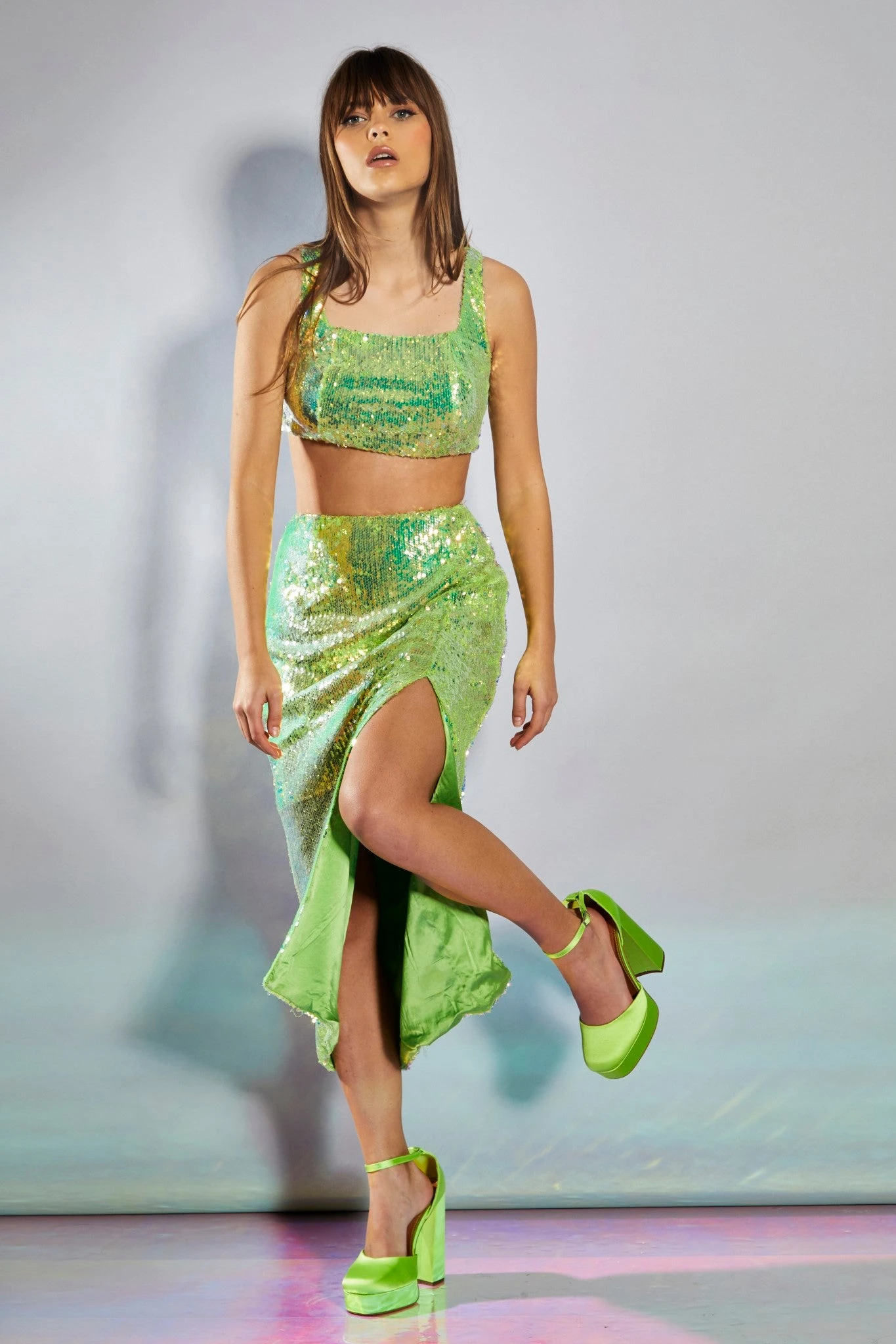 Glamorous Iridescent Line Sequin Midi Pencil Skirt with Side Split. This gorgeous skirt is an absolute show stopper! Featuring a side split and midi length all in a show stopping lime sequin fabric, we love this piece here at Glamorous. Style with matching crop top for the perfect co-ord vibe this party season.
