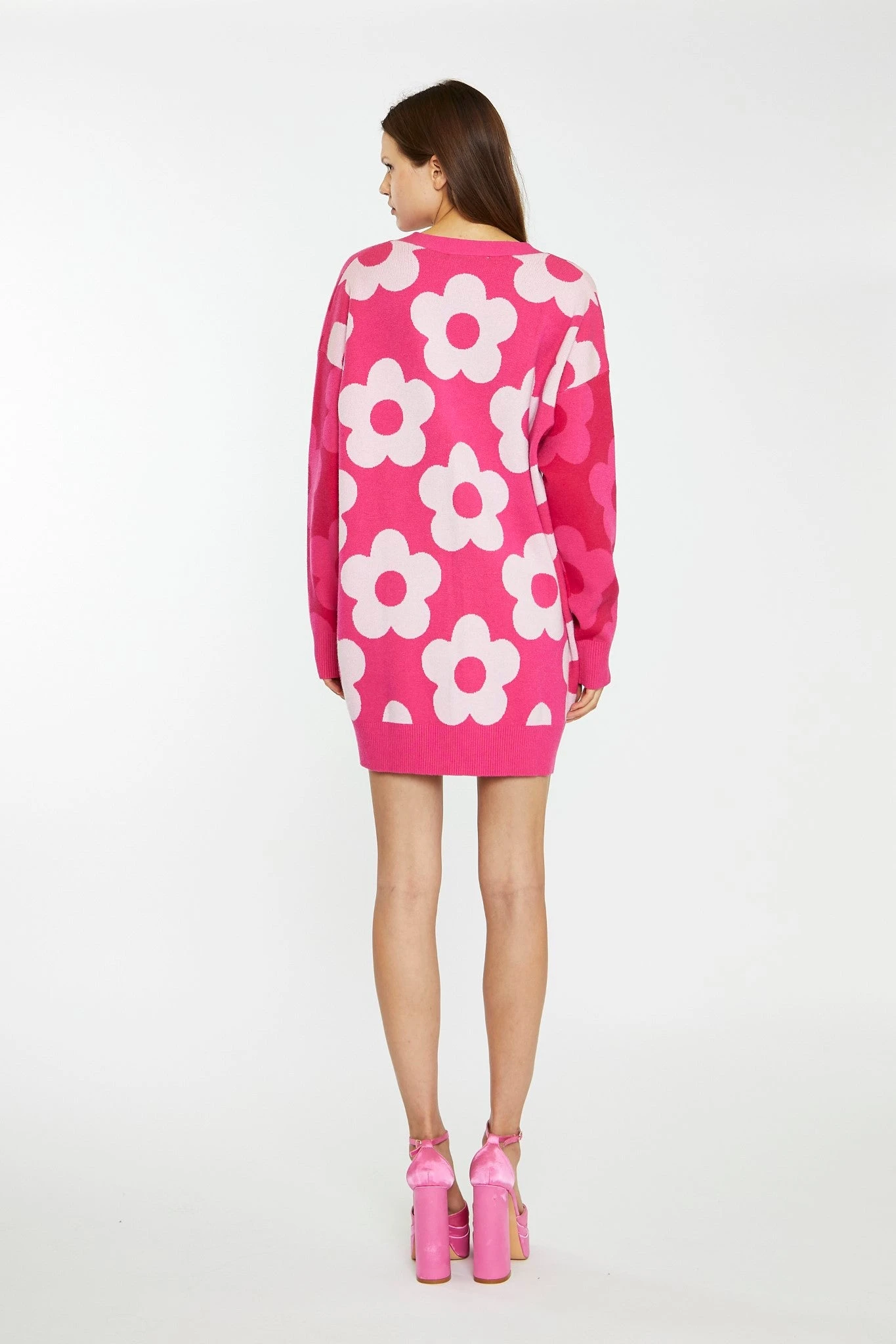 Glamorous Womens Large Pink Flower Long-Line Cardigan. Brighten up the colder months and stay warm and cosy in this long line pink cardigan. Featuring a contrasting colour floral knit design and ribbed cuff and hem detailing, this button down cardigan is such a fun number to add to your wardrobe! Pair with a pair of straight fit jeans for a fun day time look!