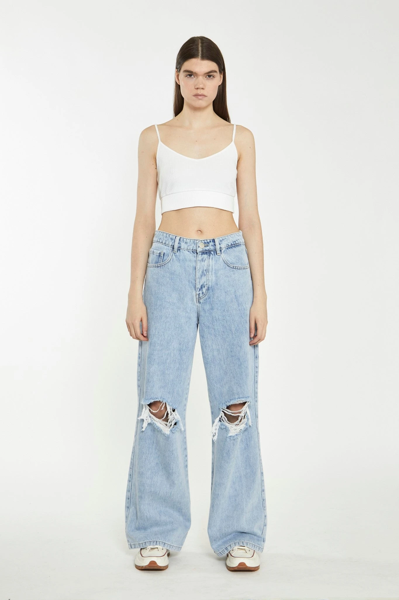 Glamorous Womens Light Stonewash Wide-Leg Ripped Jeans. These staple jeans are perfect for your Spring wardrobe. Featuring ripped knee detail with a flattering wide leg fit, these jeans will be your go to for every occasion. Pair with a basic tank top and your favourite trainers an effortless fashion forward look.