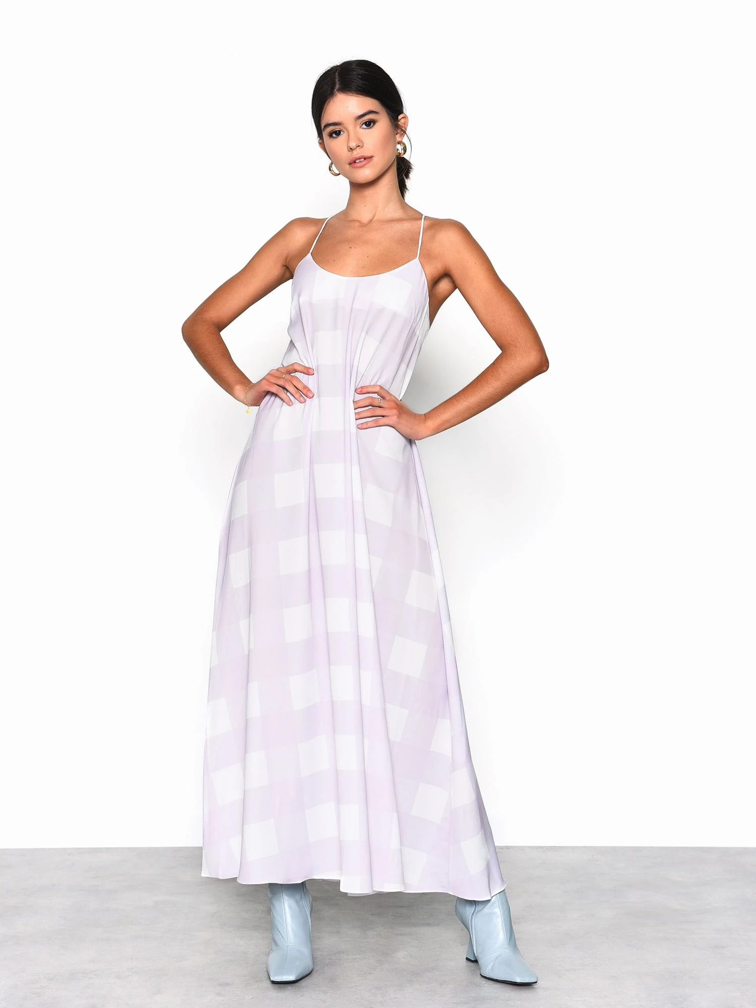 Glamorous Womens Lilac Checkerboard Print Midi Dress. This lilac checkerboard print dress in midi length is the must have staple piece this season. Featuring a check print all around and back strap detailing, this dress is super flattering addition to your closet!