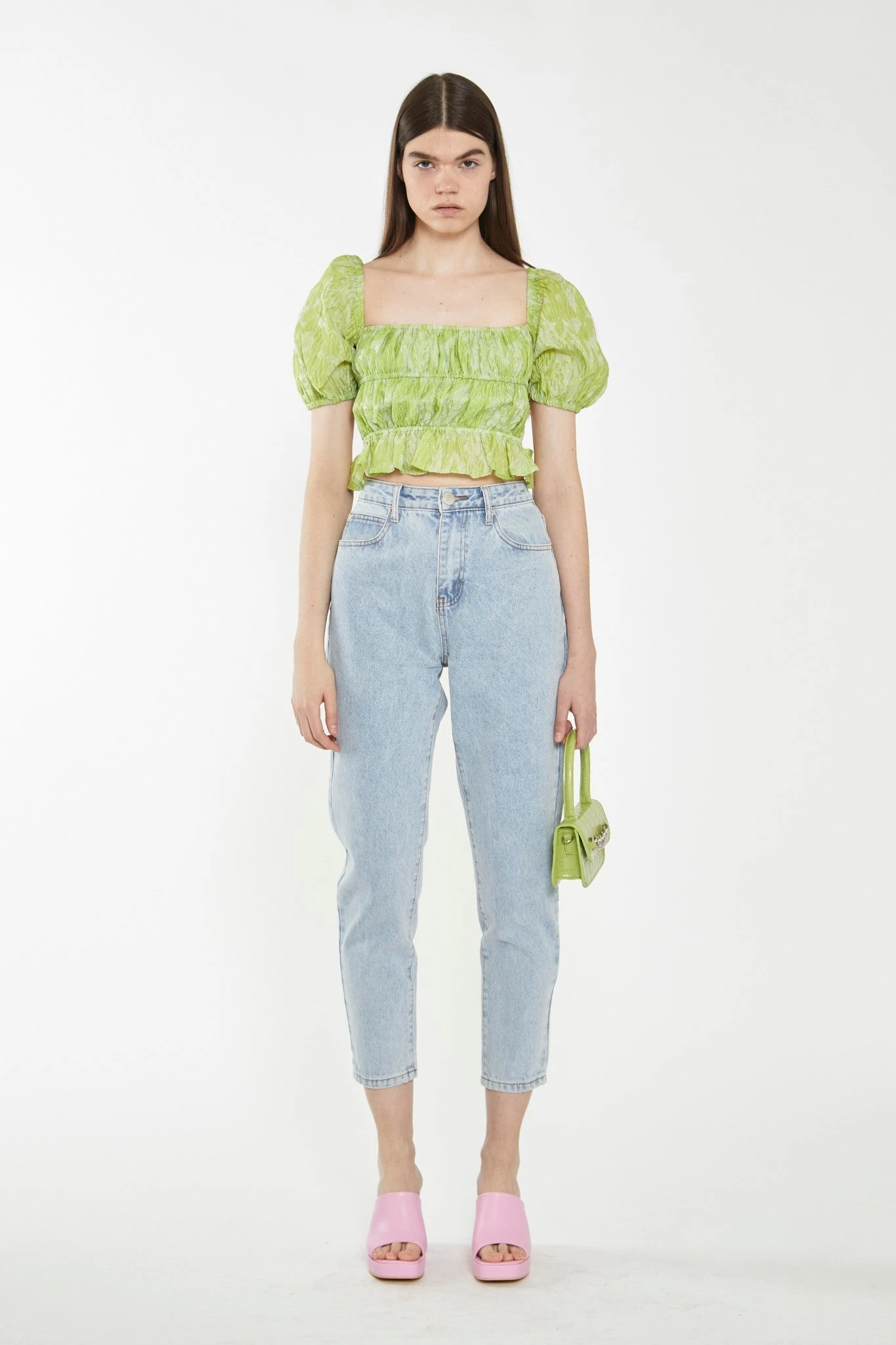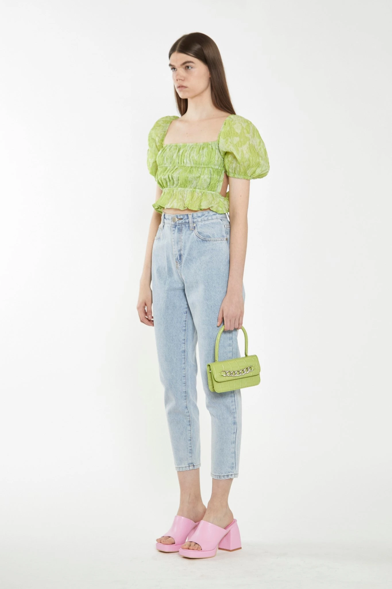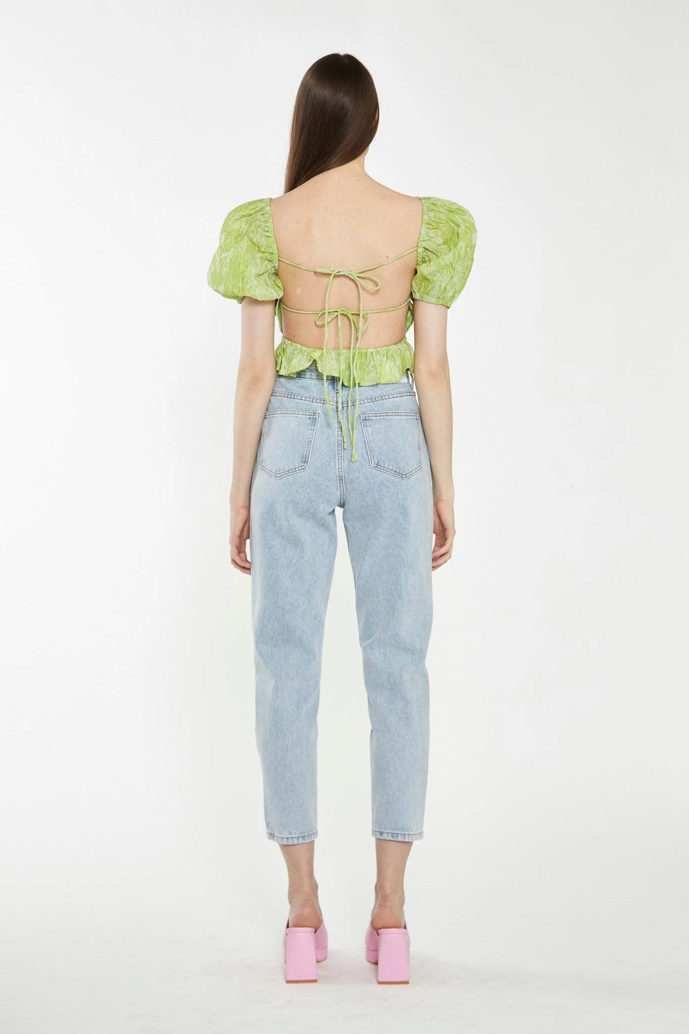 Glamorous Womens Lime Organza Jacquard Open-Back Top. This cute crop top will look great on you this Spring. Featuring a gathered bodice, puff sleeves and an open back with tie detail, this piece is a super flattering addition to your wardrobe. Looks fab paired with your favourite jeans and some heeled mules for the ultimate stylish look!Â