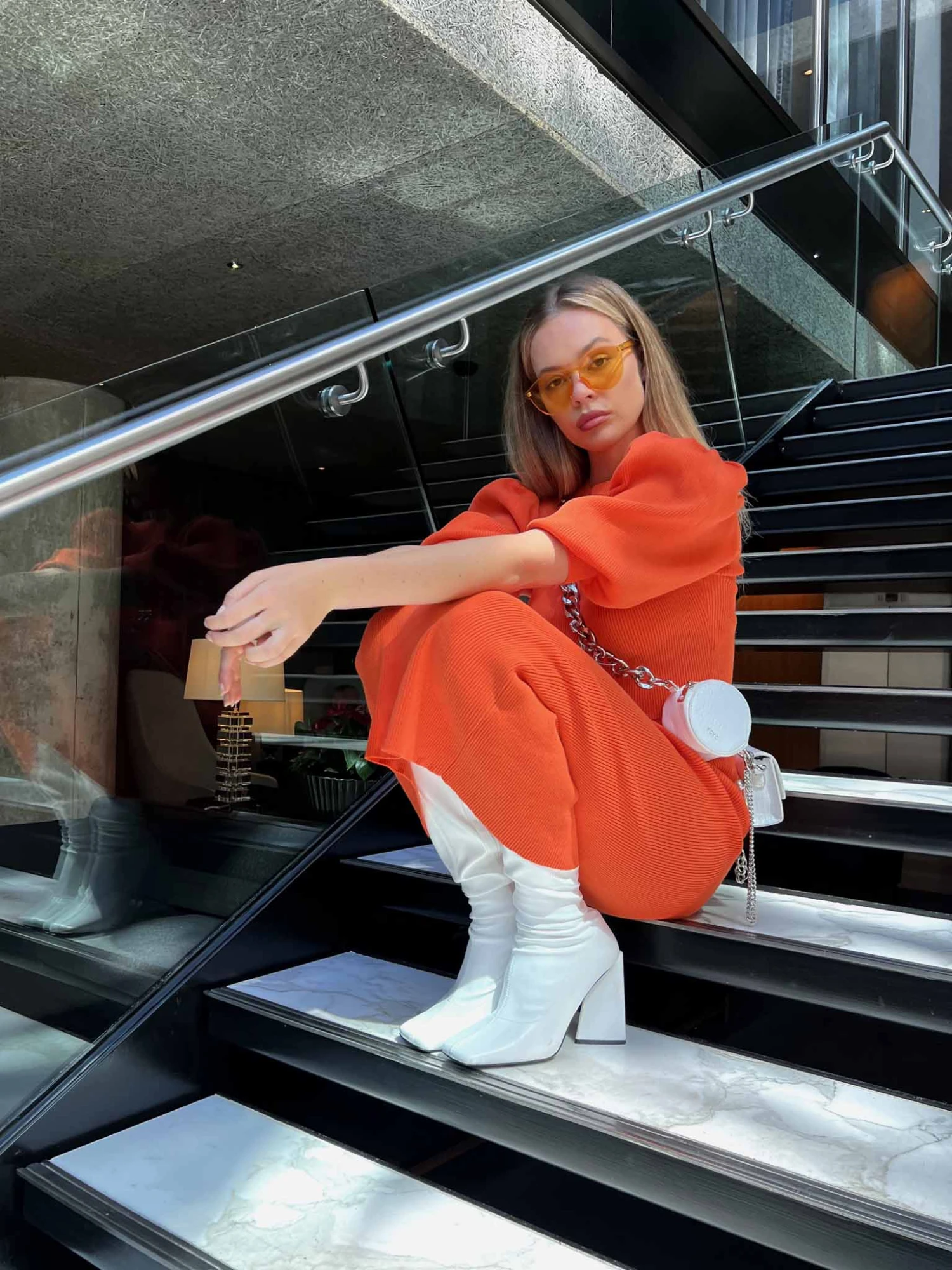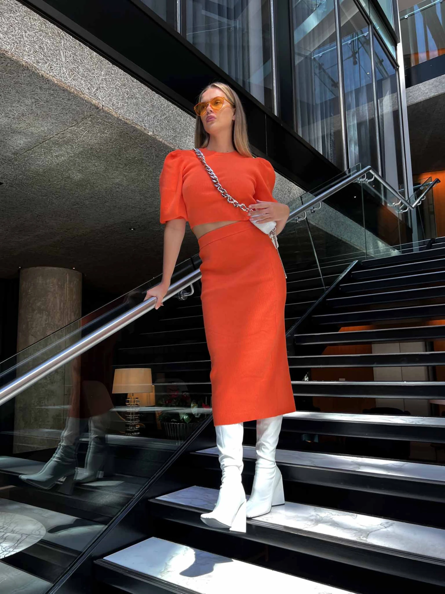 Glamorous Mandarin Orange Low Waisted Midi Skirt. Opt for colour with this bright mandarin orange knitted skirt. With a midaxi length design, pair this skirt with matching co-ord jumper for the ultimate winter days outfit. Â