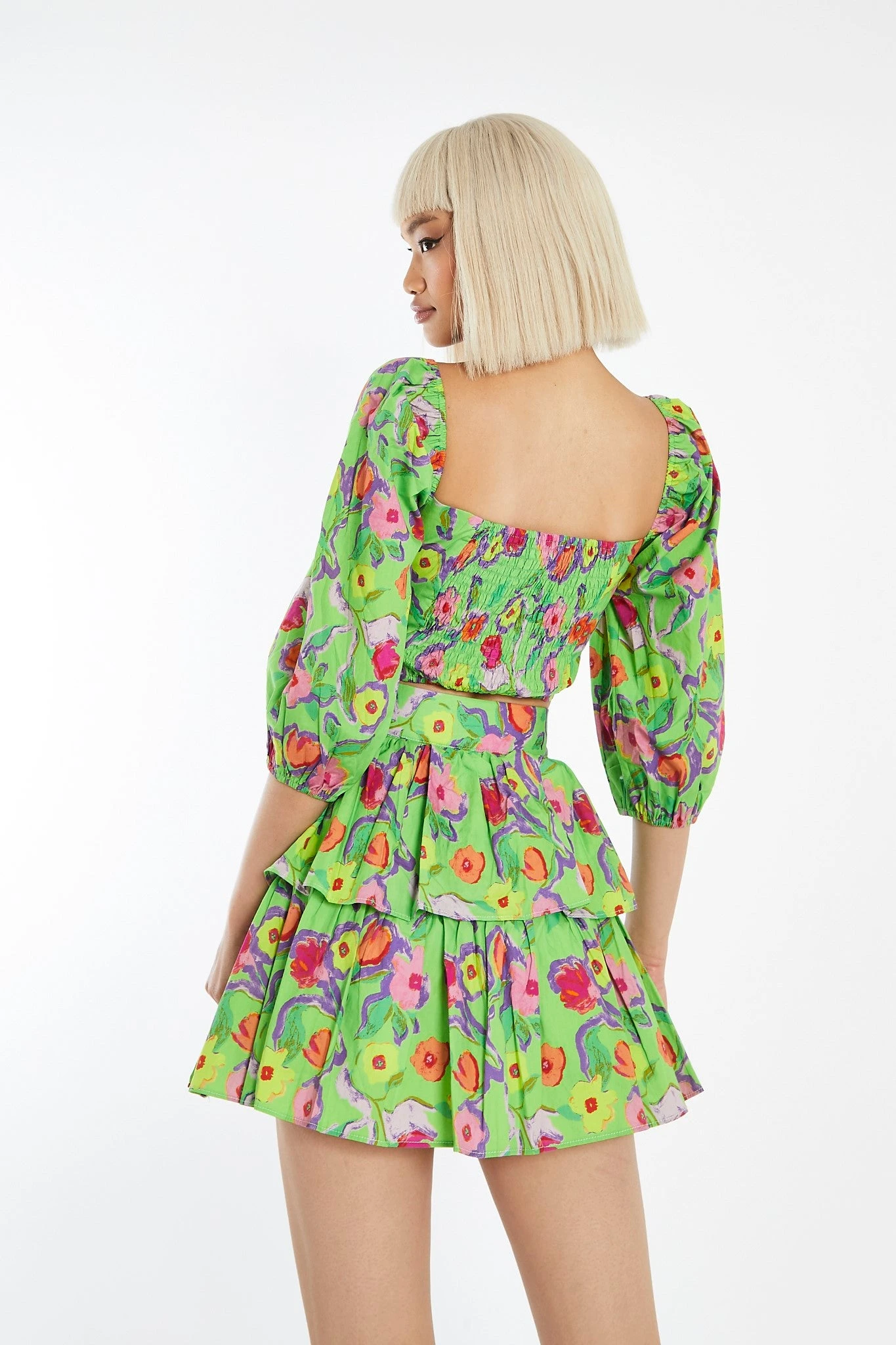 Glamorous Collection Womens Neon-Green Floral Twist Front Puff Sleeve Crop-Top. This gorgeous top is an absolute must have! Featuring a twist front design, puff sleeves and a shirred back panel, not only is this top super comfortable and stylish, but the bold print is an absolute show stopper! Pair with matching co-ord skirt for a bold look, or style with your favourite jeans for a more casual spring look.