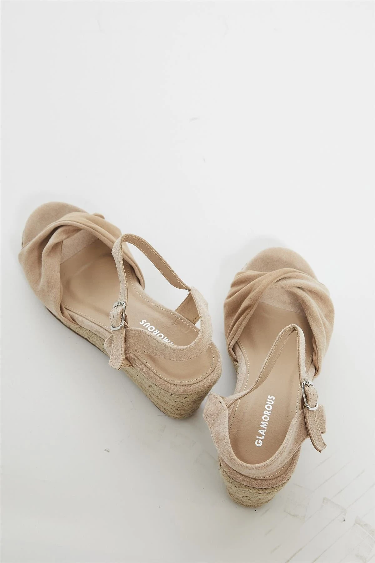 Glamorous Nude Twist Front Wedge Sandals. Have the height without the hassle with these wedge sandals! Featuring a chic twist front strap in an espadrille wedge style, these sandals are the ultimate wardrobe staple. The perfect basics to finish any outfit to give it that chic fashion forward feel. Heel Height: 8.5cm Composition: Upper: 100% -, Inner: 100% Textile, Outer: 100% Thermoplastic Rubber