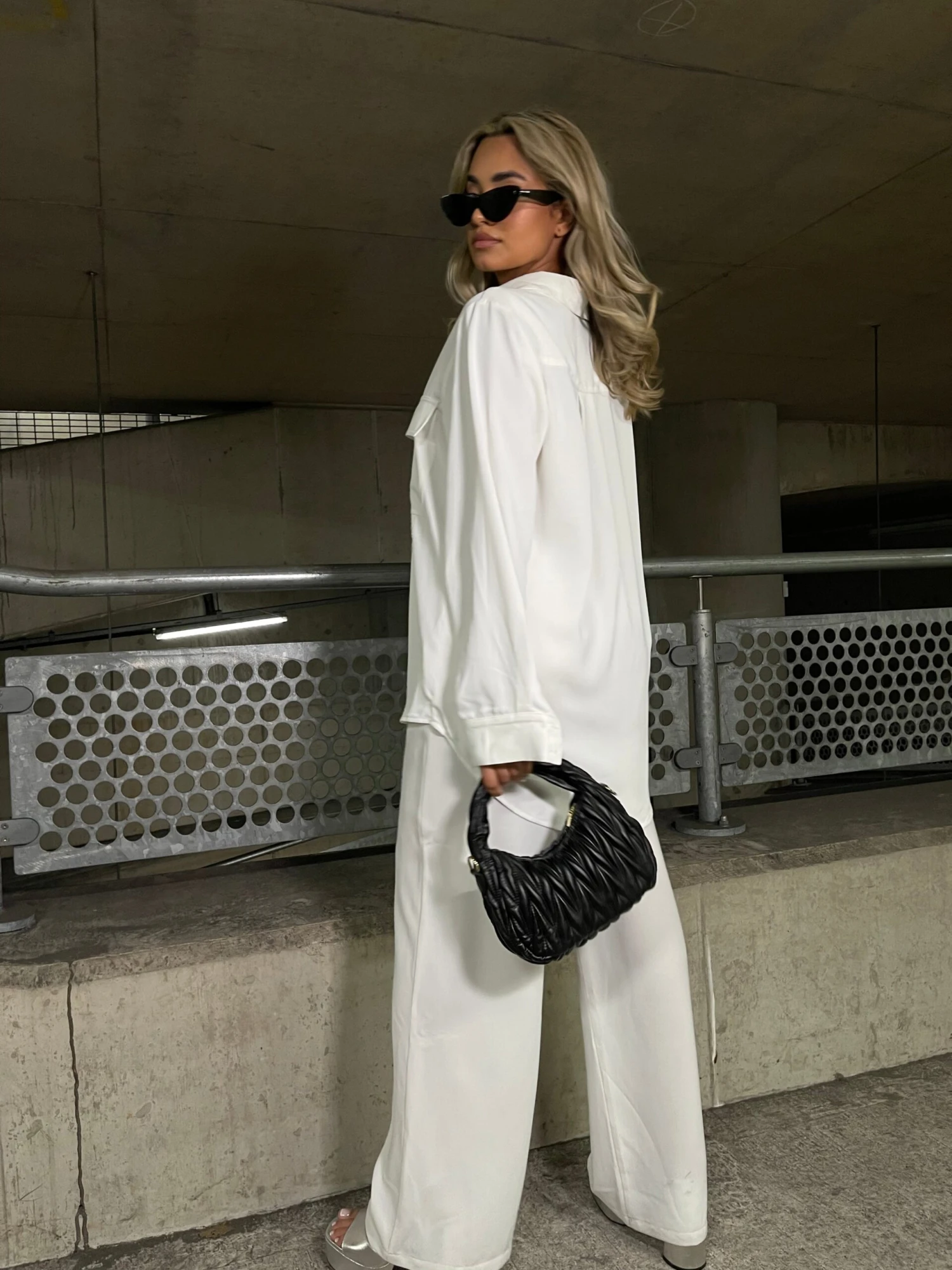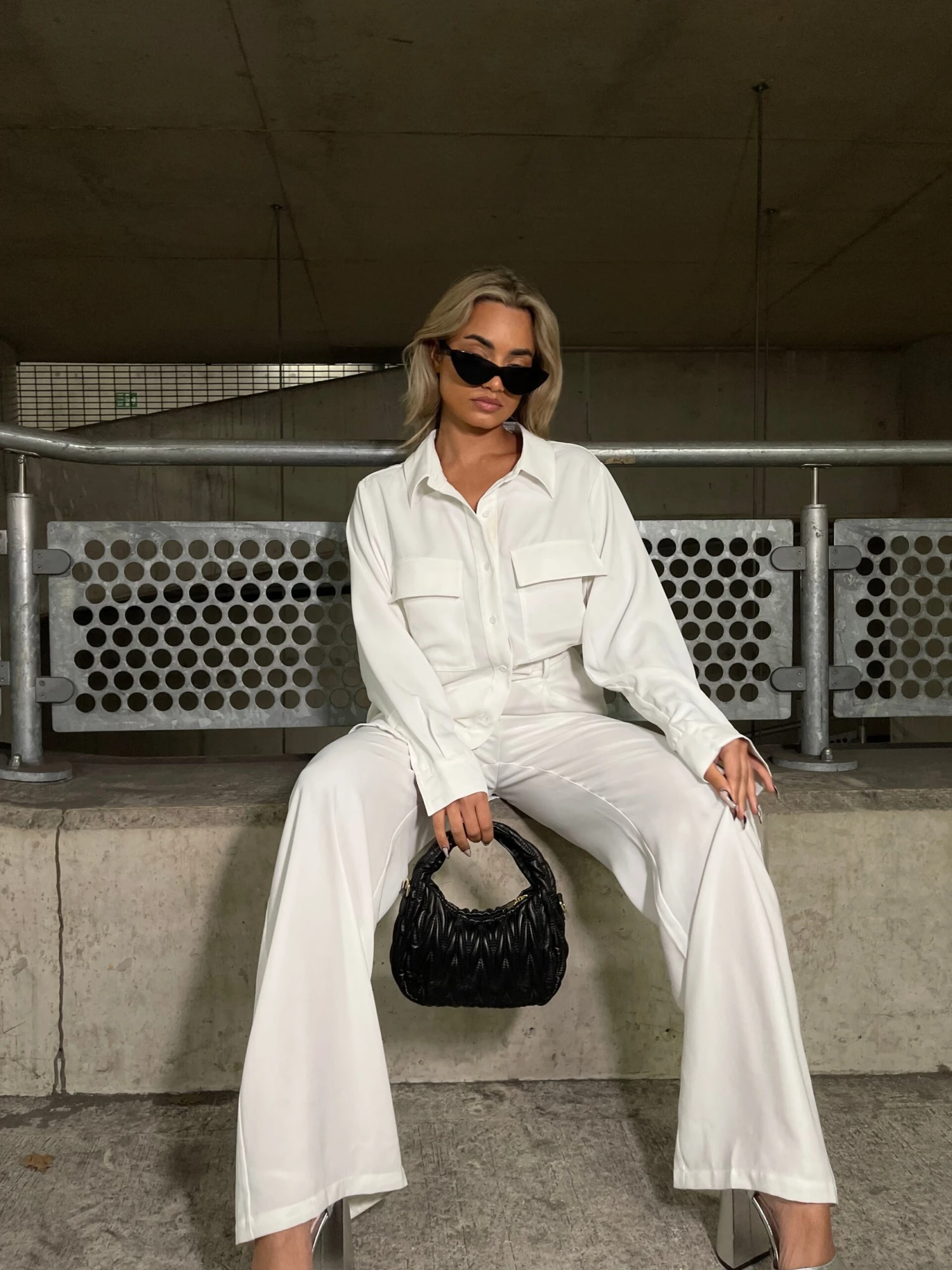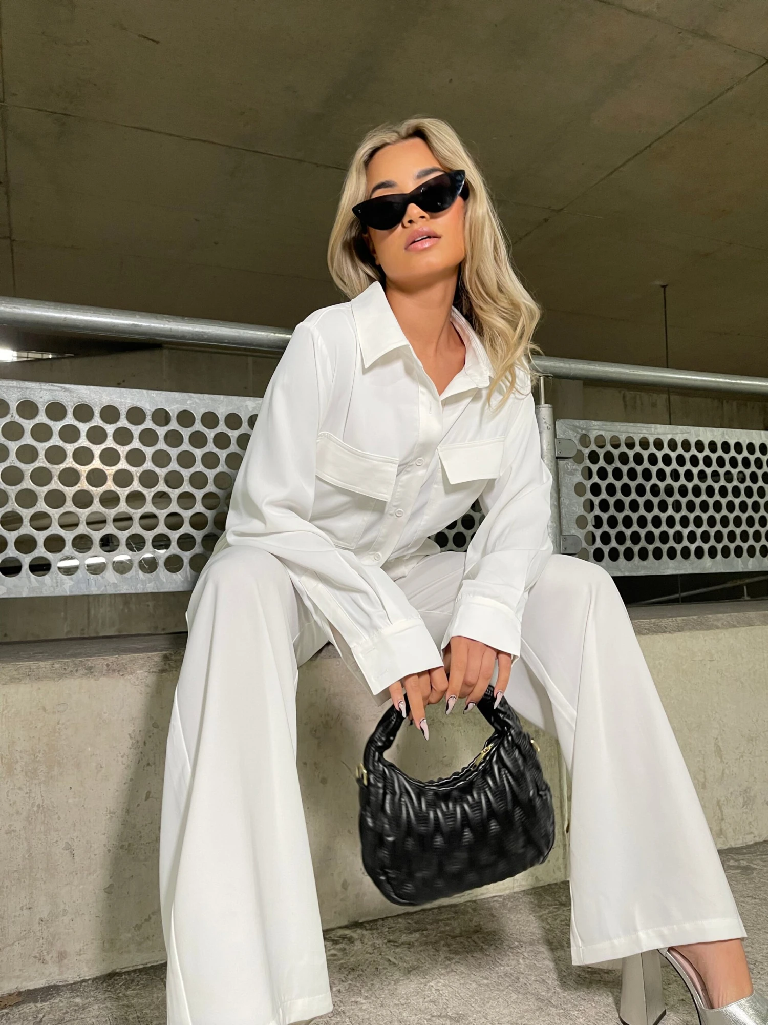 Glamorous Studio Womens Off White Oversized Utility -Shirt. Stay stylish and organized in this white long sleeve shirt with big pockets and a classic collar. Carry your essentials with ease while looking sharp and dapper. Perfect for any occasion, this shirt is a must-have in your wardrobe.