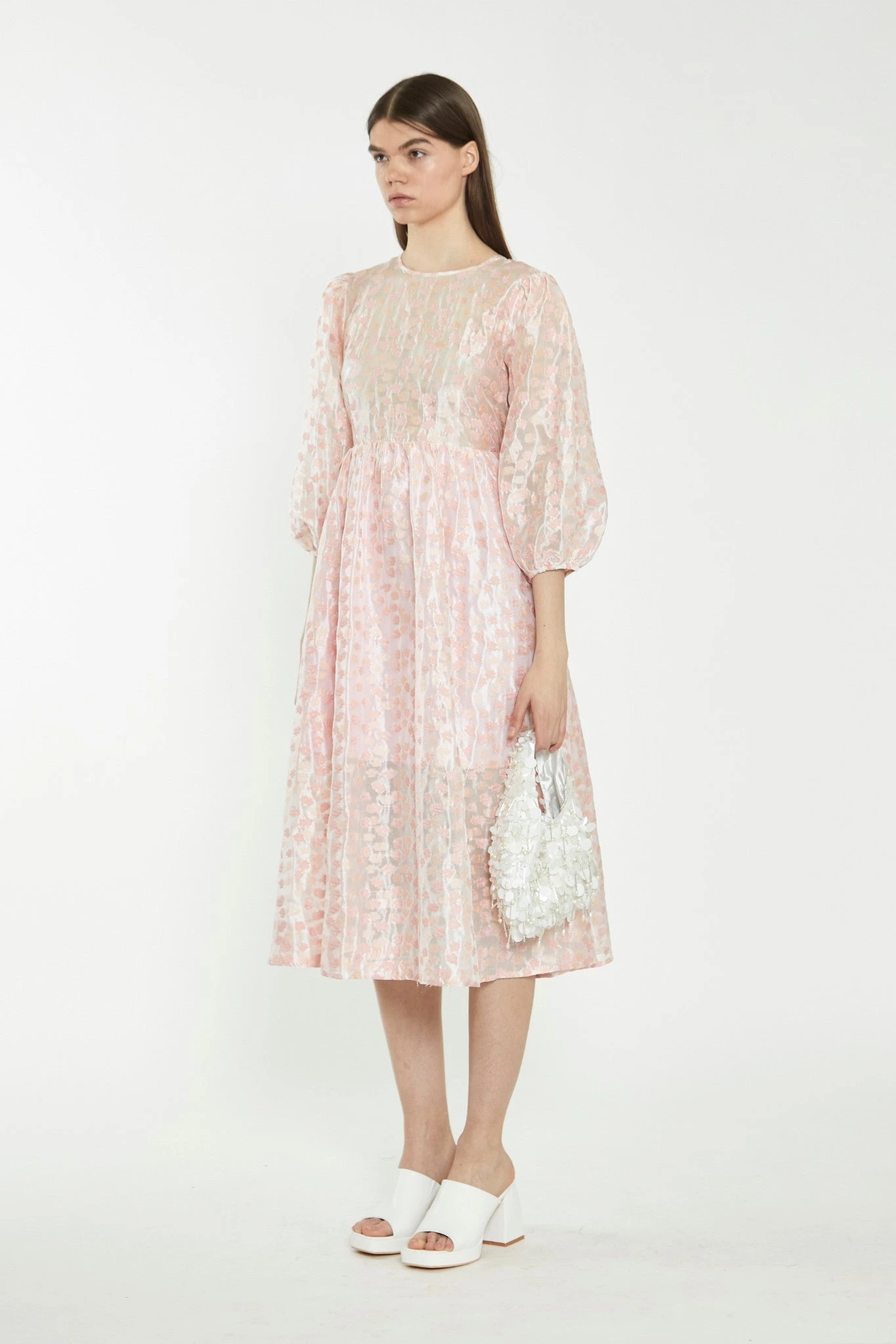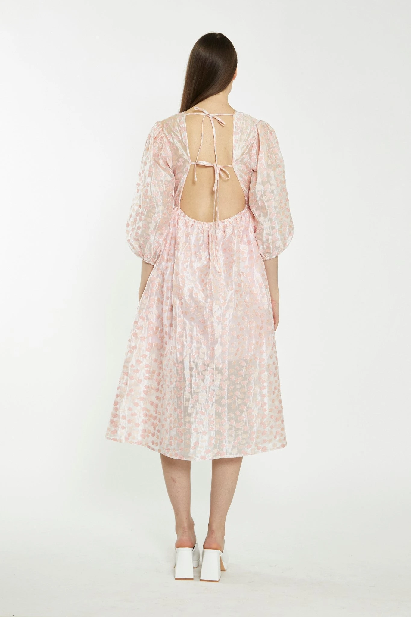 Glamorous Womens Pink Flower Organza Midi Dress. This gorgeous midi dress is an absolute show stopper! Featuring puff sleeves and an open back with tie back detail, you wont regret adding this piece to your wardrobe. Elevate the look with some mule sandals and a mini handbag for an on-trend vibe.Â